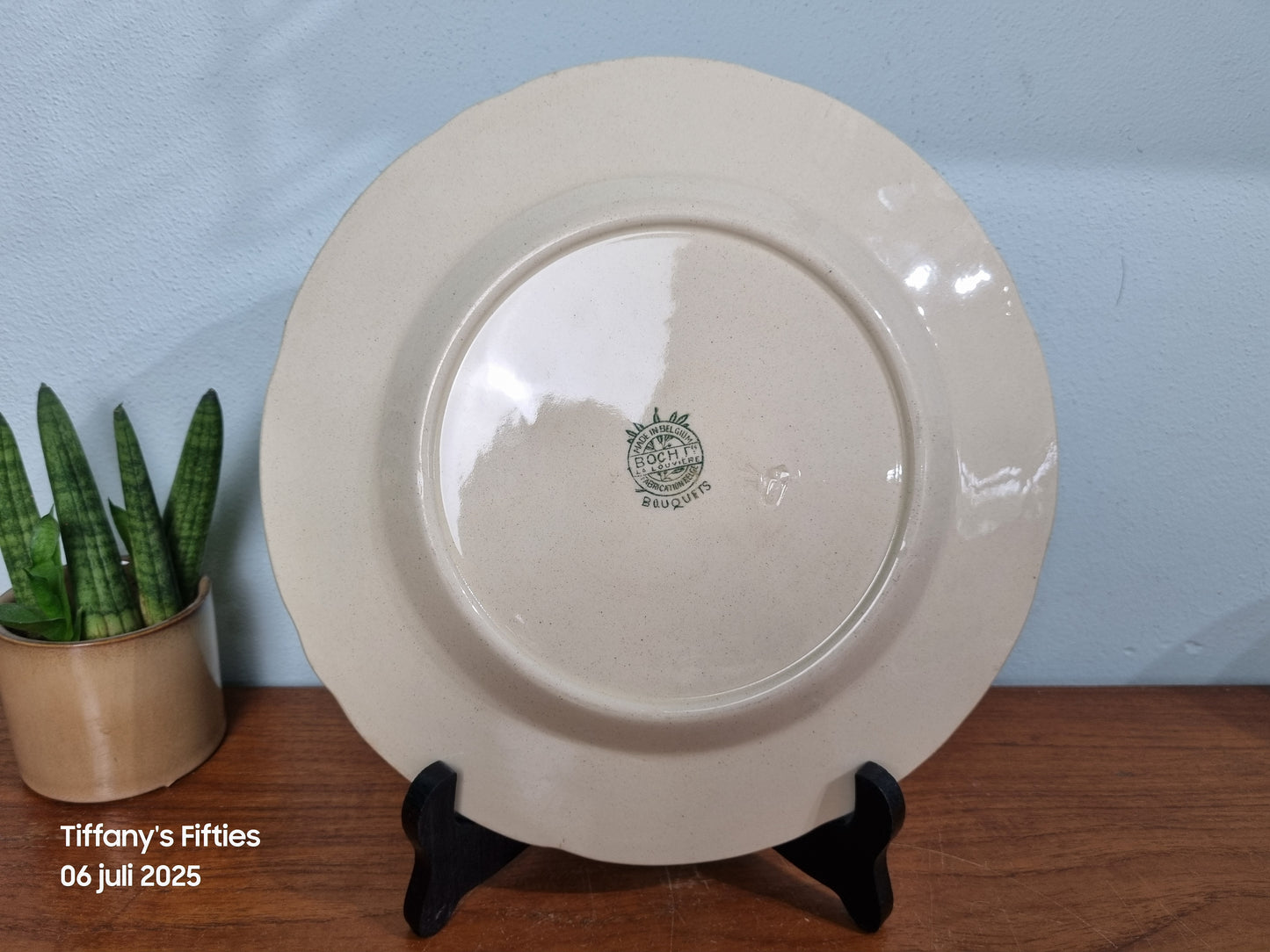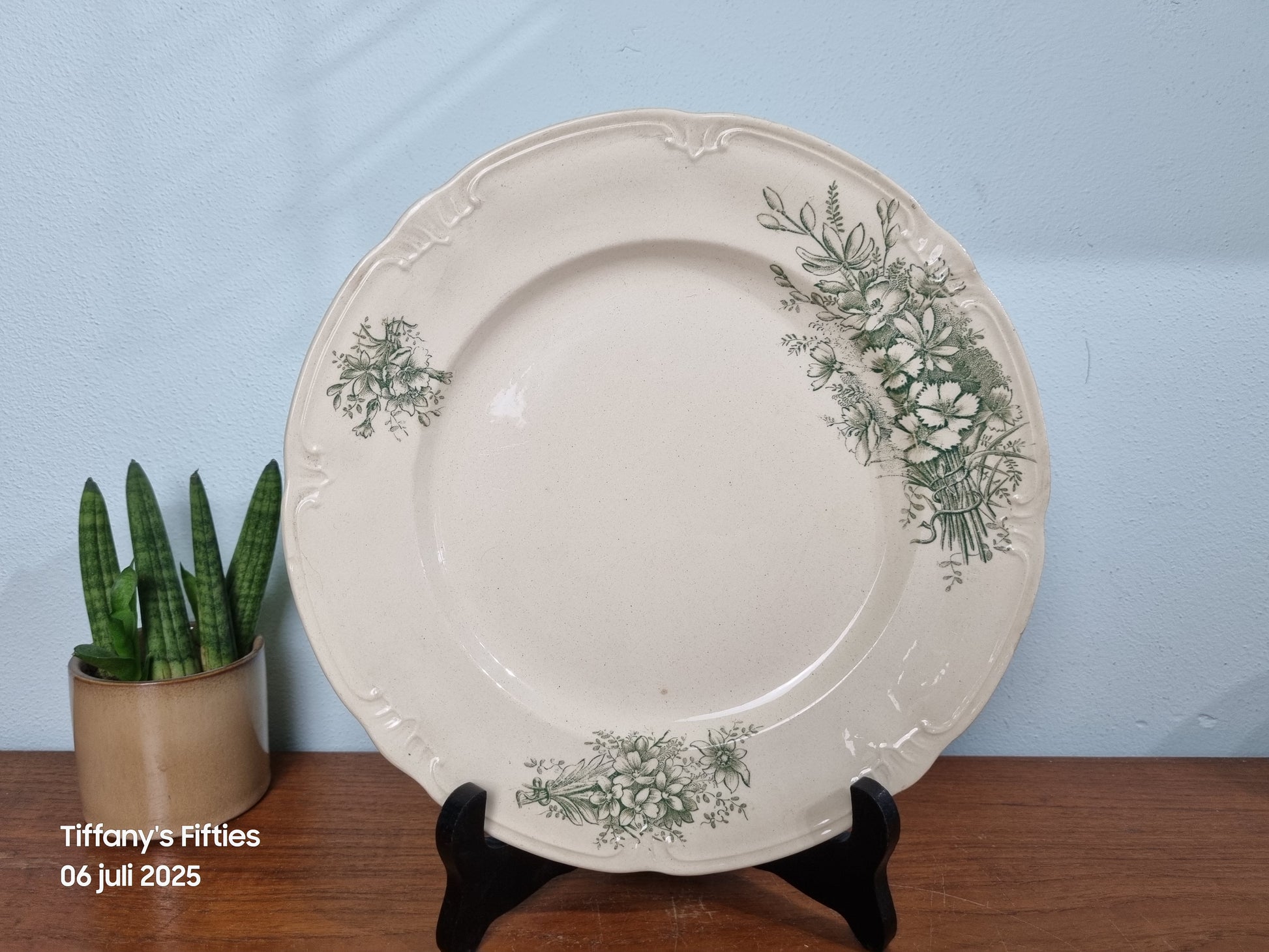 Dit elegante dinerbord van Boch La Louvière draagt het klassieke ‘Bouquets’-decor: een sierlijk veldboeket in zachte groene tinten dat subtiel op drie plaatsen langs de rand is aangebracht. De licht gegolfde rand met reliëfdetails versterkt het romantische karakter van dit Belgische servies, dat dateert uit de jaren ’50-’60.