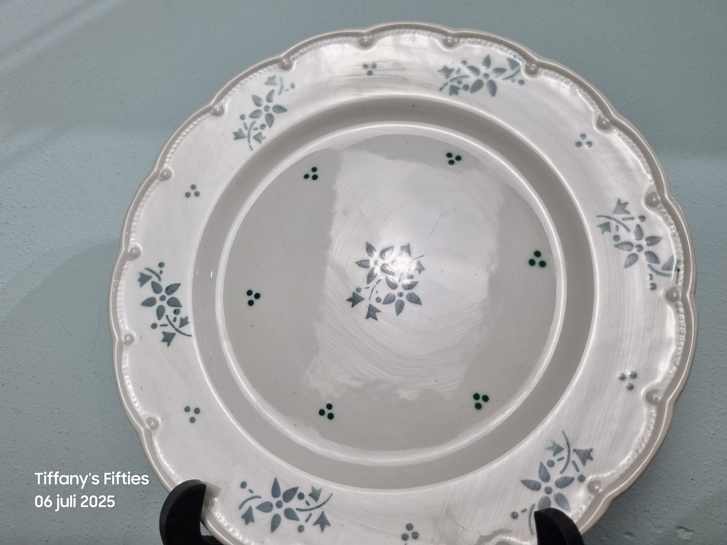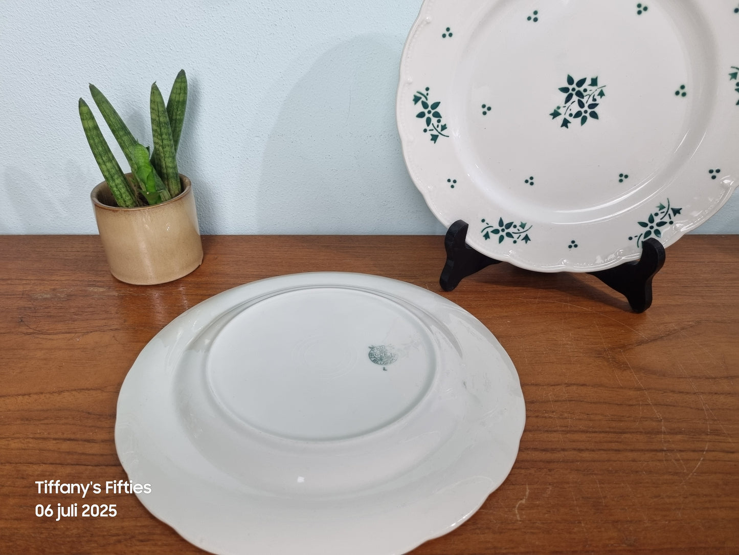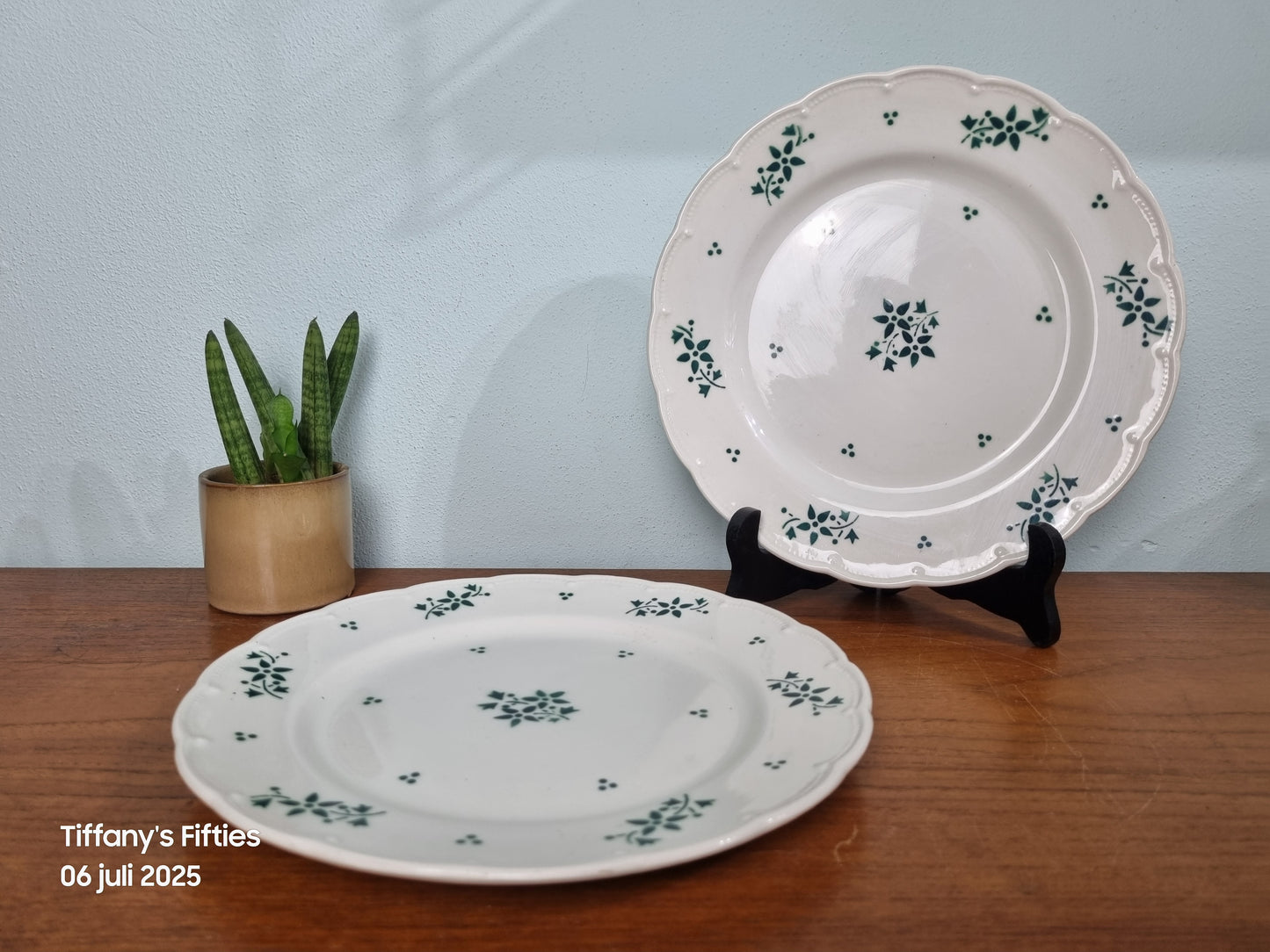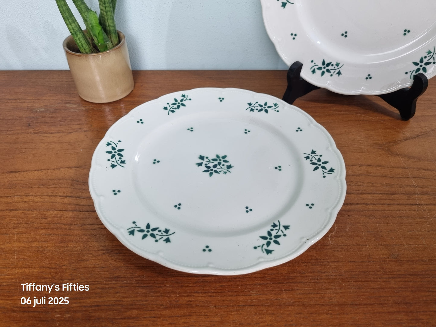 Deze witte borden hebben een verfijnde gegolfde rand en zijn versierd met een groen botanisch motief van blaadjes en besjes dat herhaald wordt rondom het bord en gecentreerd in het midden. De combinatie van het heldere wit met het diepe groen geeft een fris en tijdloos karakter, perfect voor een landelijke of retro gedekte tafel.