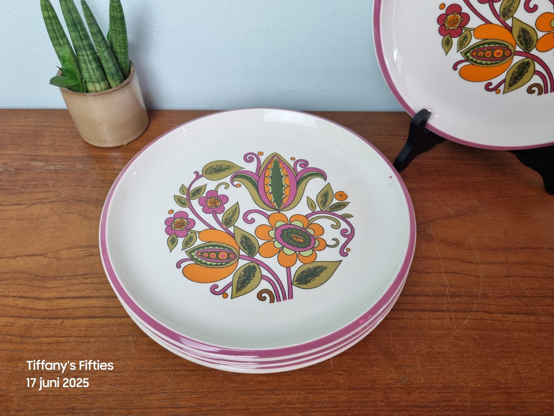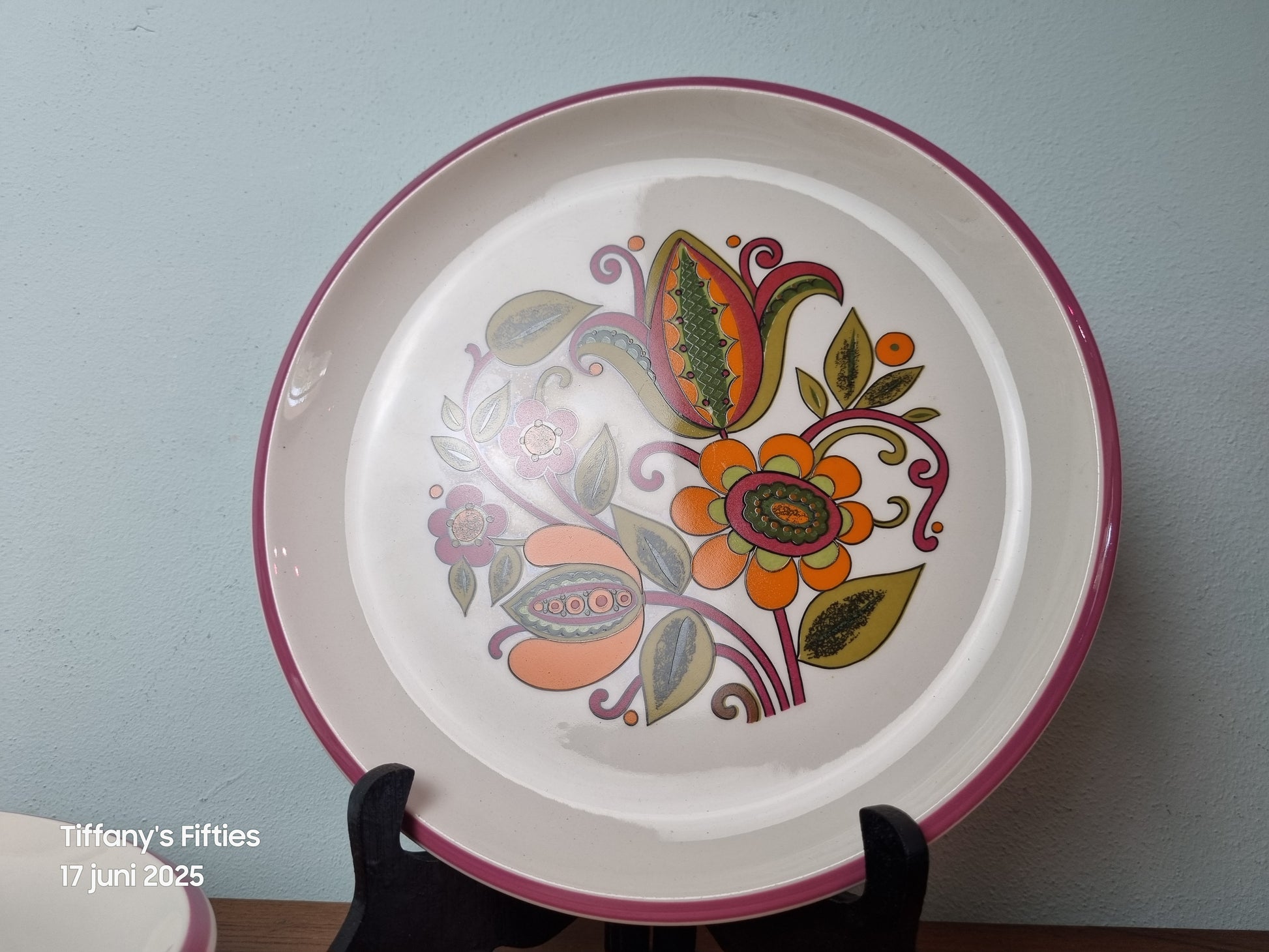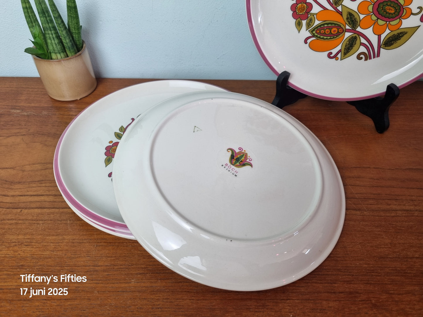 Kleurrijke vintage ontbijtborden van Boch La Louvière met het decor “Bali”, uitgevoerd in een speelse bloemmotief in oranje, roze, groen en geel. De expressieve print is omlijst door een rozerode bies op crèmekleurige ondergrond – een uitgesproken ontwerp uit de jaren ’70 dat meteen de aandacht trekt.