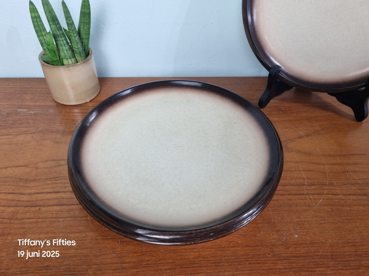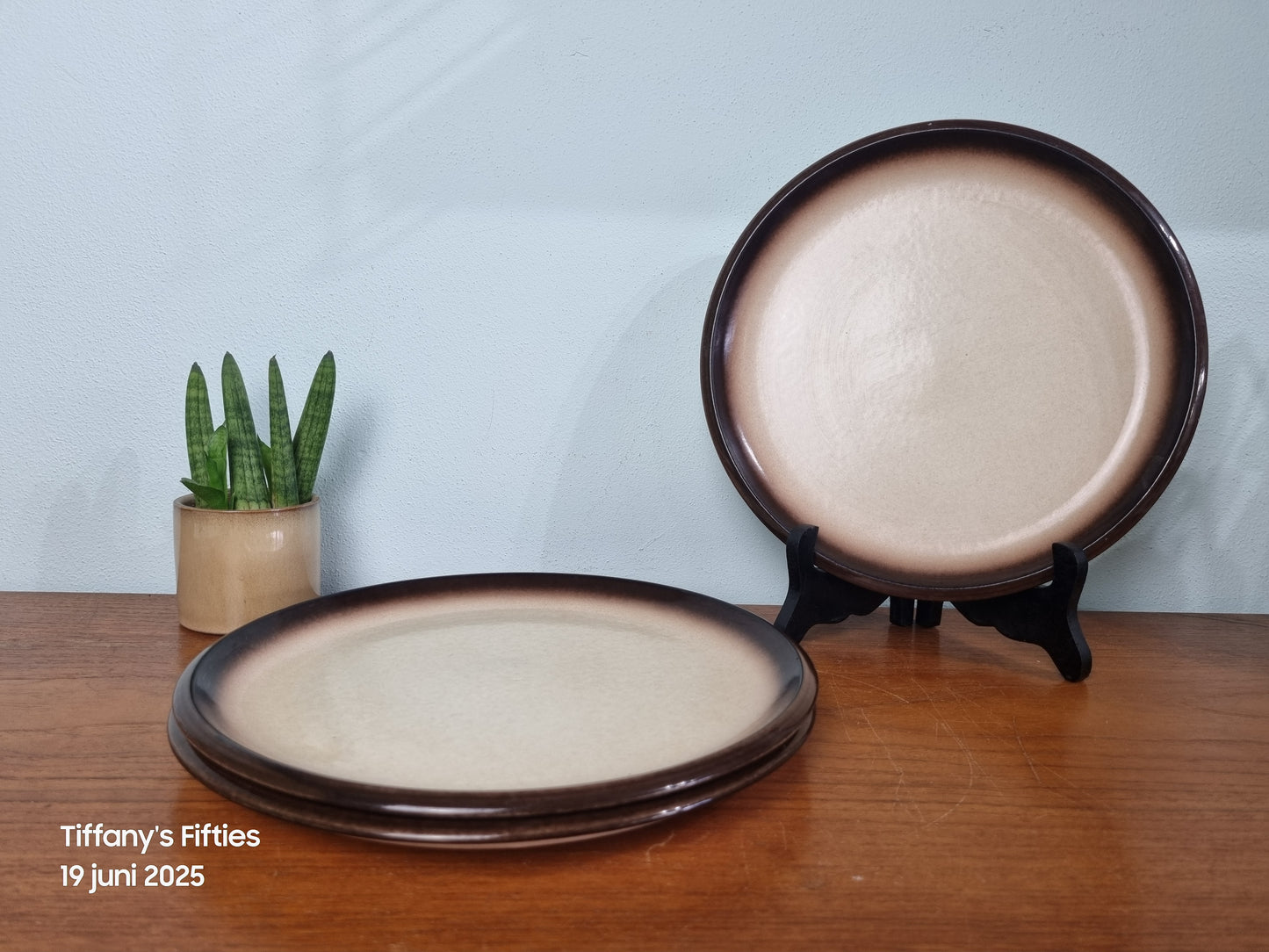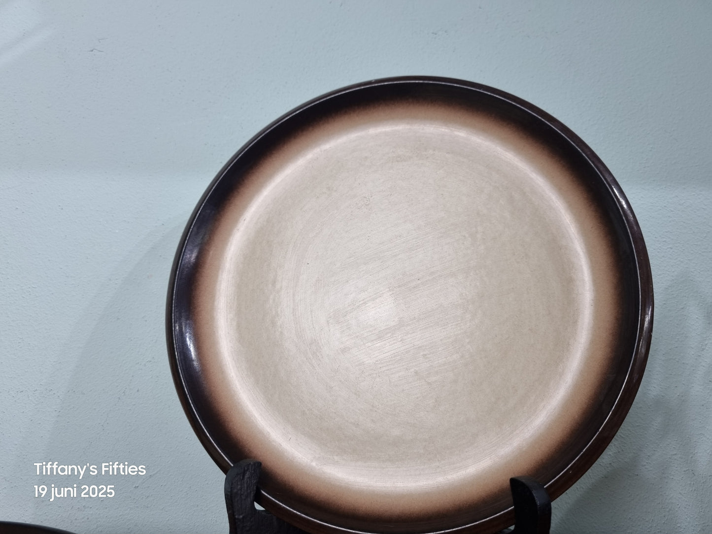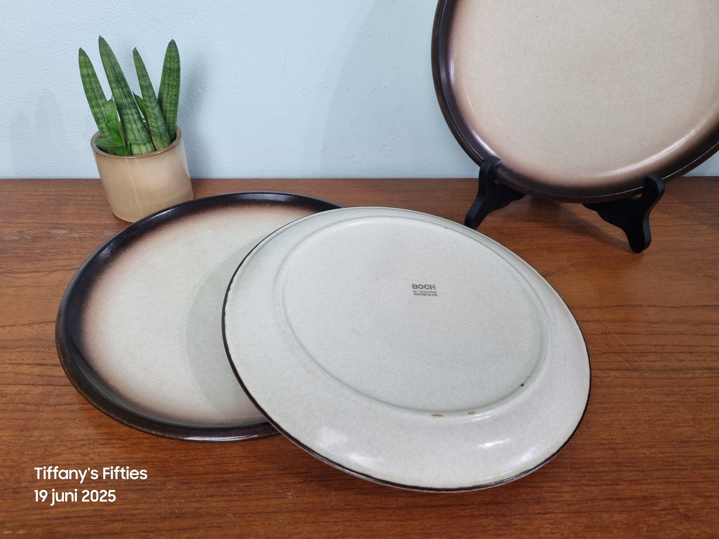 Deze rustieke dinerborden van Boch Belgium zijn uitgevoerd in het ingetogen “Sierra” decor – een tijdloos ontwerp uit de late jaren ’60 waarbij het glazuur subtiel verloopt van zacht zandbeige naar een diepe chocoladebruine rand. Het ombré-effect geeft elk bord een warme, aardse uitstraling die moeiteloos past in zowel een retro als een hedendaagse tafelschikking.