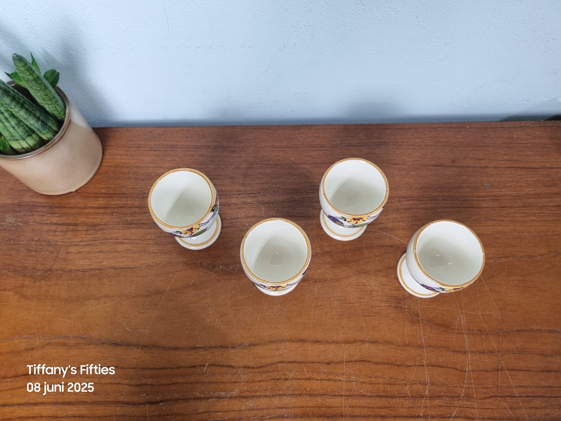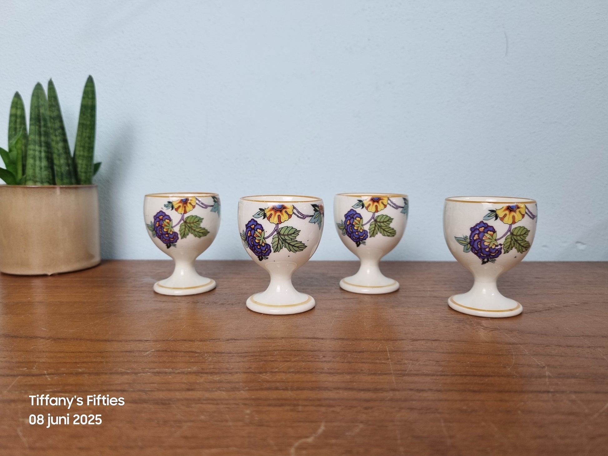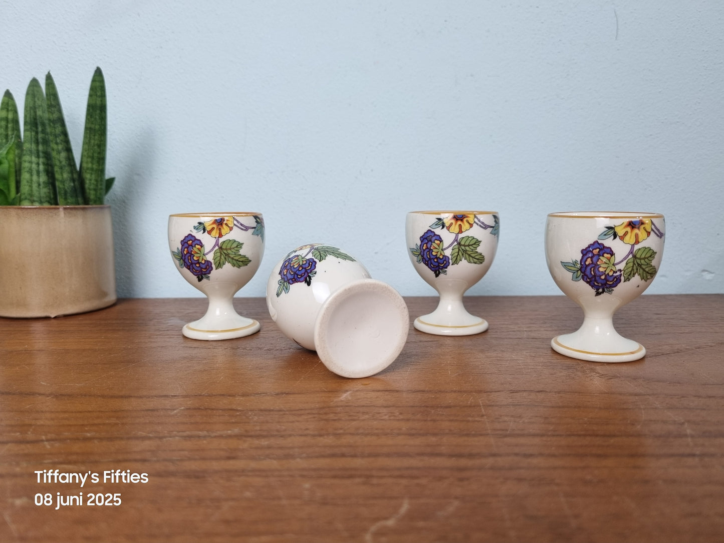 Vintage eierdopjes met bloemenmotief van Zijlstra. Deze keramieken eierdopjes hebben een klassiek voetje en zijn versierd met kleurrijke bloemen in paars, geel en groen. De randjes zijn afgewerkt met een goudkleurig accent.