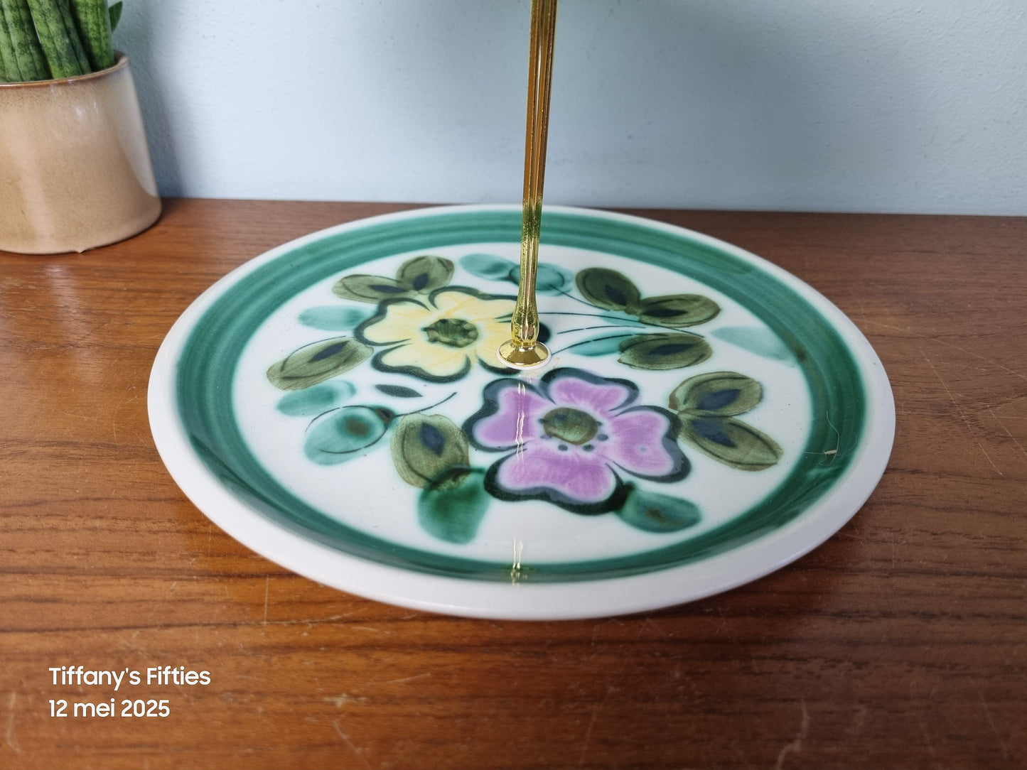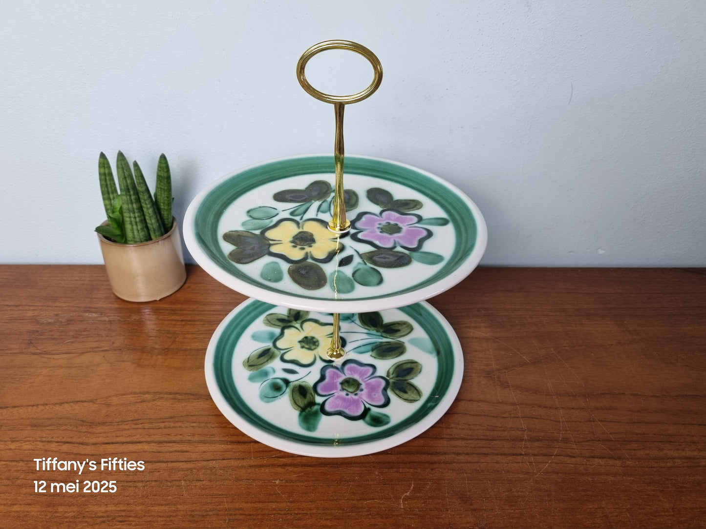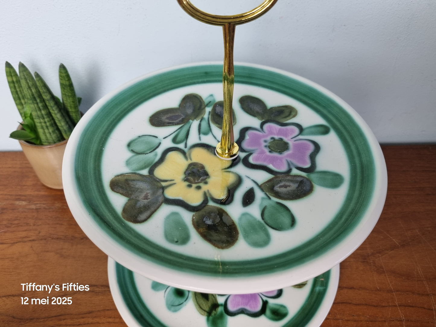 Vrolijke etagere van Boch La Louviere uit de reeks Menuet, met kleurrijke print van groen met roze en gele bloemen, decor In the Mood. In mooie staat. Diameter borden 20 cm.