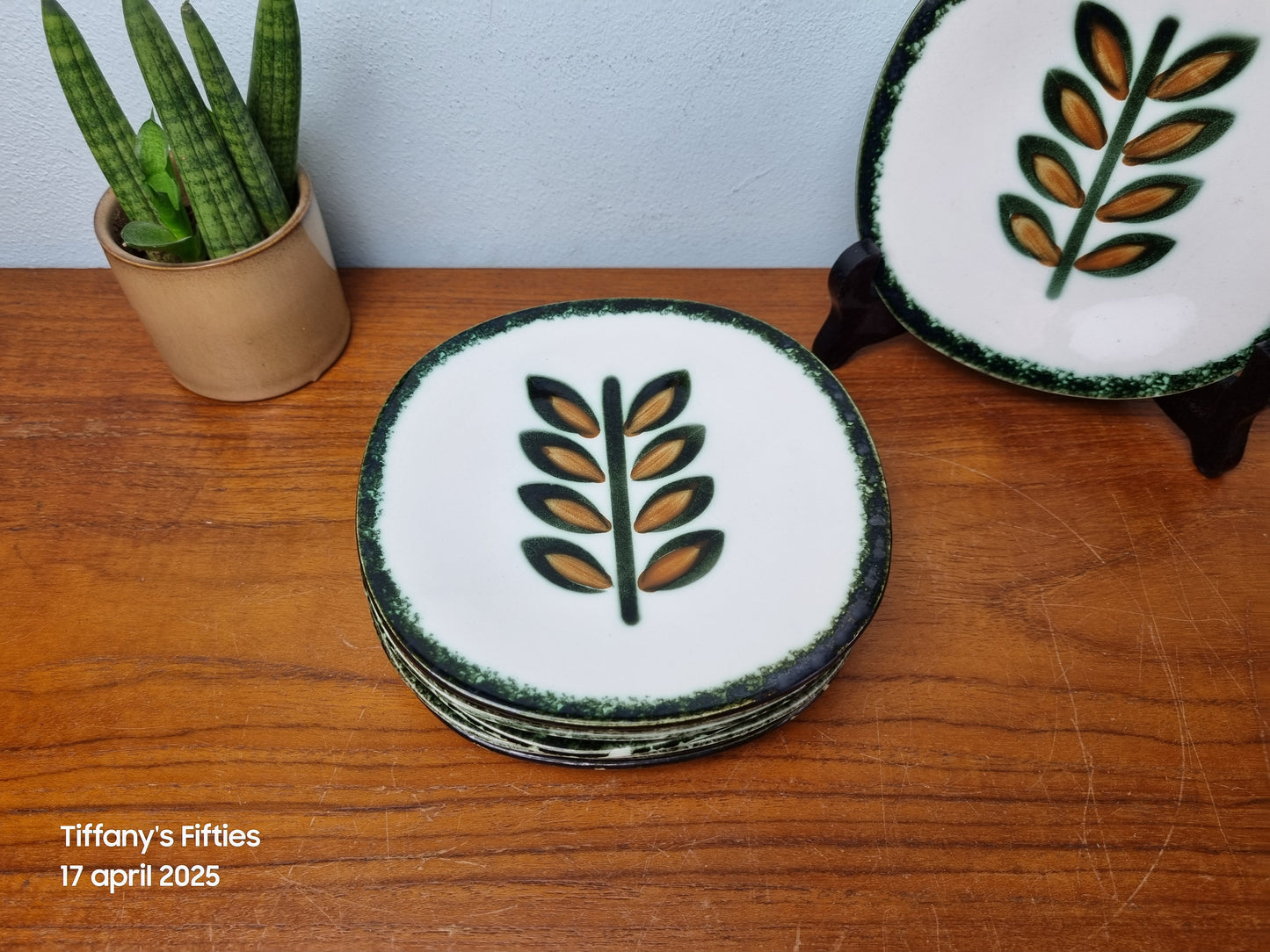 Karaktervolle vintage gebaksbordjes van Boch La Louvière, afkomstig uit de bekende Delta-reeks (1966), met het handgeschilderde decor Rambouillet. De bordjes hebben een organisch vierkant model in crème keramiek met een opvallend retro bladmotief in bruin en zwart, omlijst door een expressieve gespikkelde rand.