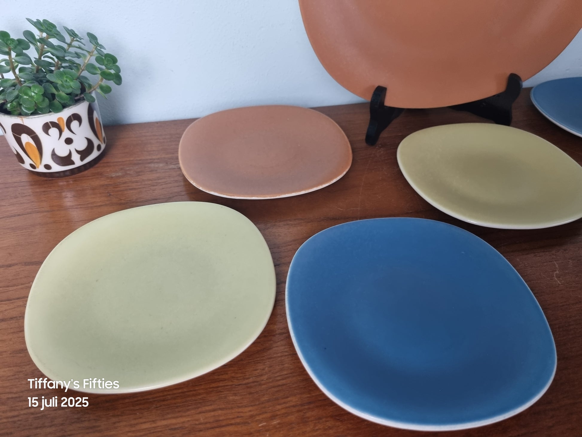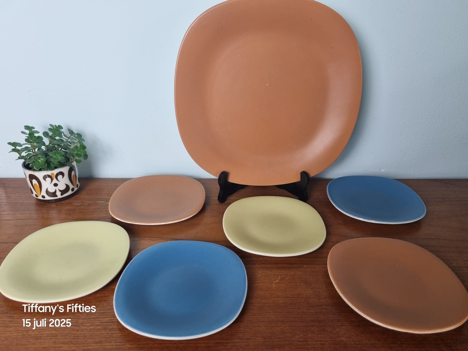 Deze charmante set retro gebaksbordjes en serveerschaal van Boch La Louvière straalt pure jaren ’50 elegantie uit. Uitgevoerd in zachte matte kleuren als terracotta, okergeel en hemelsblauw, met een speels afgeronde vierkante vorm die typerend is voor het modernistisch design van de Belgische keramiekproducent.