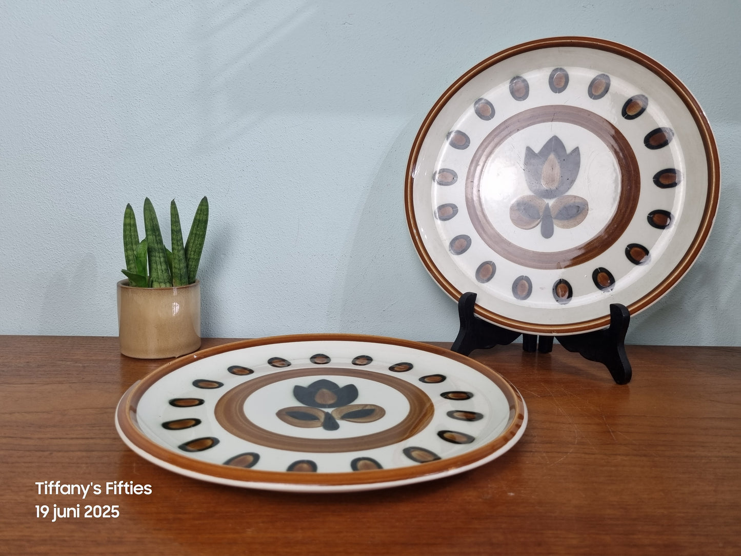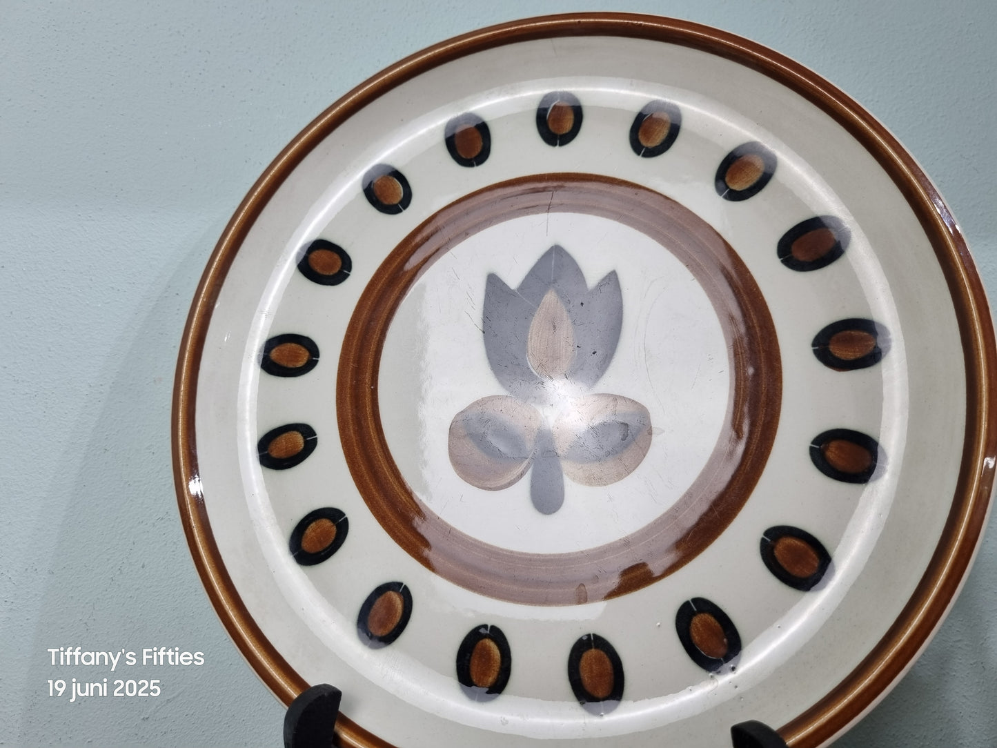 Deze bijzondere borden van Boch Frères La Louvière zijn uitgevoerd in het decor “Kimono” – een elegant ontwerp uit de jaren ’60 met duidelijke invloeden uit oosterse motieven en kleuren. De gestileerde bloem in het midden wordt omlijst door een speels ritme van penseelgestipte ovaaltjes, met de hand aangebracht in diepe aardetinten van zwart, roestbruin en beige op een crèmekleurig fond.