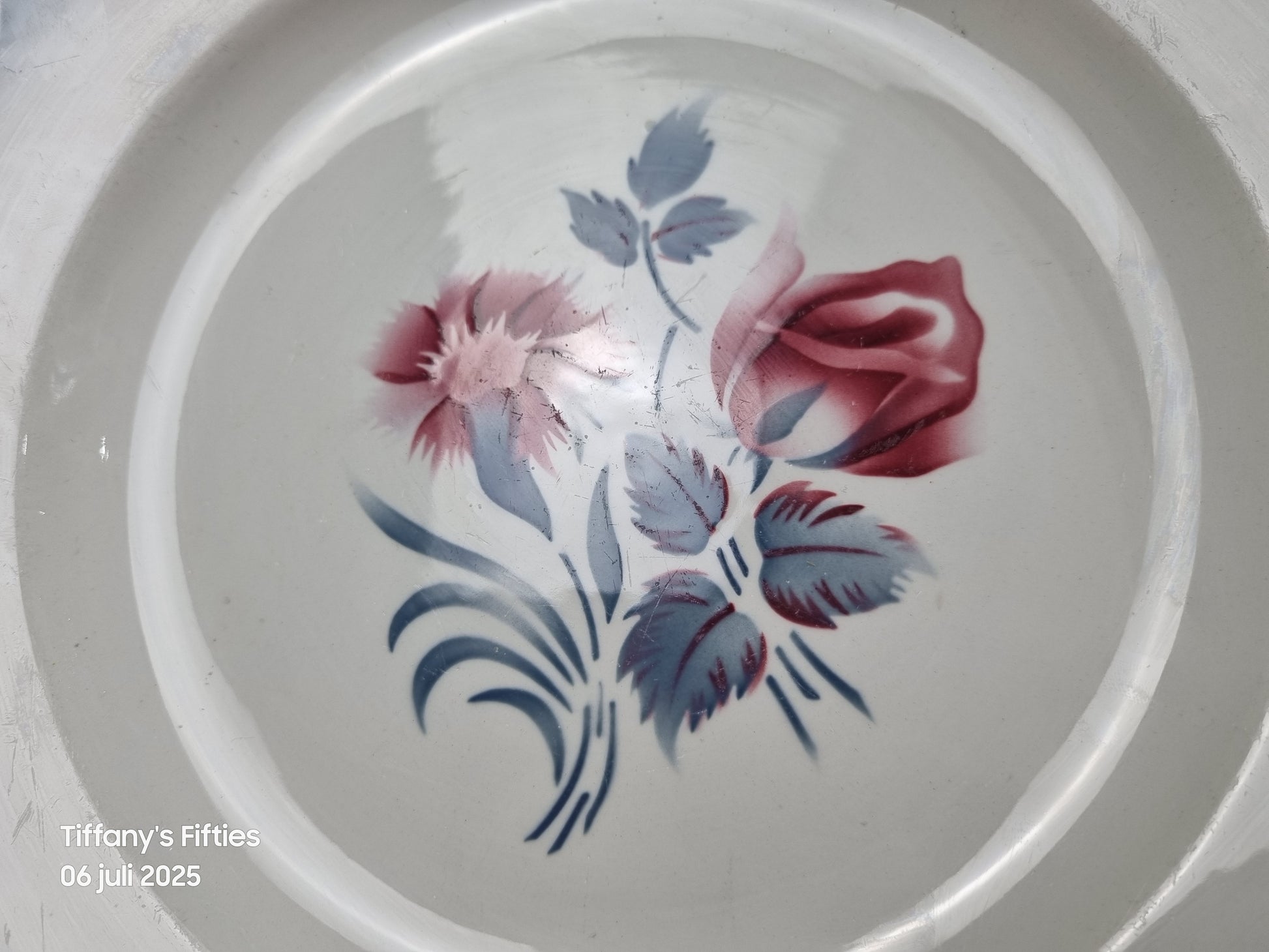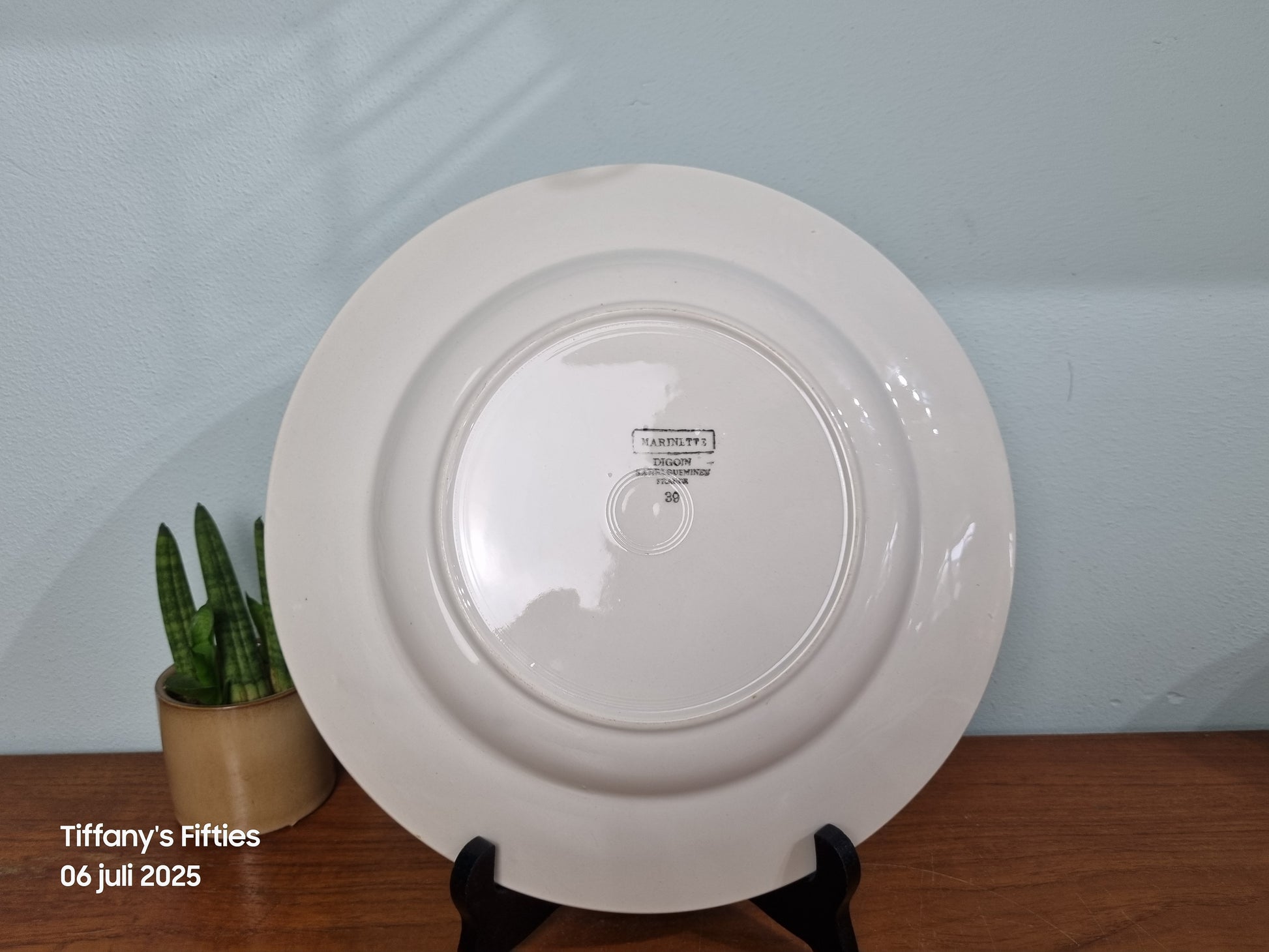 Dit vrolijke bord van Digoin Sarreguemines brengen Franse charme naar je tafel. Het bloemendecor in roze, blauw en bordeaux is met de hand gesjabloneerd en vormt samen met de golvende blauwe rand een typisch voorbeeld van servies uit de jaren ’40-’50. De retro uitstraling wordt versterkt door het robuuste keramiek en het contrastrijke kleurgebruik.