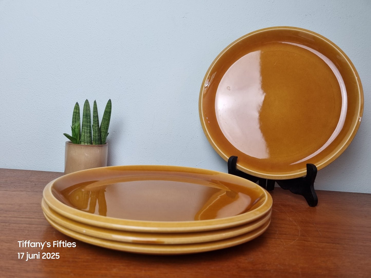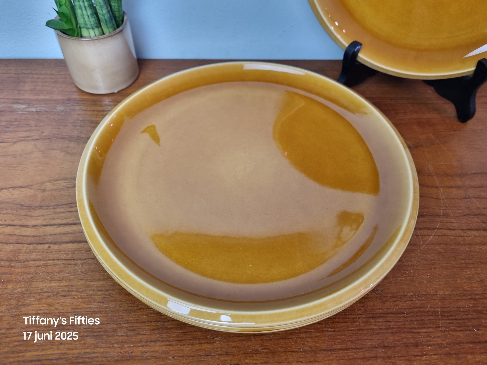Effen vintage platte borden van Boch La Louvière in een effen mosterdgeel glazuur, behorend tot het “Soleil” servies. Tijdloos van vorm en kleur, perfect te combineren met gedecoreerde varianten of als rustige basis in een retro tafelschikking.
