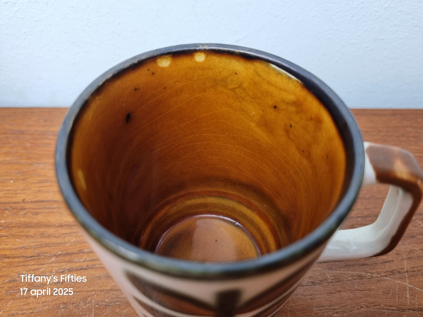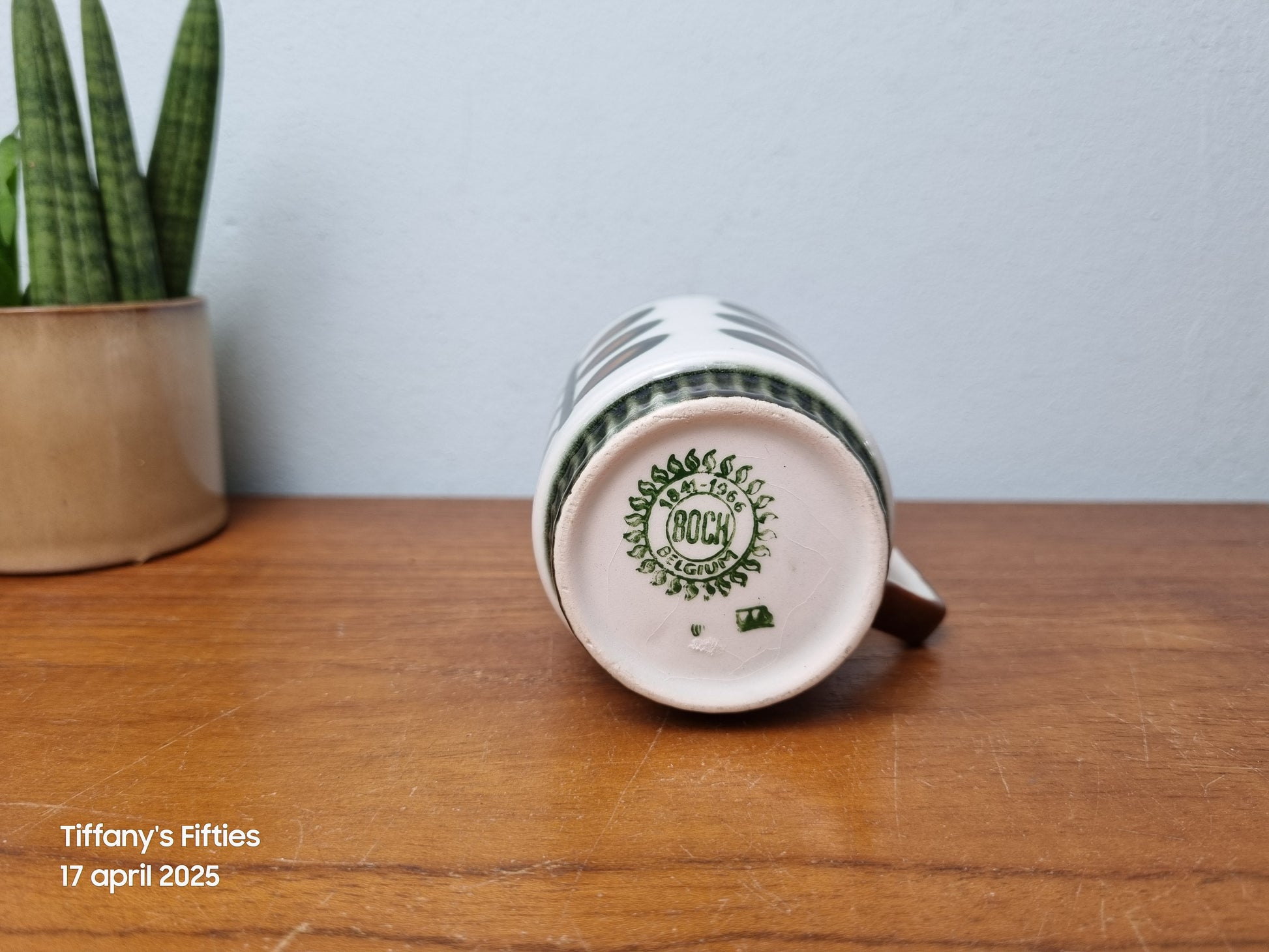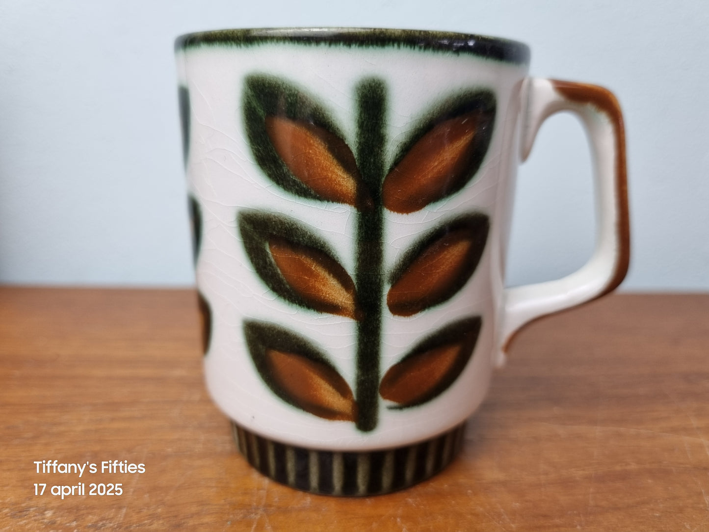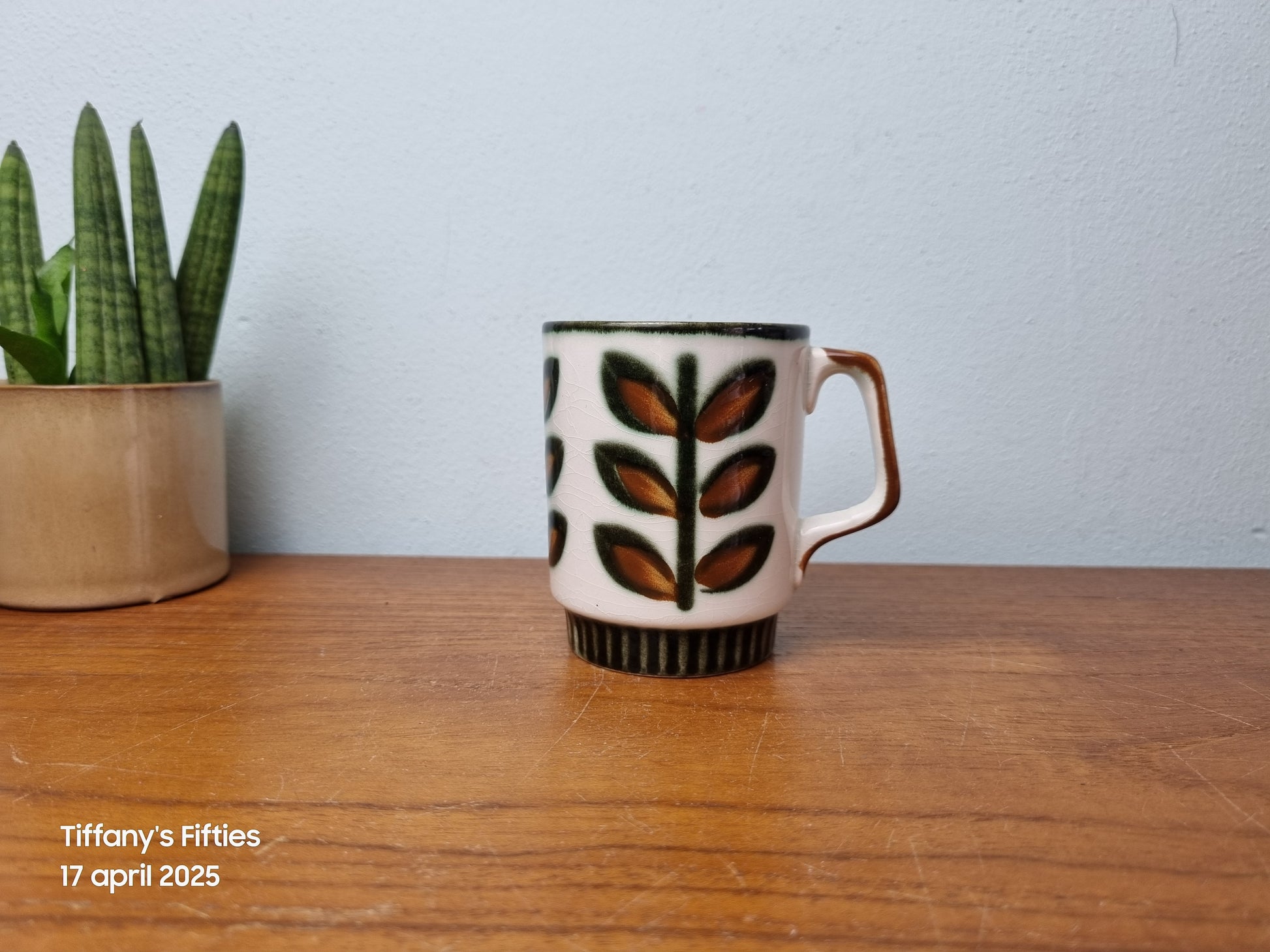 Vintage theekopje van Rambouillet met handgeschilderde blaadjes uit de reeks Delta van 1966, uitgegeven voor het 125 jarig bestaan van Boch La Louviere. Er is craquelee zichtbaar in het emaille. Diameter 6.5 cm, hoogte 8 cm.