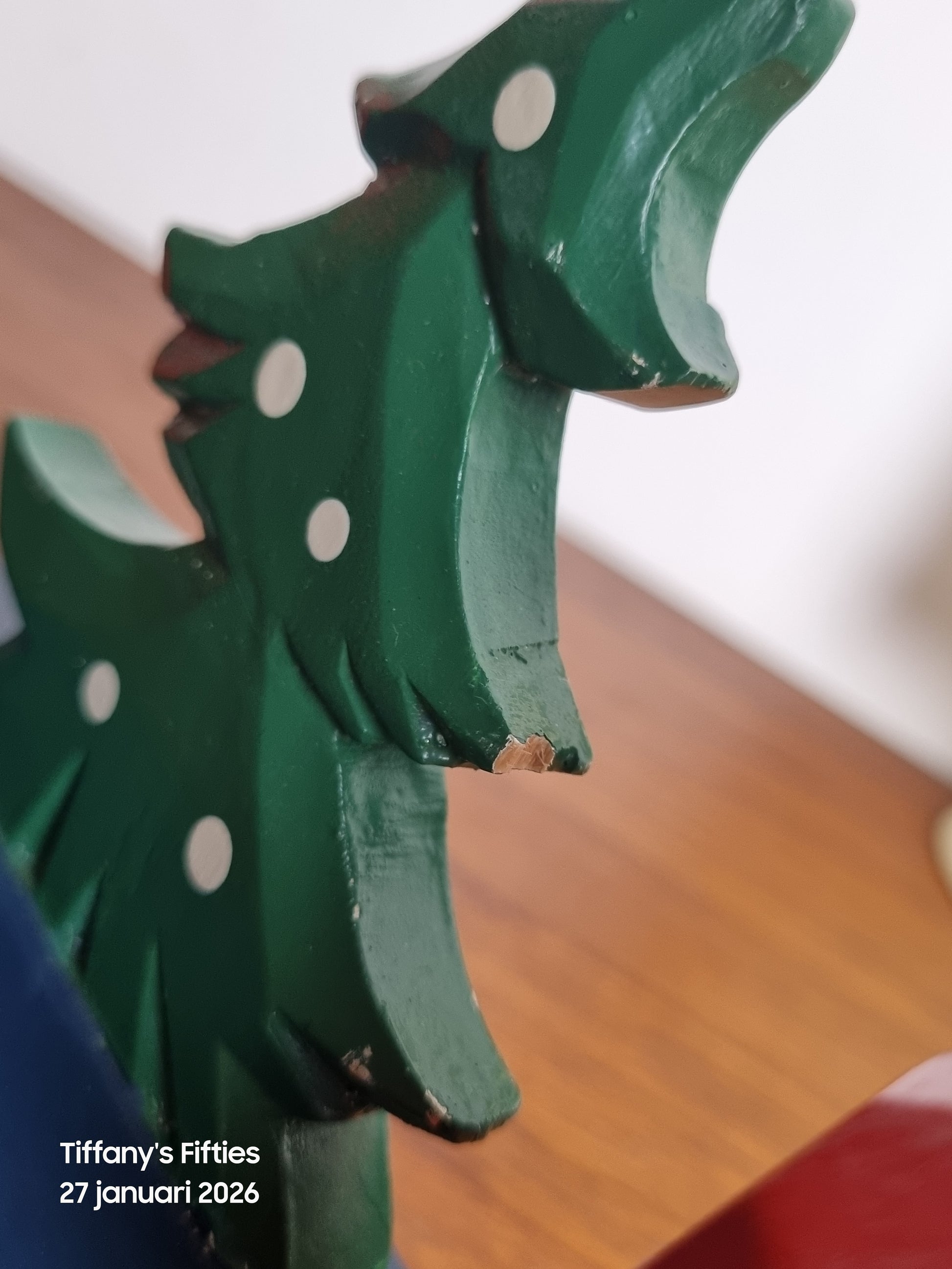 Goede vintage staat. Lichte gebruiks- en verfslijtage zichtbaar, passend bij de leeftijd en het handgemaakte karakter. Een klein hoekje af aan het middelste deel van de boom.