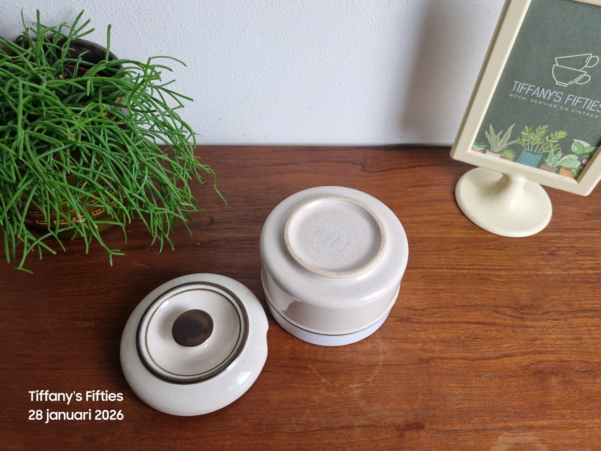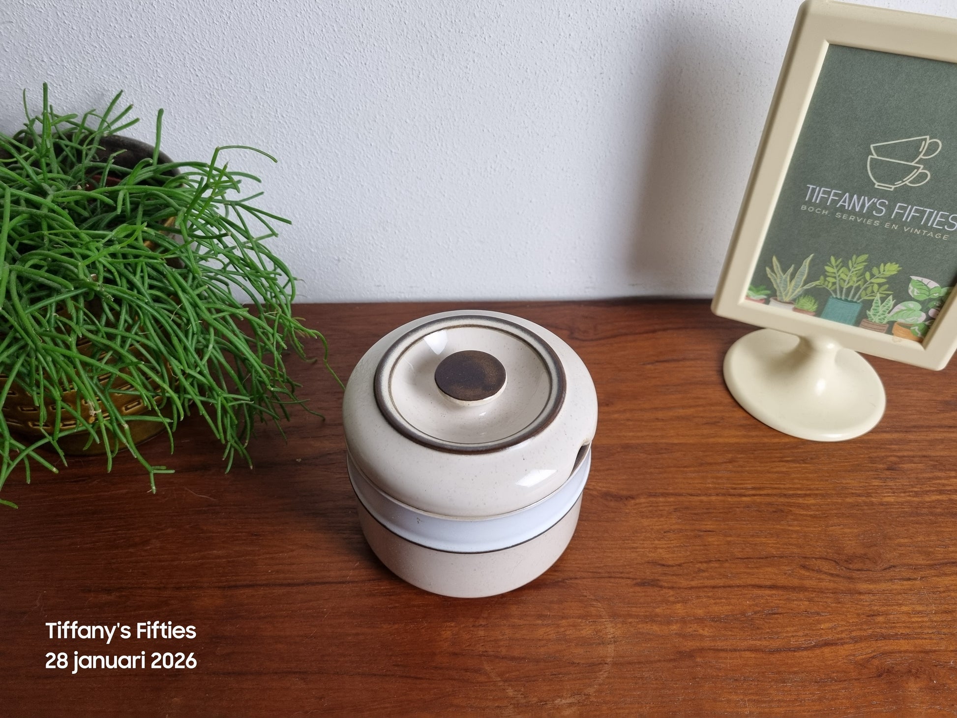 Dekselpotje in sober en stevig Engels aardewerk, in zacht beige met een witte band en fijne donkerdere randaccenten. Het eenvoudige, functionele ontwerp en het matte glazuur zijn typerend voor Brits servies uit de jaren 60–70, met duidelijke invloeden van studio pottery en utilitair design. De suikerpot is gemerkt, maar het merkje is onleesbaar.
