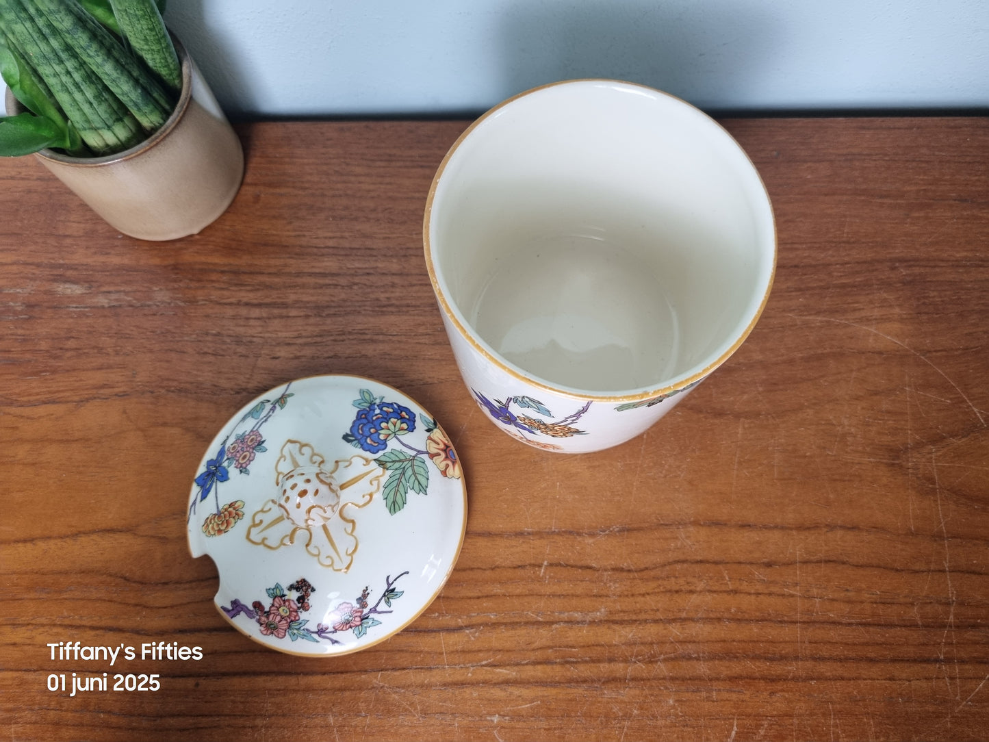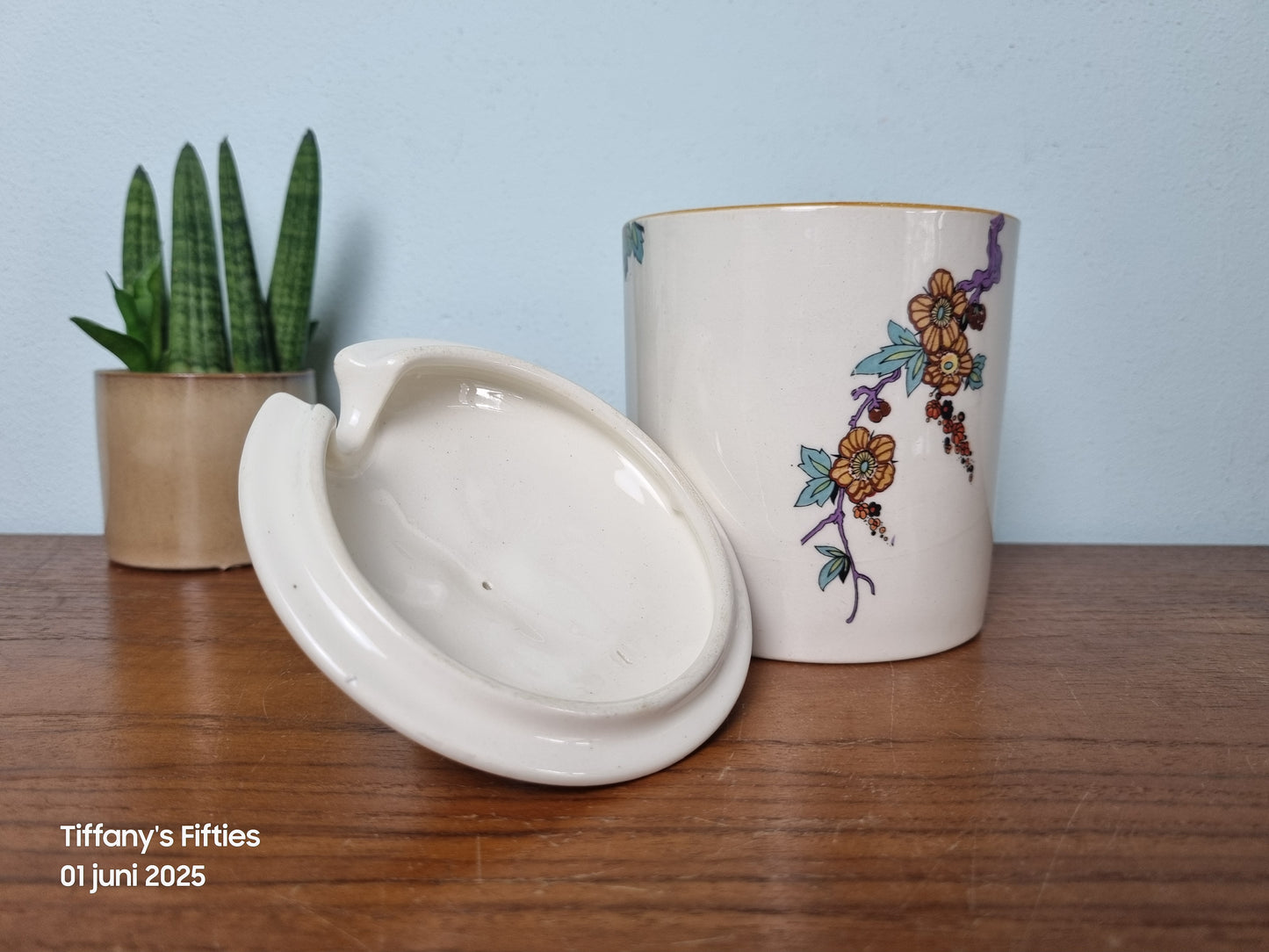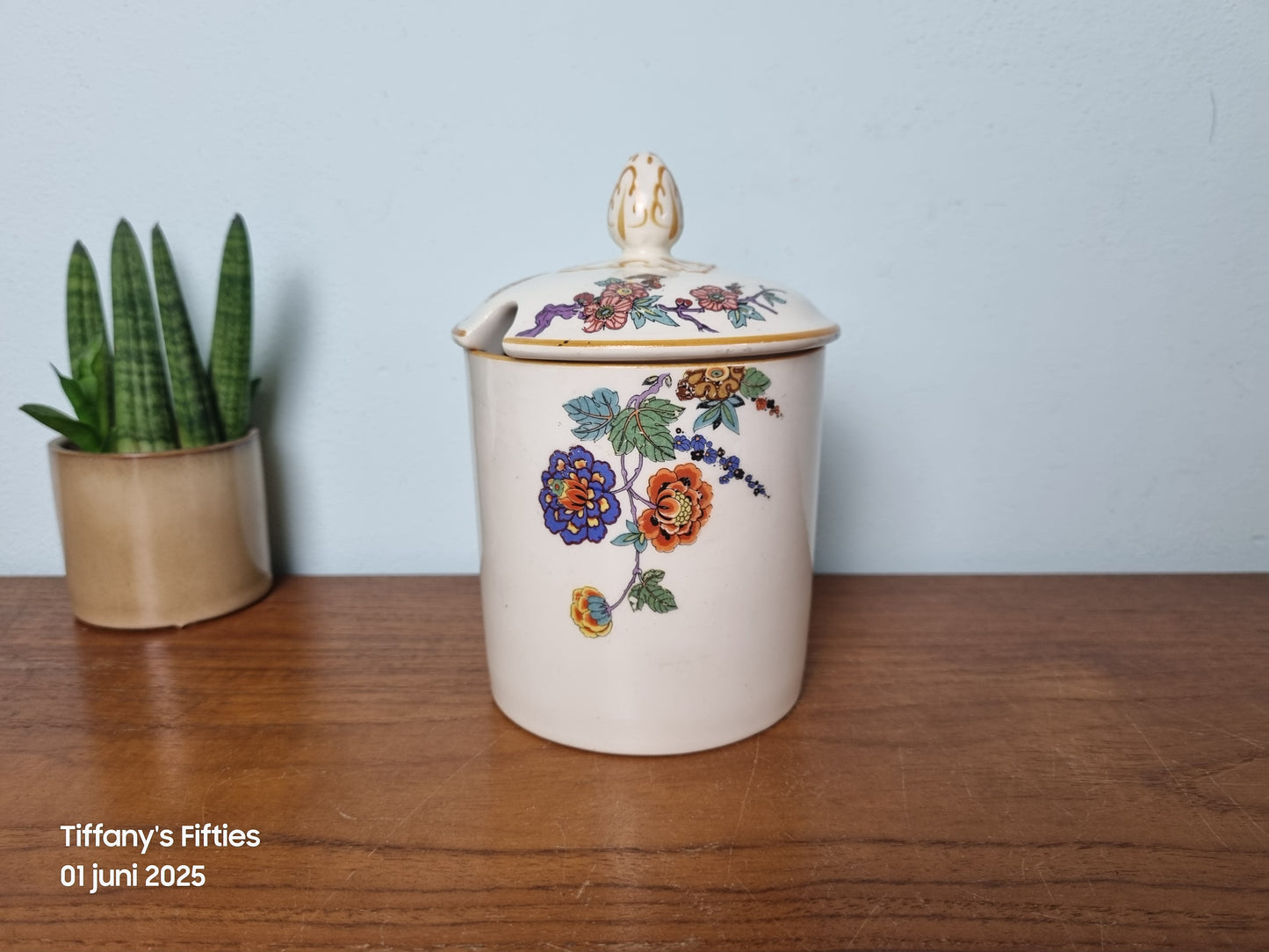 Sfeervolle vintage keramieken kandijpot van Zijlstra Holland met sierlijk bloemenmotief in warme tinten oranje, paars en blauw. De pot is afgewerkt met een goudkleurige rand en heeft een bijpassend deksel met een decoratieve knop. De uitsparing in het deksel suggereert dat de pot oorspronkelijk bedoeld is voor suiker met een lepeltje. Het servies kon vroeger bijeengespaard worden met zegeltjes door voormalig kruidenier Zijlstra.