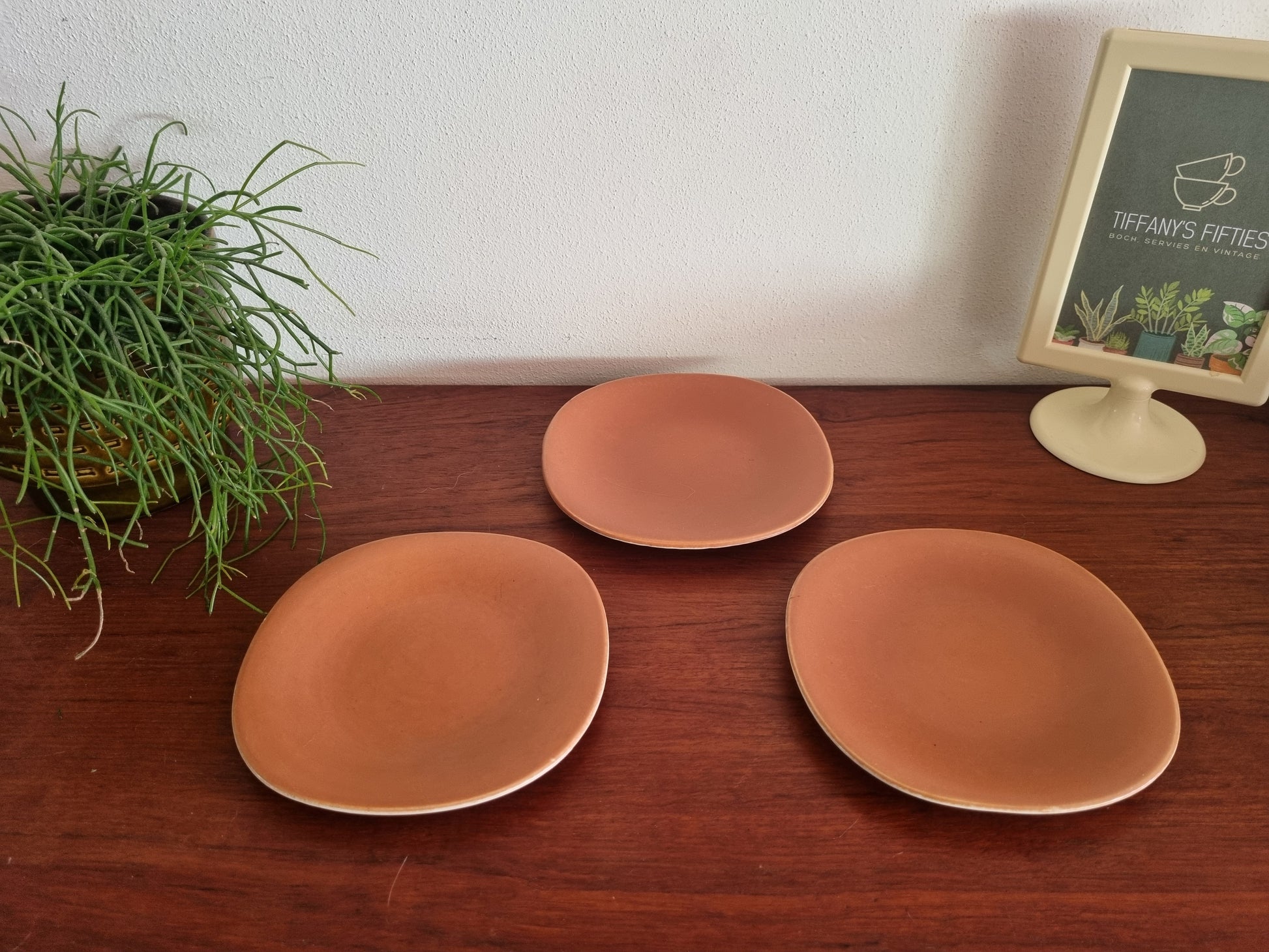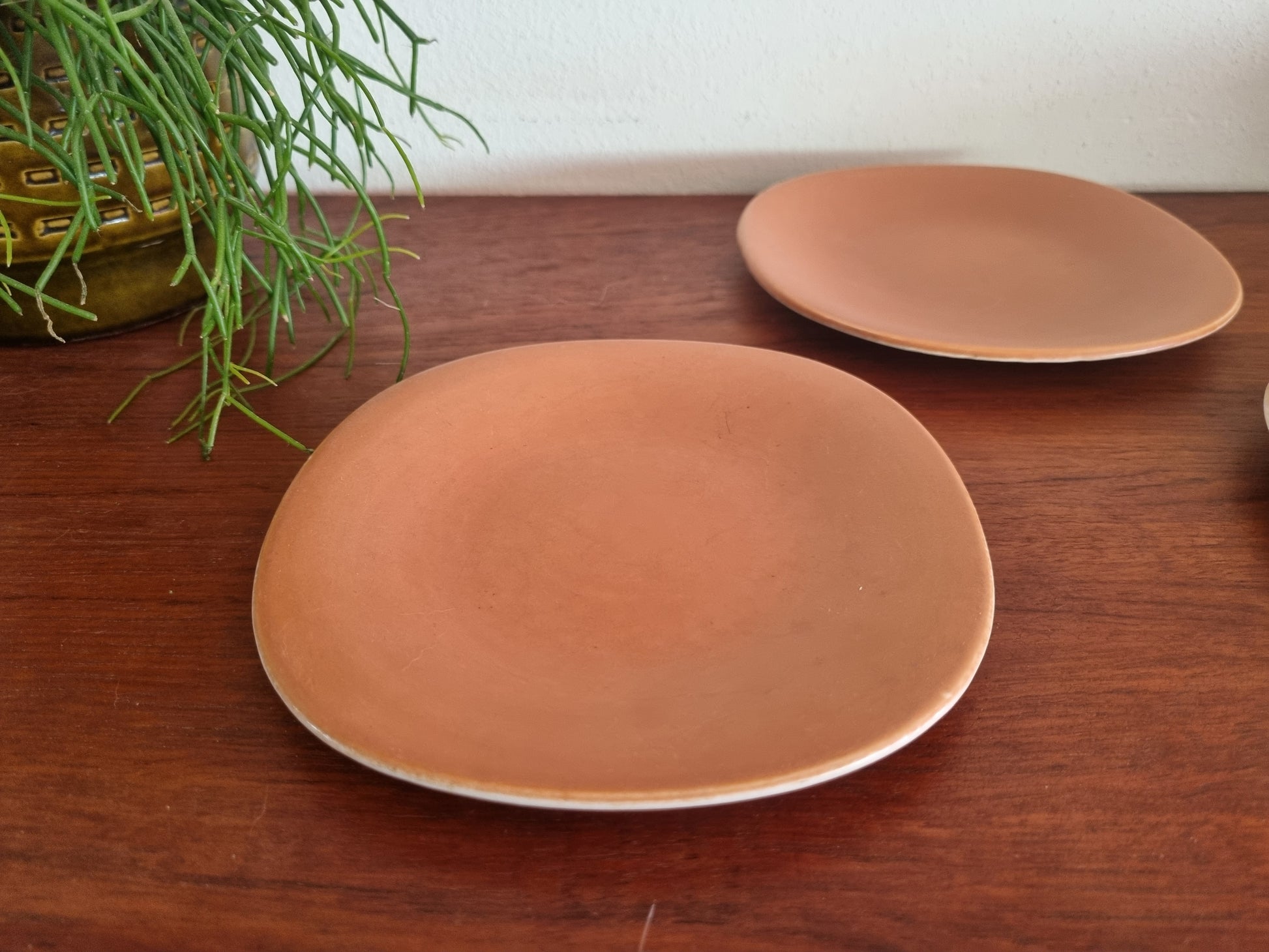 Gebaks- of onderbordjes van Boch La Louvière, onderdeel van het servies 1965 of Service à Cake, in de kleur oker. Gemaakt uit fijn aardewerk met een matte satijnafwerking en afgeronde organische vorm. Deze okerkleurige stukken werden ontworpen om te combineren met de zandkleurige varianten uit dezelfde reeks of in combinatie met andere kleuren om het gebaksservies compleet te maken.