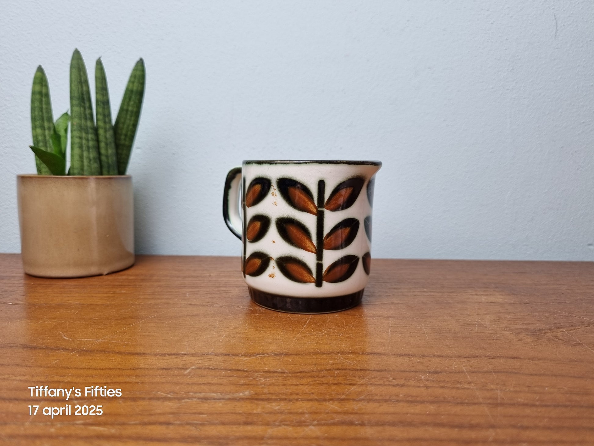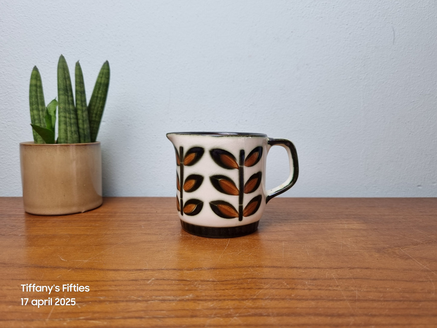 Melkkannetje maat 0, wat zeldzamer formaatje, van Boch uit de reeks Delta uit 1966 decor Rambouillet, met handgeschilderde blaadjes. Er is wat craquelee zichtbaar in het emaille. Diamter 7 cm, hoogte 8 cm.