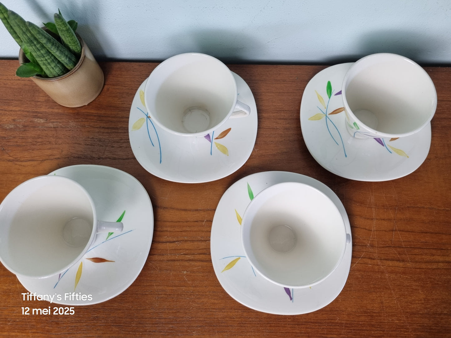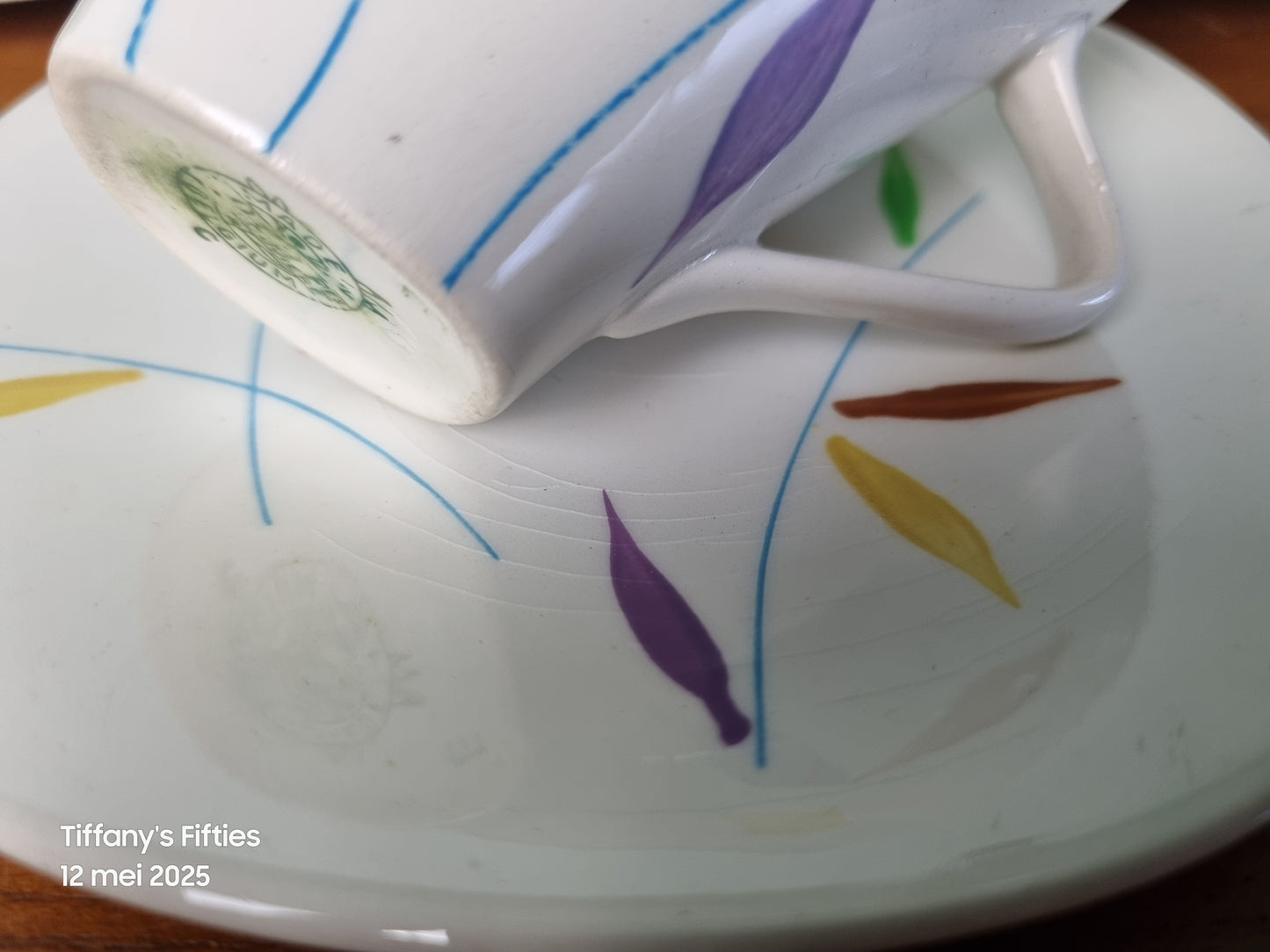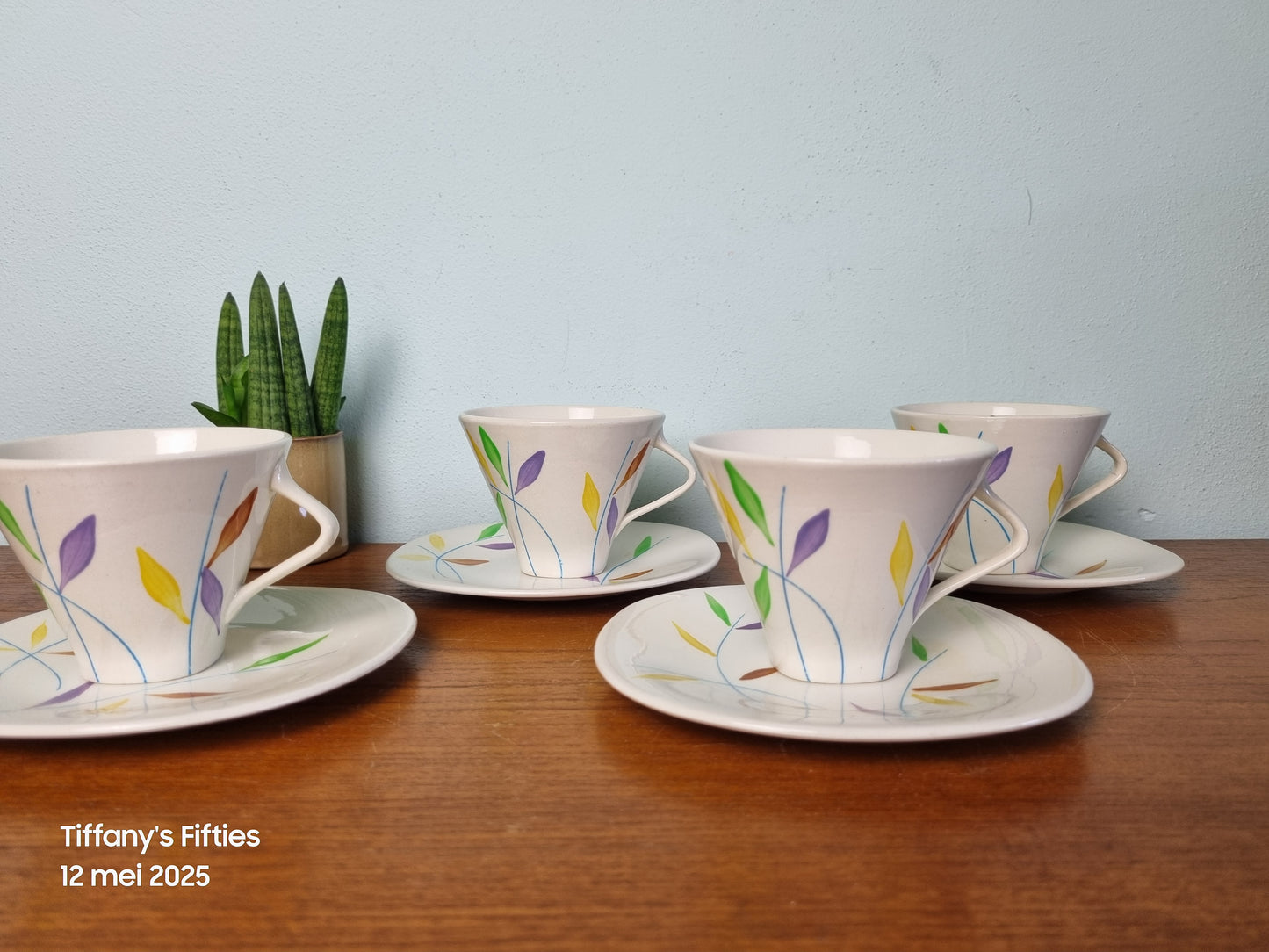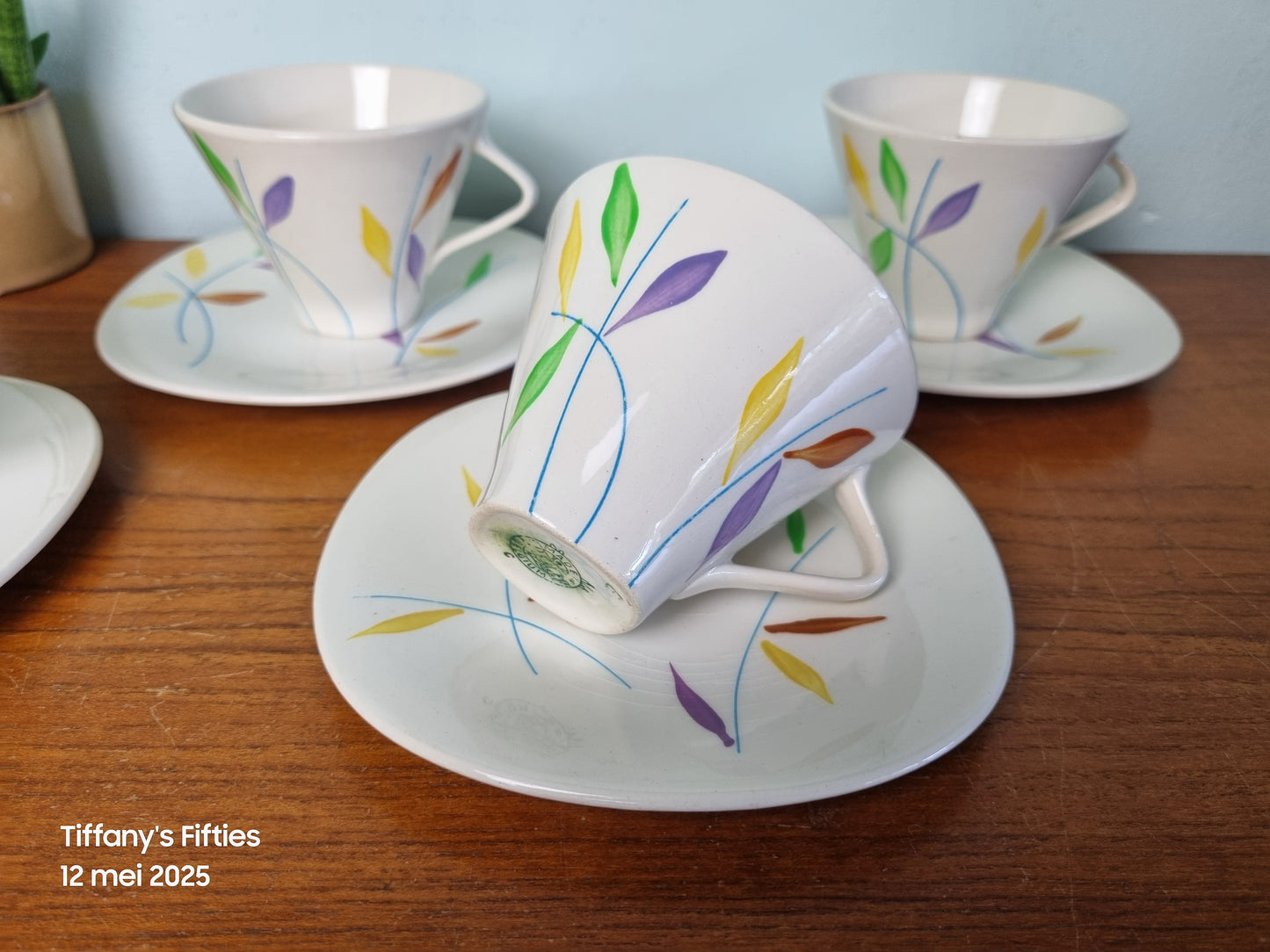 Stijlvolle vintage koffiekopjes met bijpassende schotels in keramiek van Boch La Louviere uit de reeks Seduction. De kopjes hebben een elegante conische vorm en zijn versierd met een kleurrijk bladmotief in paars, geel, groen en oranje genaamd Pigo. De vloeiende lijnen en levendige kleuren geven dit servies een speelse, karaktervolle jaren ’50 uitstraling.