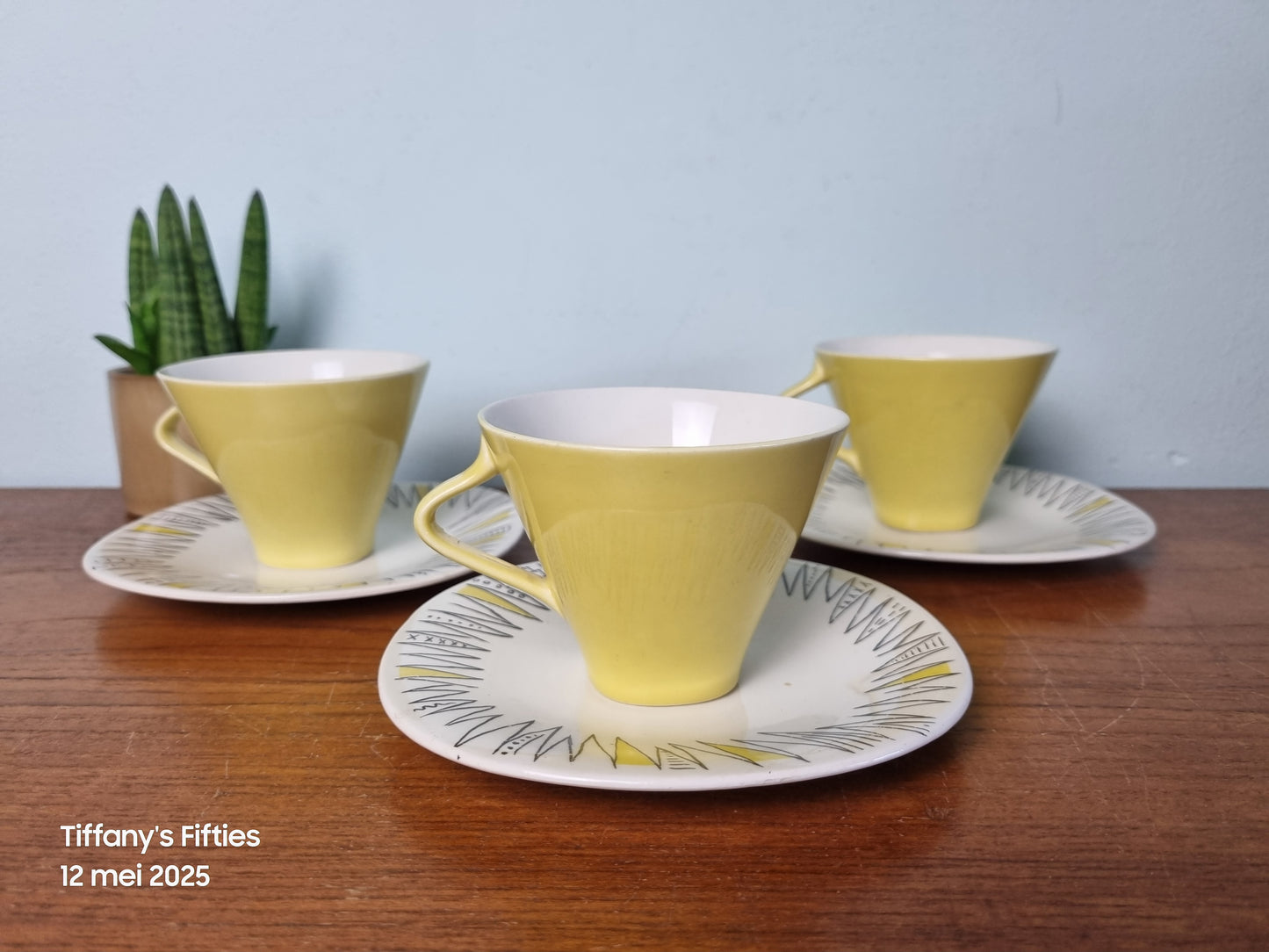 Vrolijke vintage koffiekopjes van Boch La Louviere uit de reeks Seduction met bijpassende schotels in een zonnige gele kleur. De kopjes hebben een elegante conische vorm en staan op schotels met een opvallend zigzagdecor in zwart en geel – een iconisch patroon uit de jaren ’50. De combinatie van felle kleur en grafisch ontwerp geeft deze set een echte retro-uitstraling.