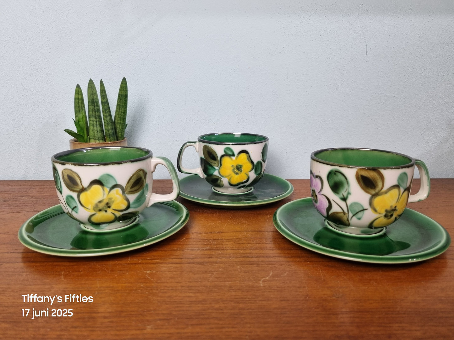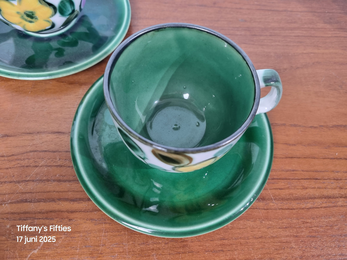 Sierlijke vintage koffiekopjes met bijpassende schotels van Boch La Louvière in het handgeschilderde decor “In the Mood”. De buitenzijde is voorzien van kleurrijke bloemen in geel, groen en paars, de binnenzijde heeft een diepe groene glazuurlaag, uitvoering genaamd "Deep Green". De combinatie van kleur en vorm geeft deze set een levendige retro-uitstraling.