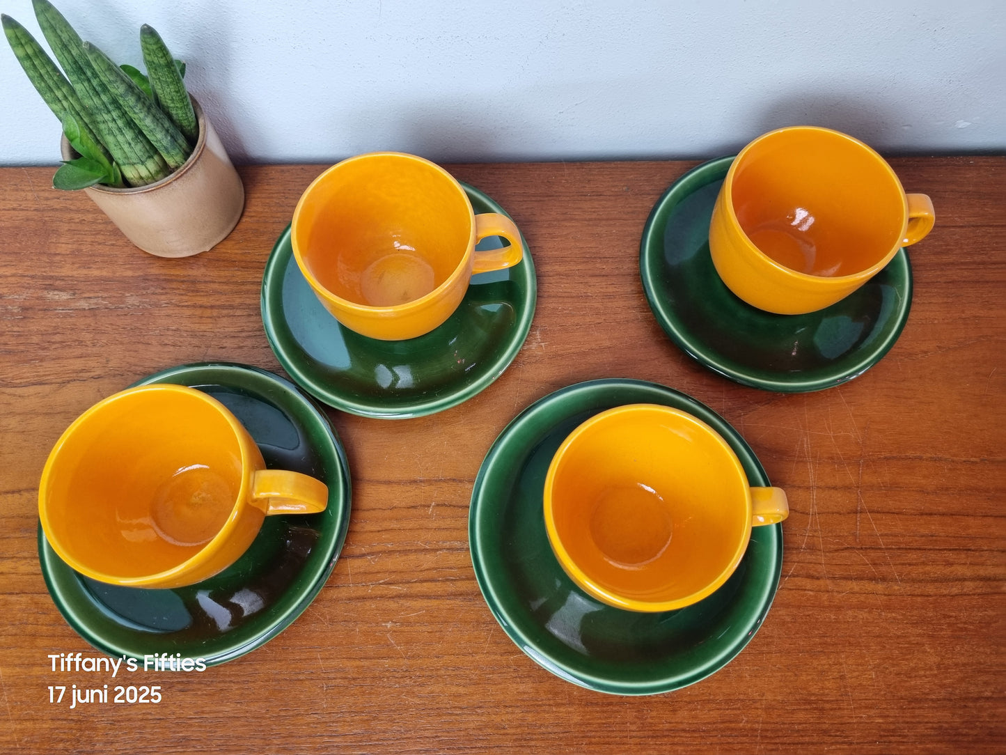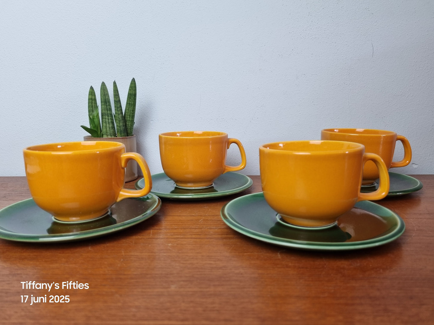 Deze zonnige kop-en-schotels uit de jaren ’60 zijn uitgevoerd in een opvallende combinatie van warm oranje-geel glazuur en diepgroene schotels – een typisch retro kleurenpalet dat doet denken aan de iconische vormgeving van het midden van de twintigste eeuw. De kopjes hebben een robuuste, afgeronde vorm met een karakteristiek oor bijdraagt aan hun vintage charme.