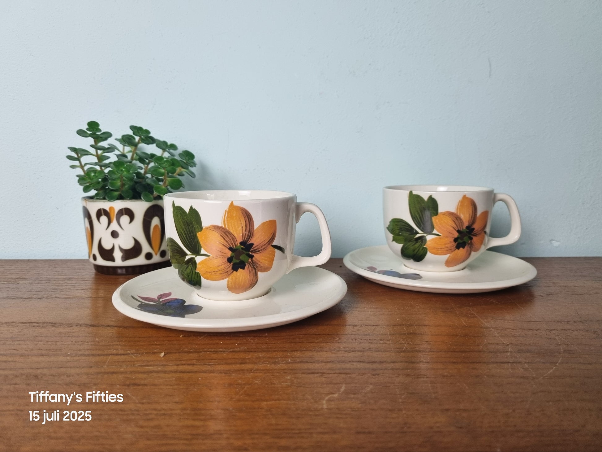 Gemaakt van crème-wit aardewerk met een handgeschilderde florale decoratie in diepe gele- en groentinten. De kop heeft een karakteristiek hoekig oor en staat op een subtiele voet. Het bijpassende schoteltje is versierd met hetzelfde bloemmotief.