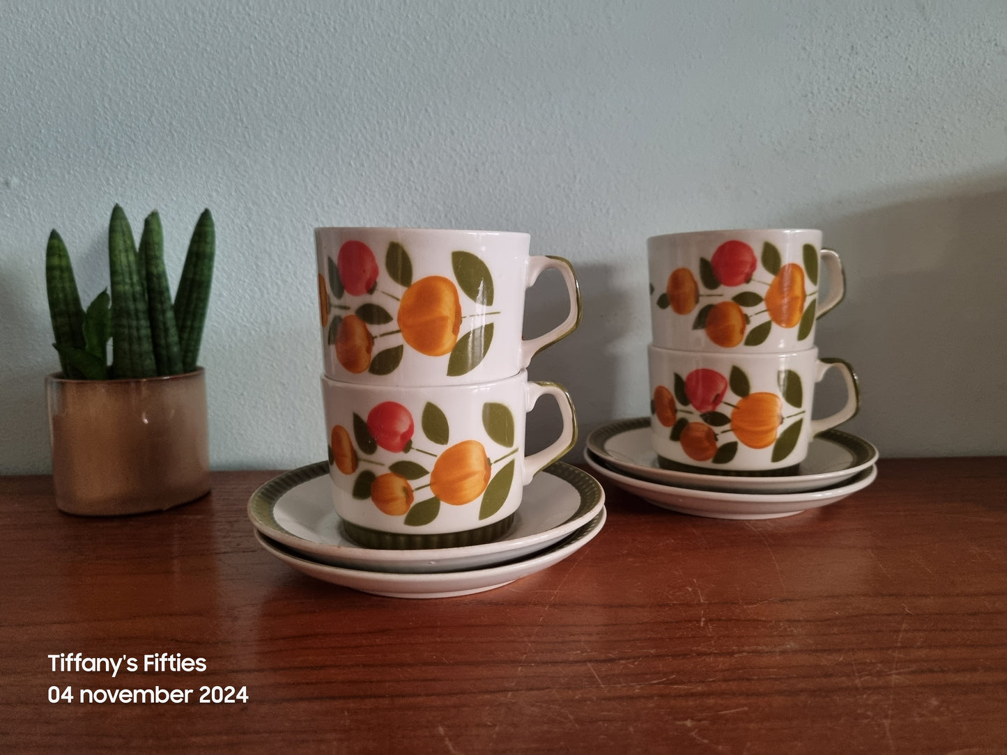Vrolijke kop en schotels van Boch La Louviere uit de reeks Delta met kleurrijk decor Stresa. Elk in heel mooie staat. Dit servies is vaatwasser bestendig.