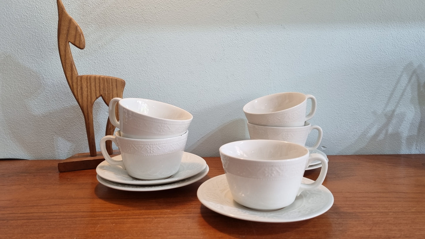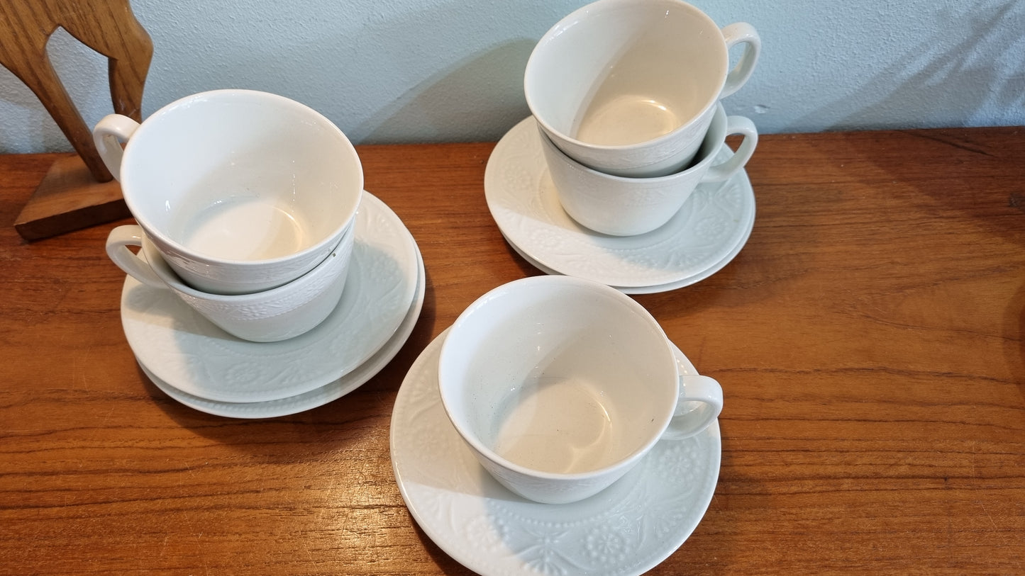 Mooie klassieke kopjes met onderbord. Zowel kopje als onderbord hebben een sierlijke relief rand.