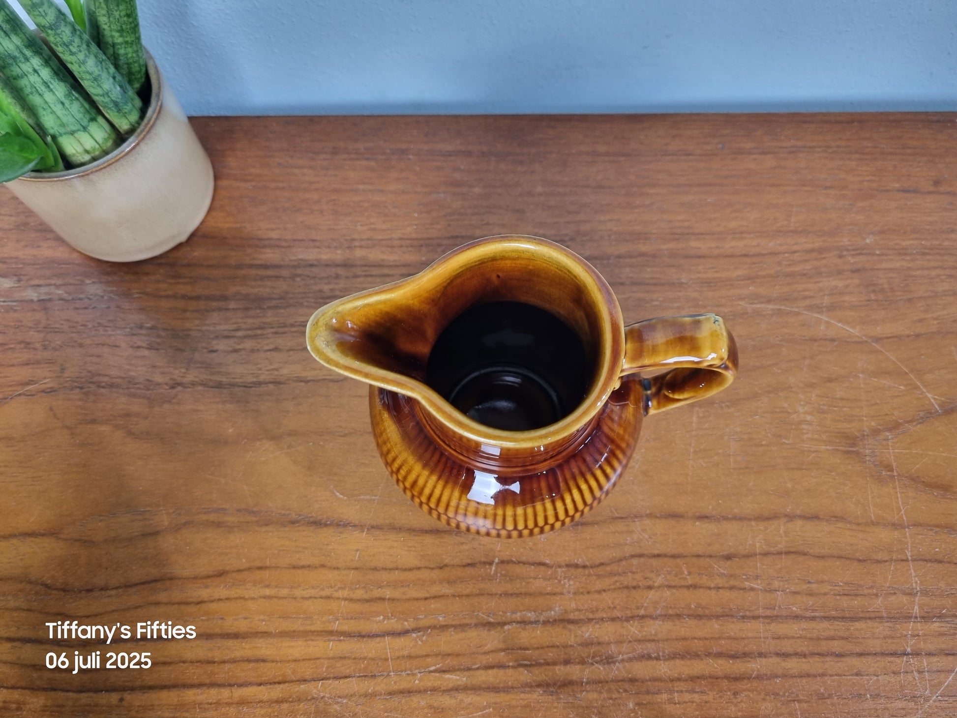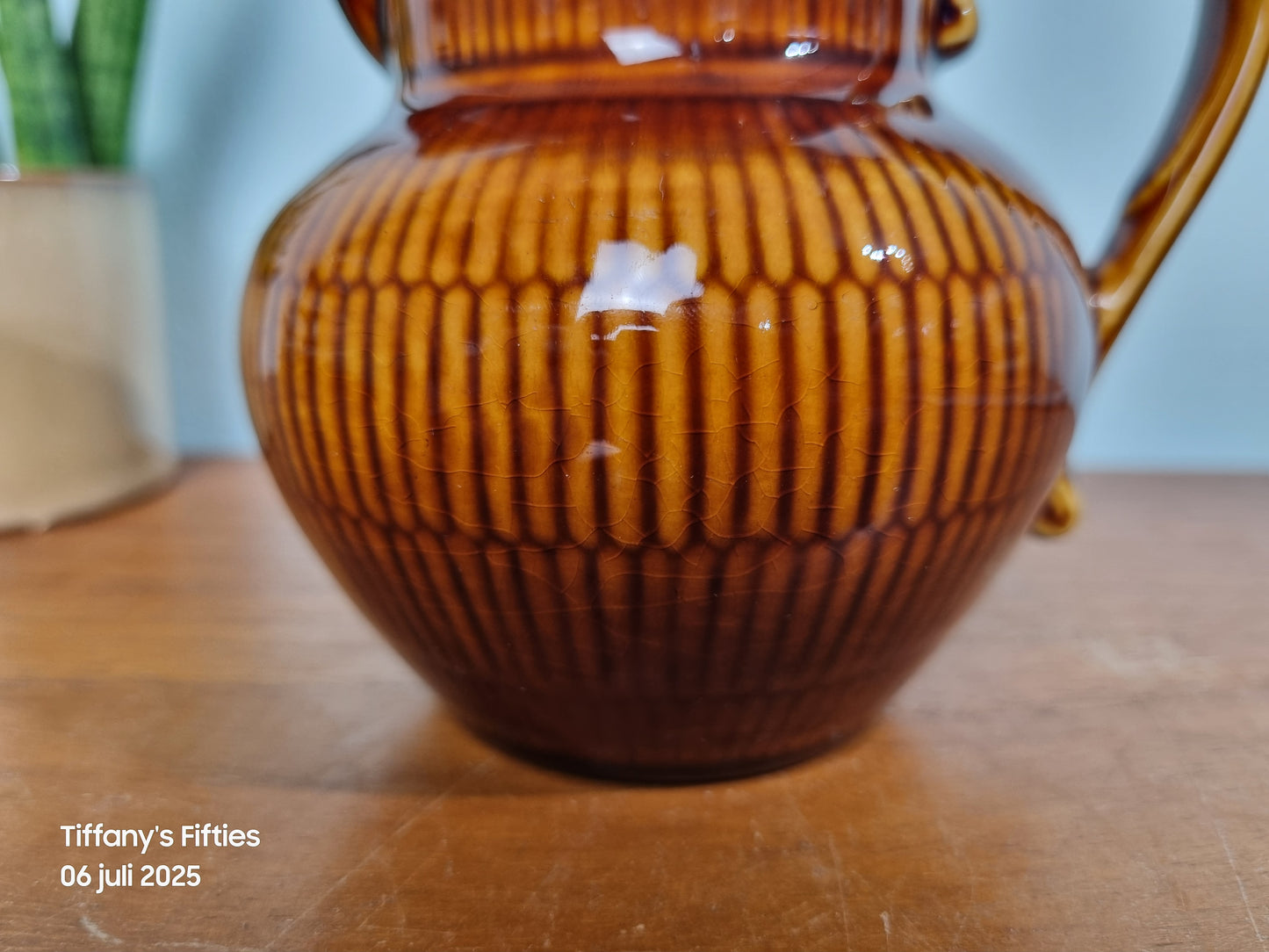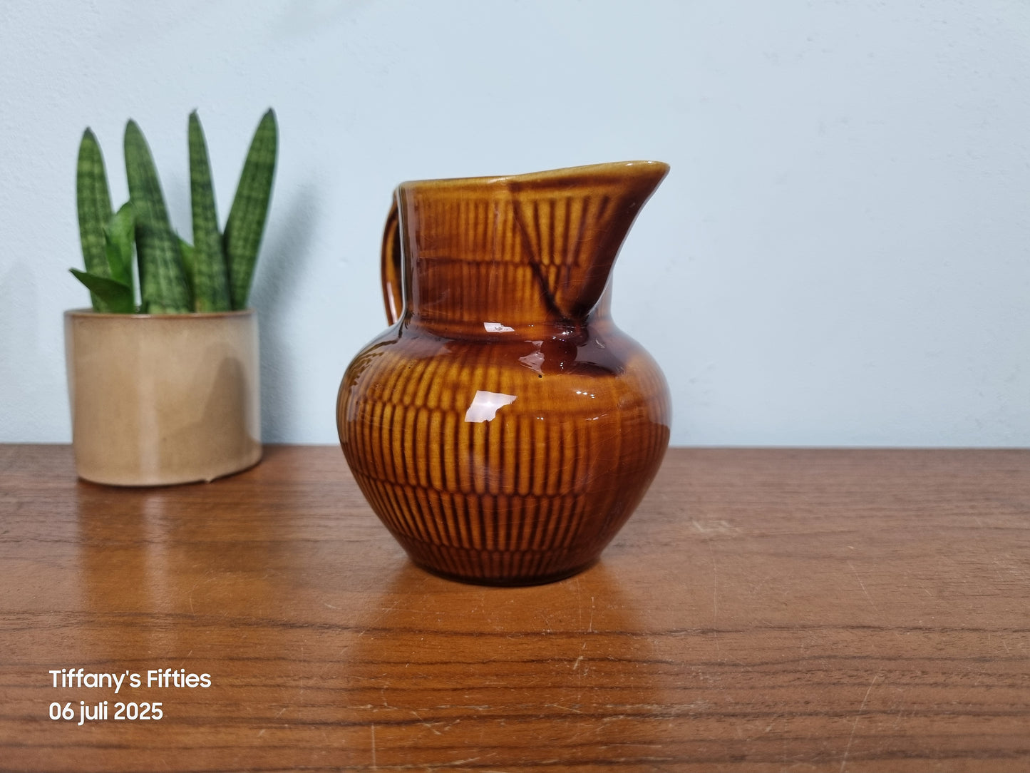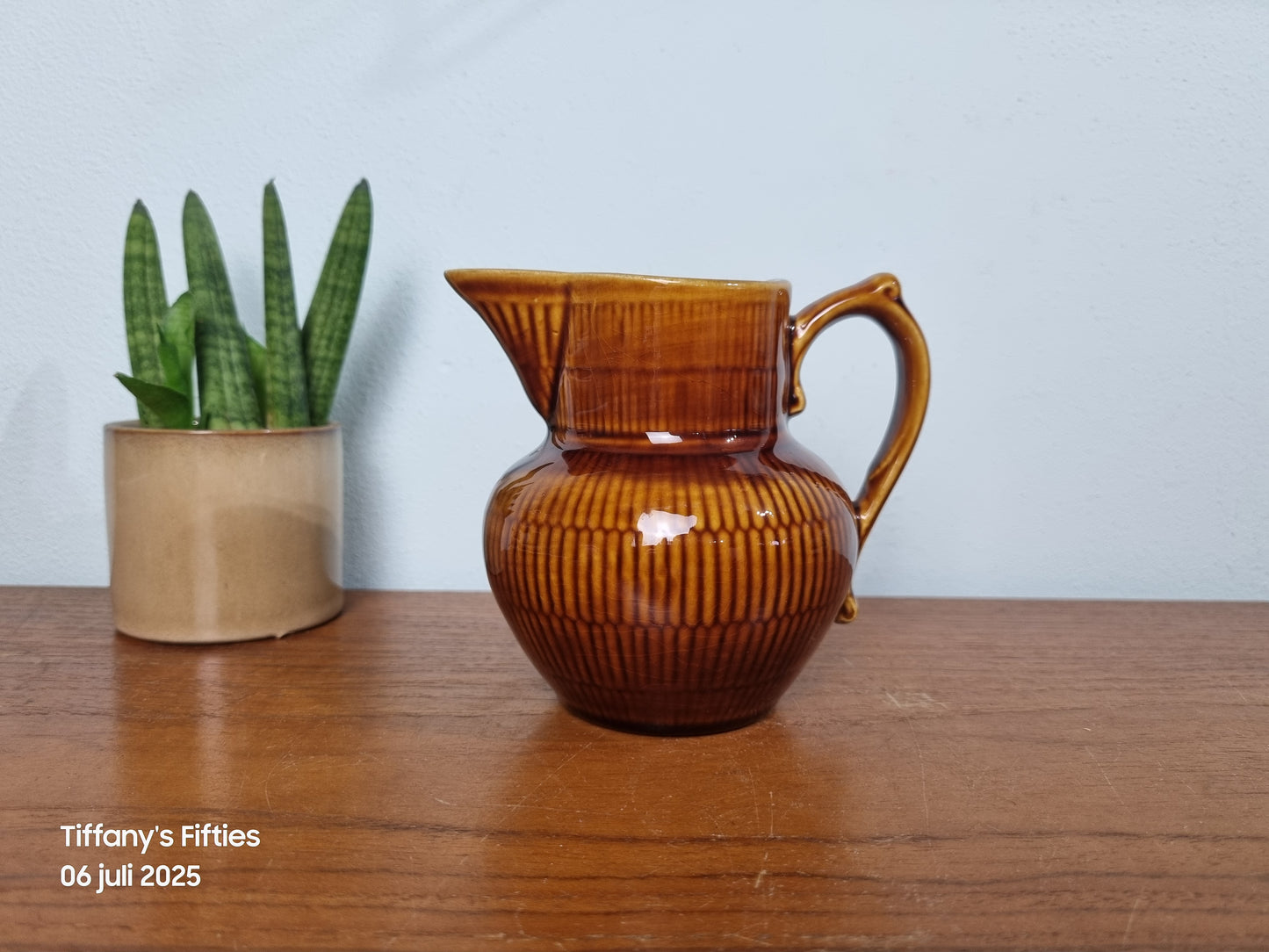 Dit charmante kannetje van Boch La Louvière straalt rustieke elegantie uit met zijn warme kastanjebruine glazuur en verfijnde verticale ribbelstructuur. De vorm ‘Saxe’ met zijn elegante oor en wijde tuit maakt het een typisch voorbeeld van mid-century Belgisch keramiek.