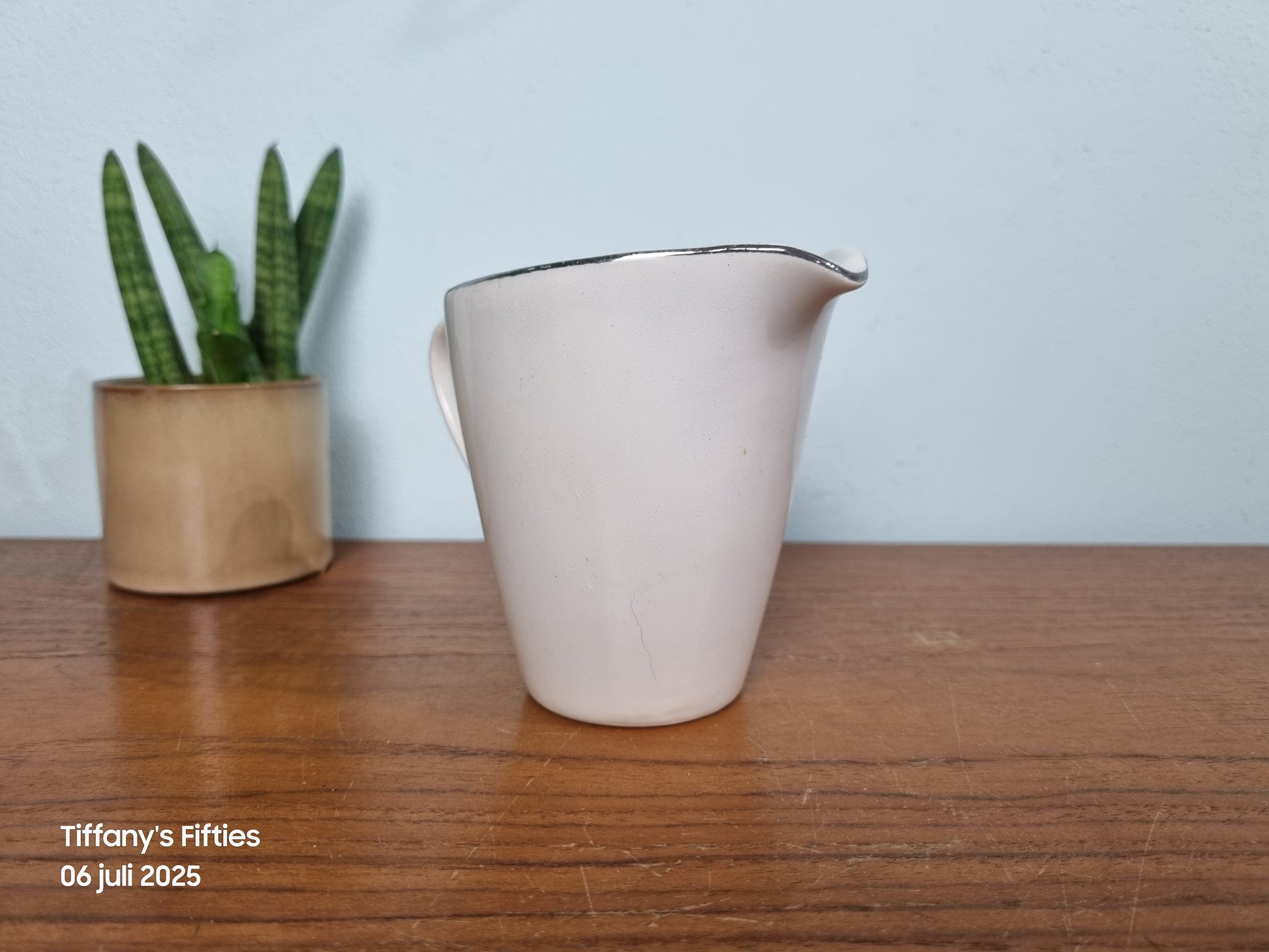 Deze elegante porseleinen melkkan van Boch La Louvière is uitgevoerd in zacht wit met een verfijnd zilverkleurig biesje langs de rand. Het slanke, iets taps toelopende silhouet en de fijne greep geven het kannetje een sierlijke, ingetogen uitstraling.