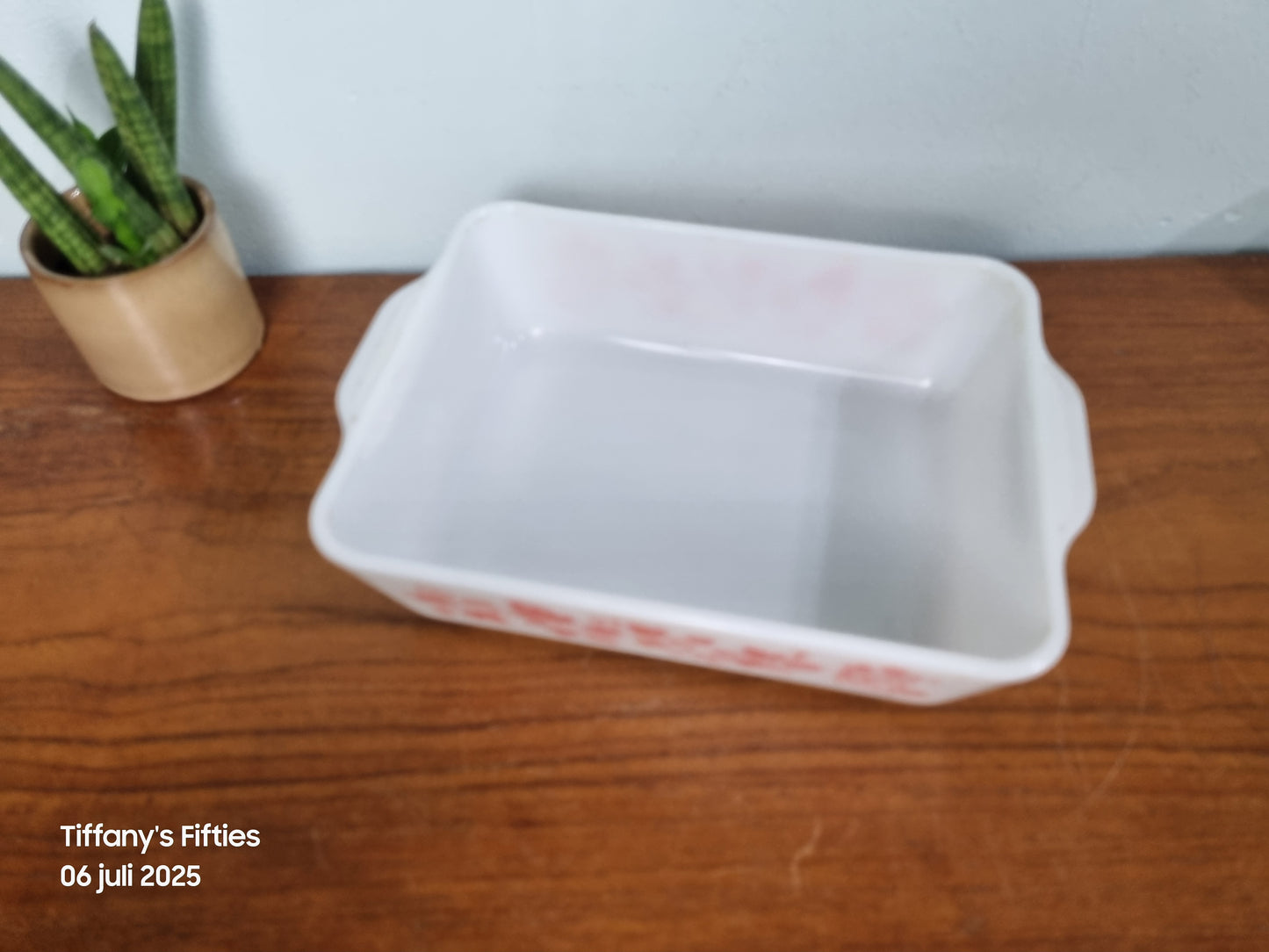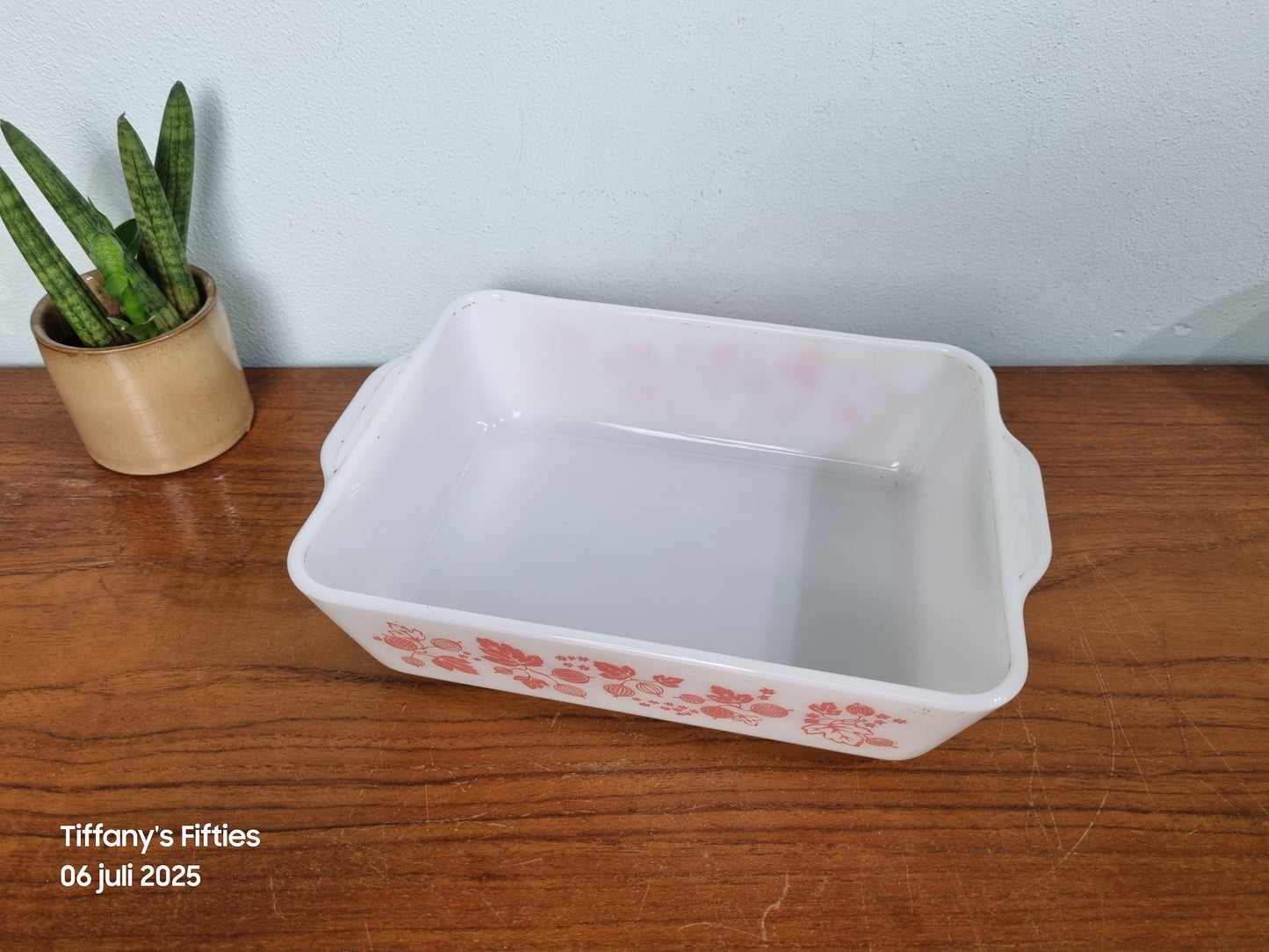 Deze klassieke ovenschaal van Pyrex uit de jaren ’60 straalt Amerikaanse vintage charme uit. Het melkglas is bedrukt met een decoratief motief van rode bessen, bloemen en bladeren in zacht koraalrood — een typisch ontwerp uit de populaire “Gooseberry” lijn.