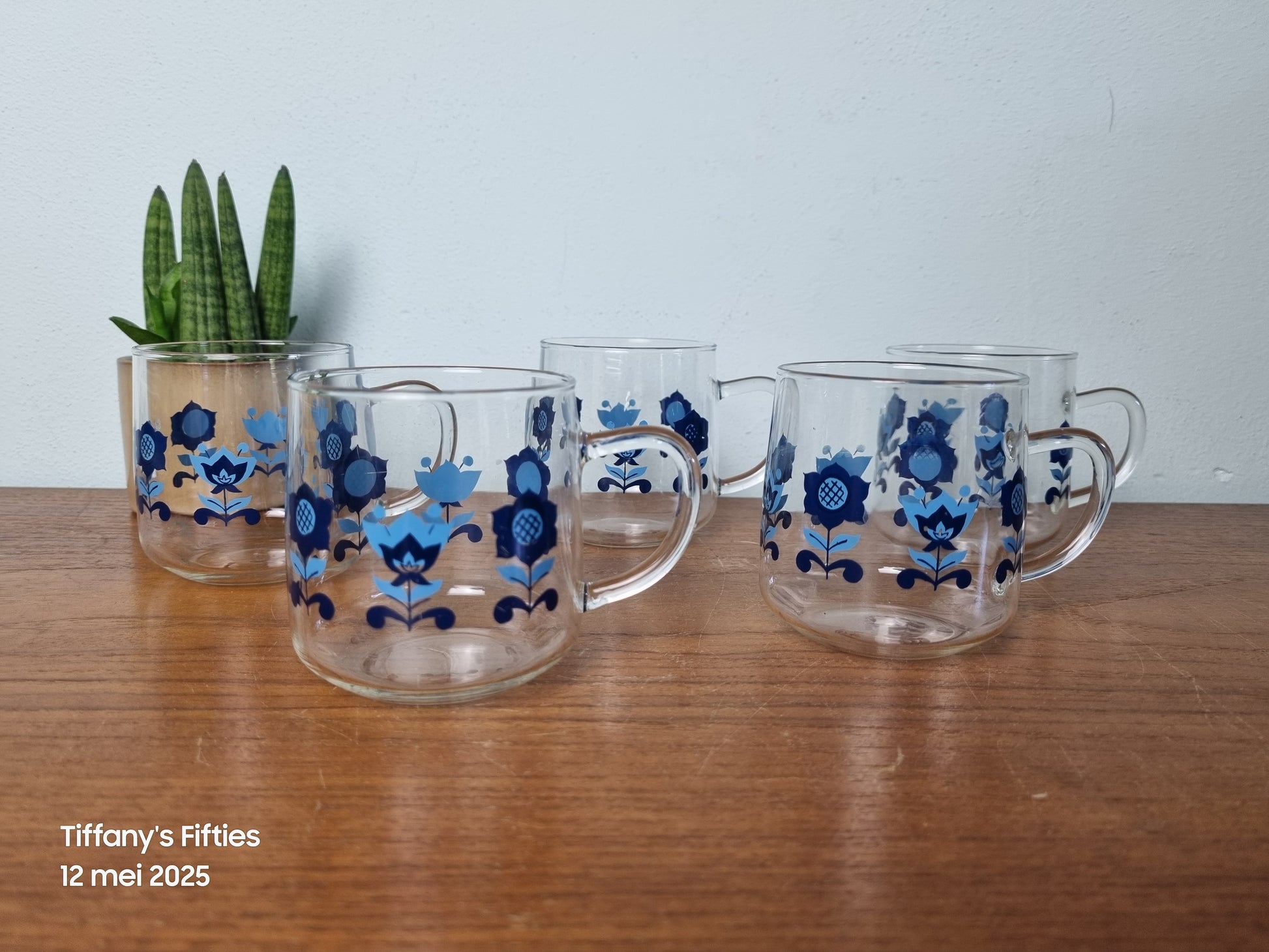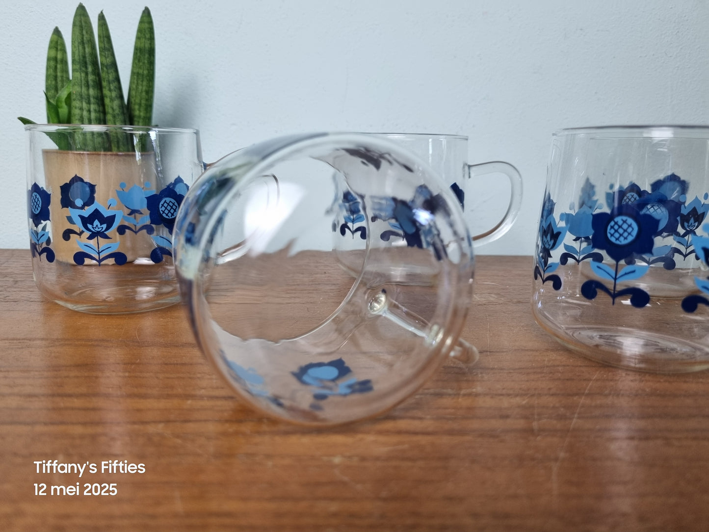 Leuke kleine theekopjes in glas met retro blauwe bloemen, Scandinavische stijl. Elk in prima staat. Diameter 7 cm, hoogte 7,5 cm.