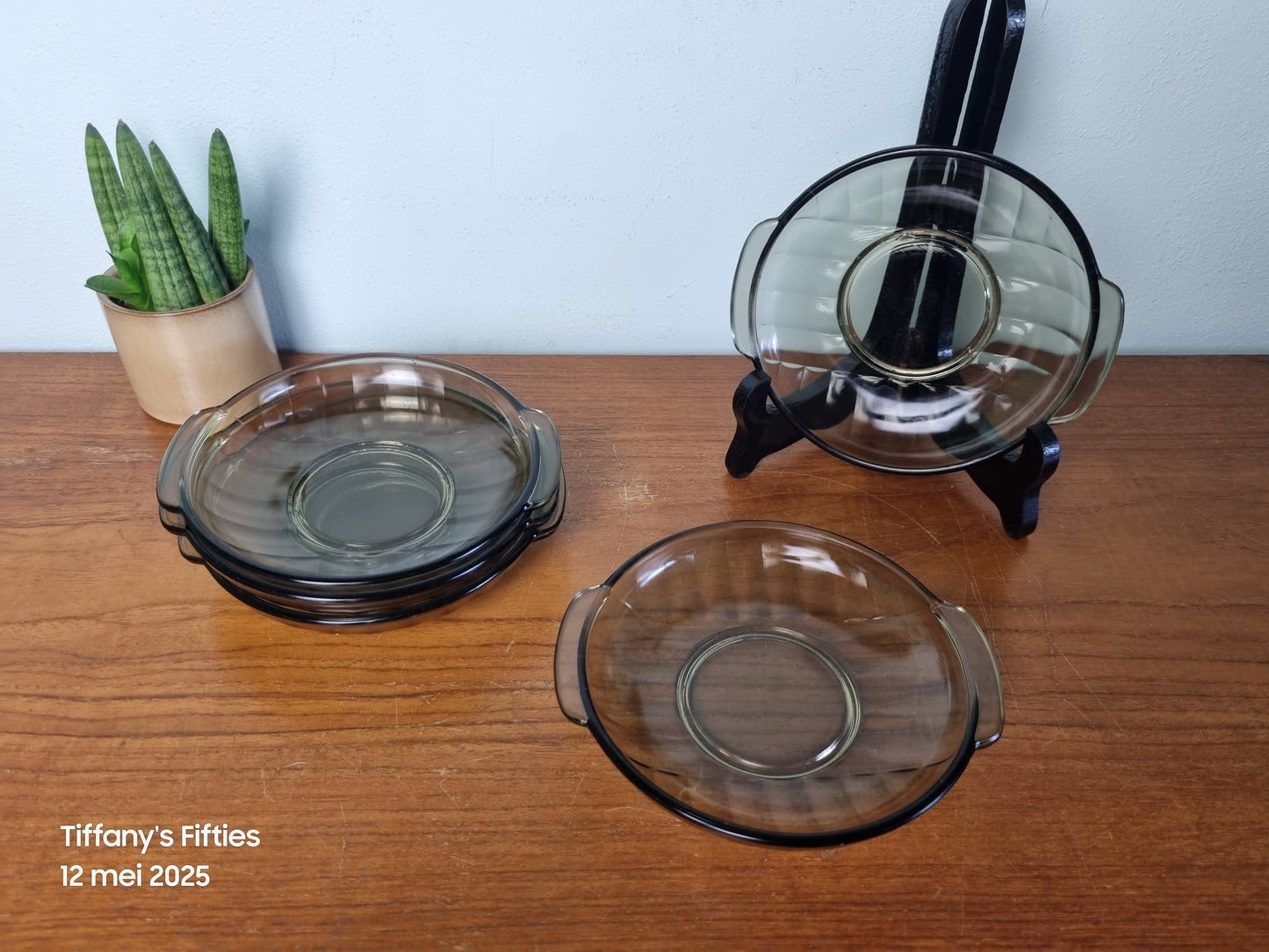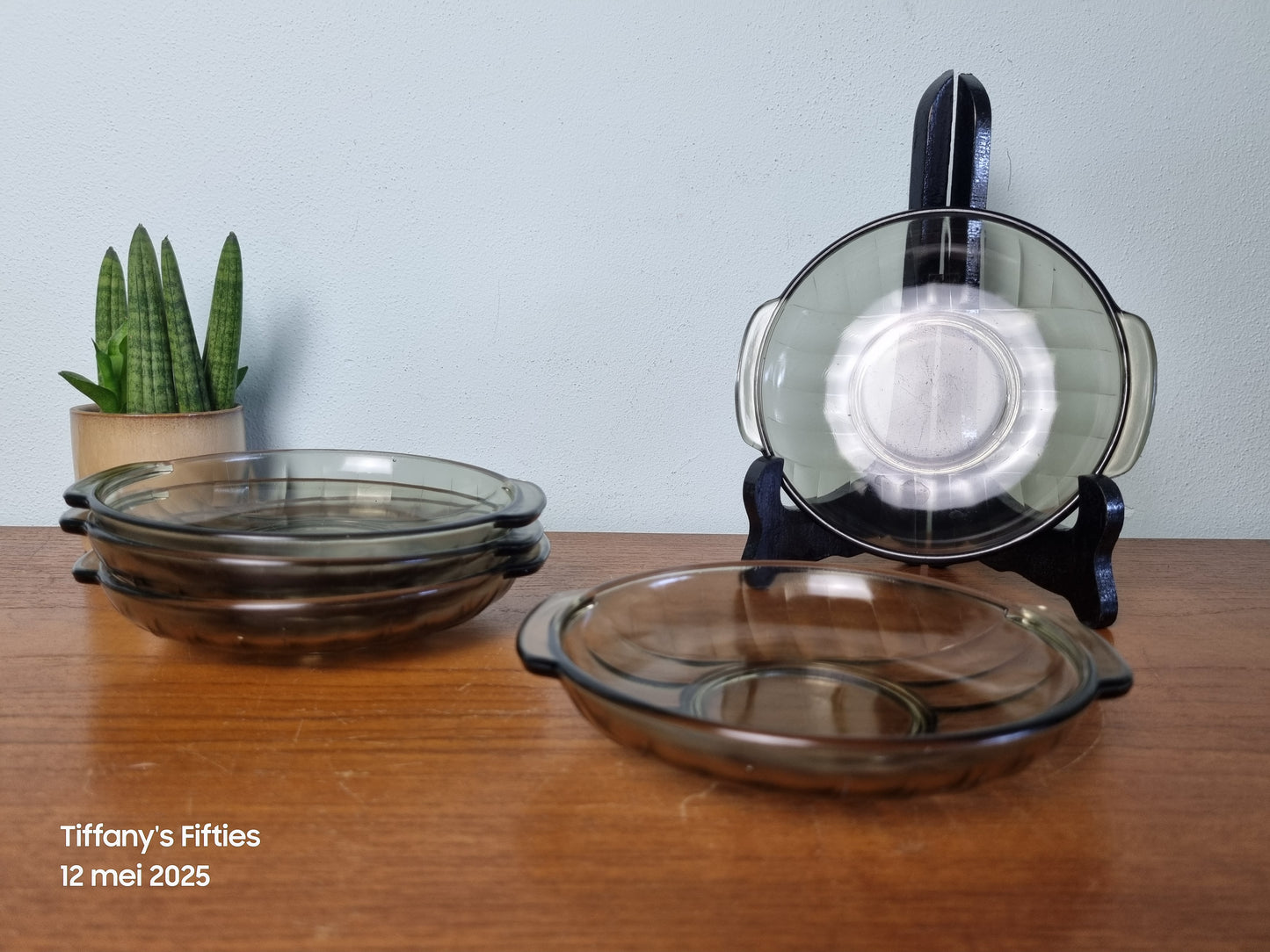 Glazen ovenschaaltjes in rookglas (donker getint glas). De schaaltjes hebben een ronde vorm met handgrepen aan beide zijden en een decoratieve cirkel in het midden. Praktisch voor individuele porties ovengerechten, maar ook stijlvol als serveerschaaltjes.
