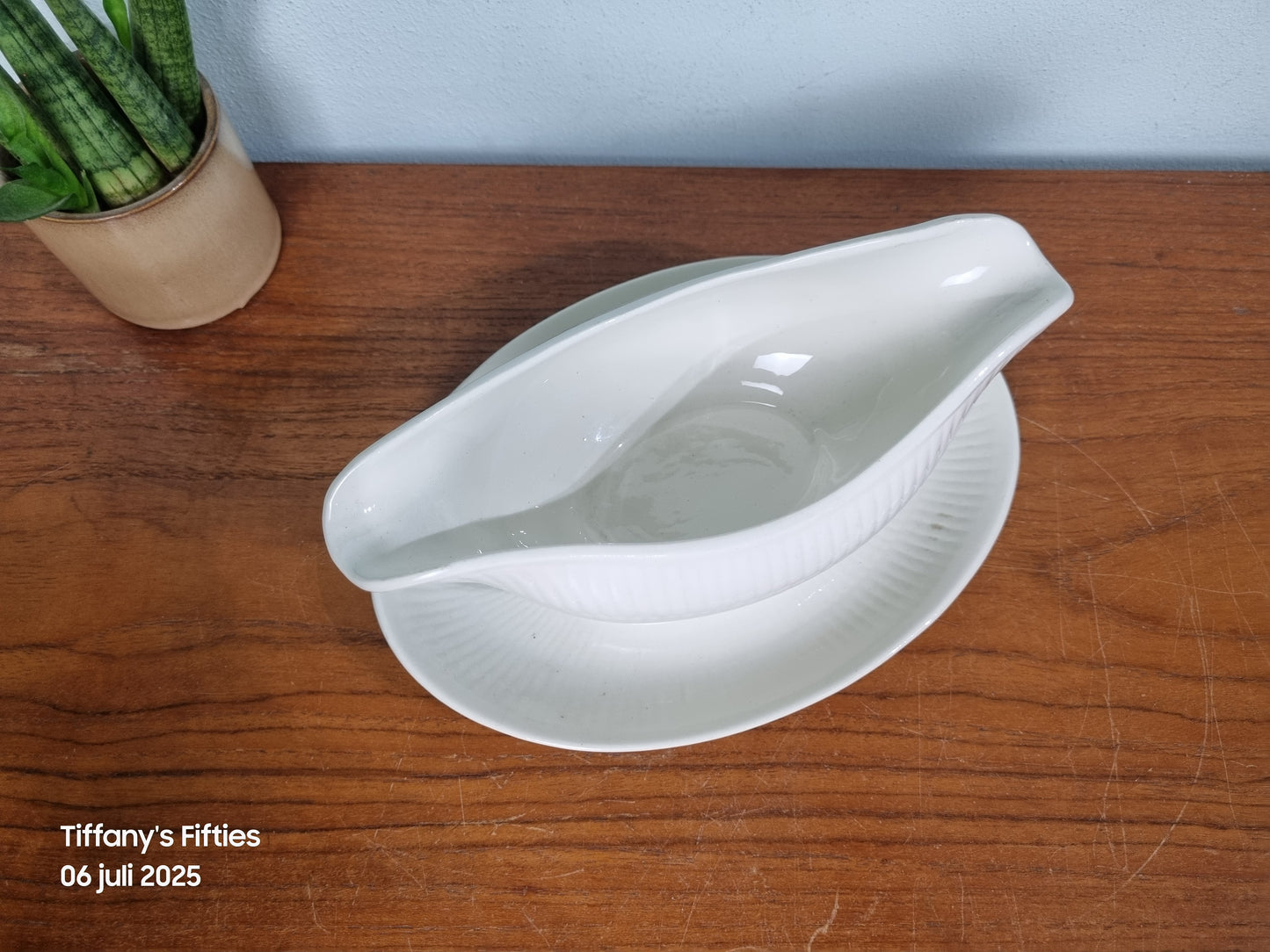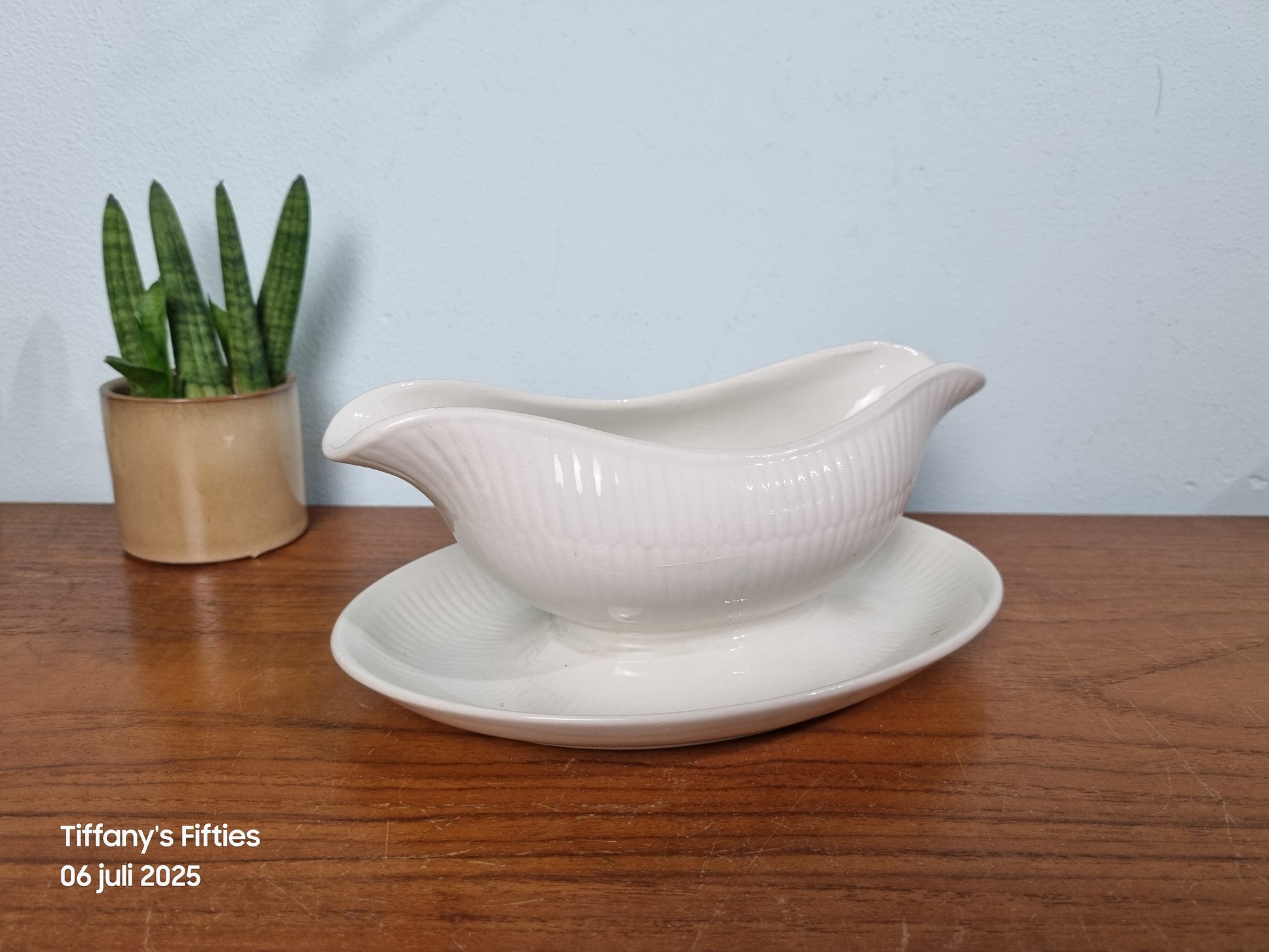 Deze elegante sauskom van Boch La Louvière, vorm Saxe in het verfijnde decor Vienne, straalt ingetogen charme uit met haar zachte roomwitte glazuur en subtiel geribbelde oppervlak. De vaste onderschotel vangt moeiteloos druppels op en zorgt voor een sierlijke presentatie op tafel.