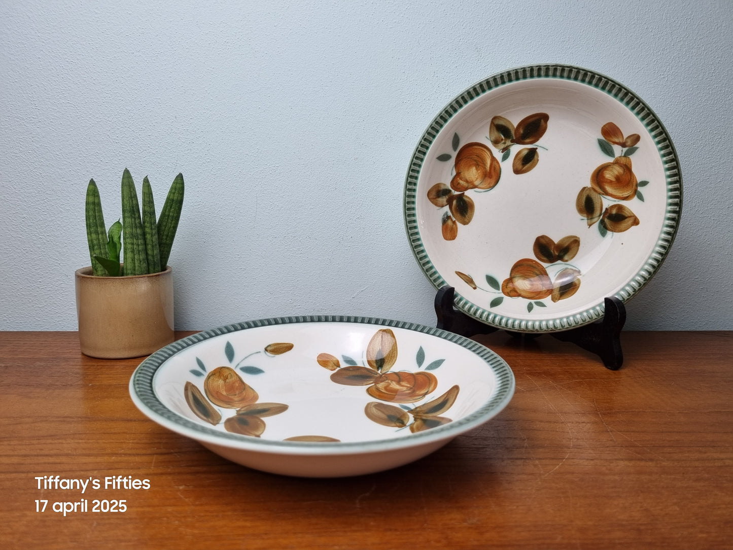Sfeervolle set van 2 vintage diepe borden van Boch La Louviere uit de reeks Delta in crème wit aardewerk met een handgeschilderd bloem- en bladerdecor in warme herfsttinten, decor Agatha. De rand is afgewerkt met een groengekleurde ribbelrand, wat het geheel een rustieke en landelijke uitstraling geeft.