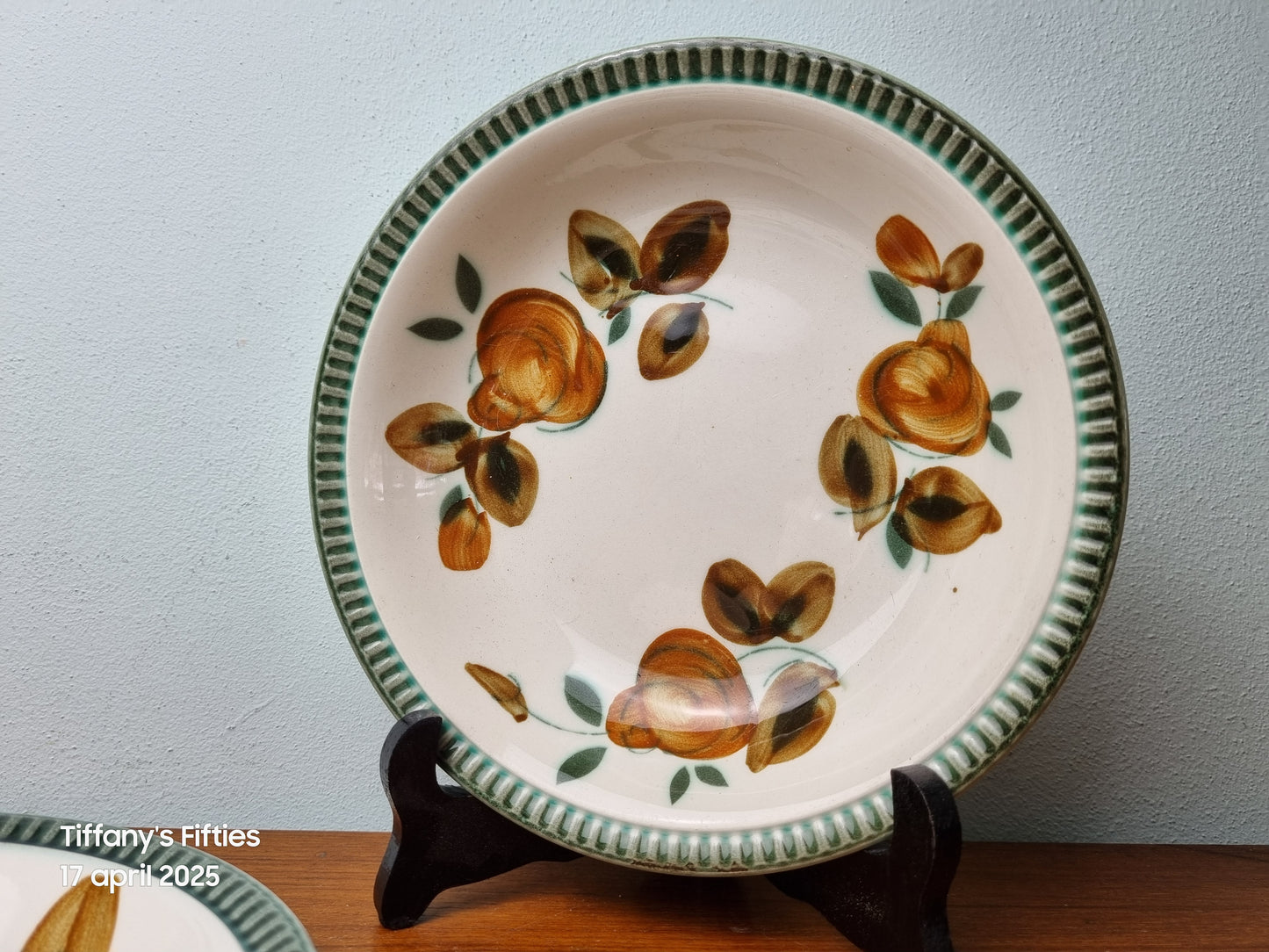 Mooi te combineren met houten accessoires of klassiek servies. In redelijke vintage staat – één bord heeft een kleine chip aan de rand (zie detailfoto), verder lichte gebruikssporen passend bij de leeftijd. Authentiek servies voor een gezellig gedekte tafel. Diameter 20.5 cm.