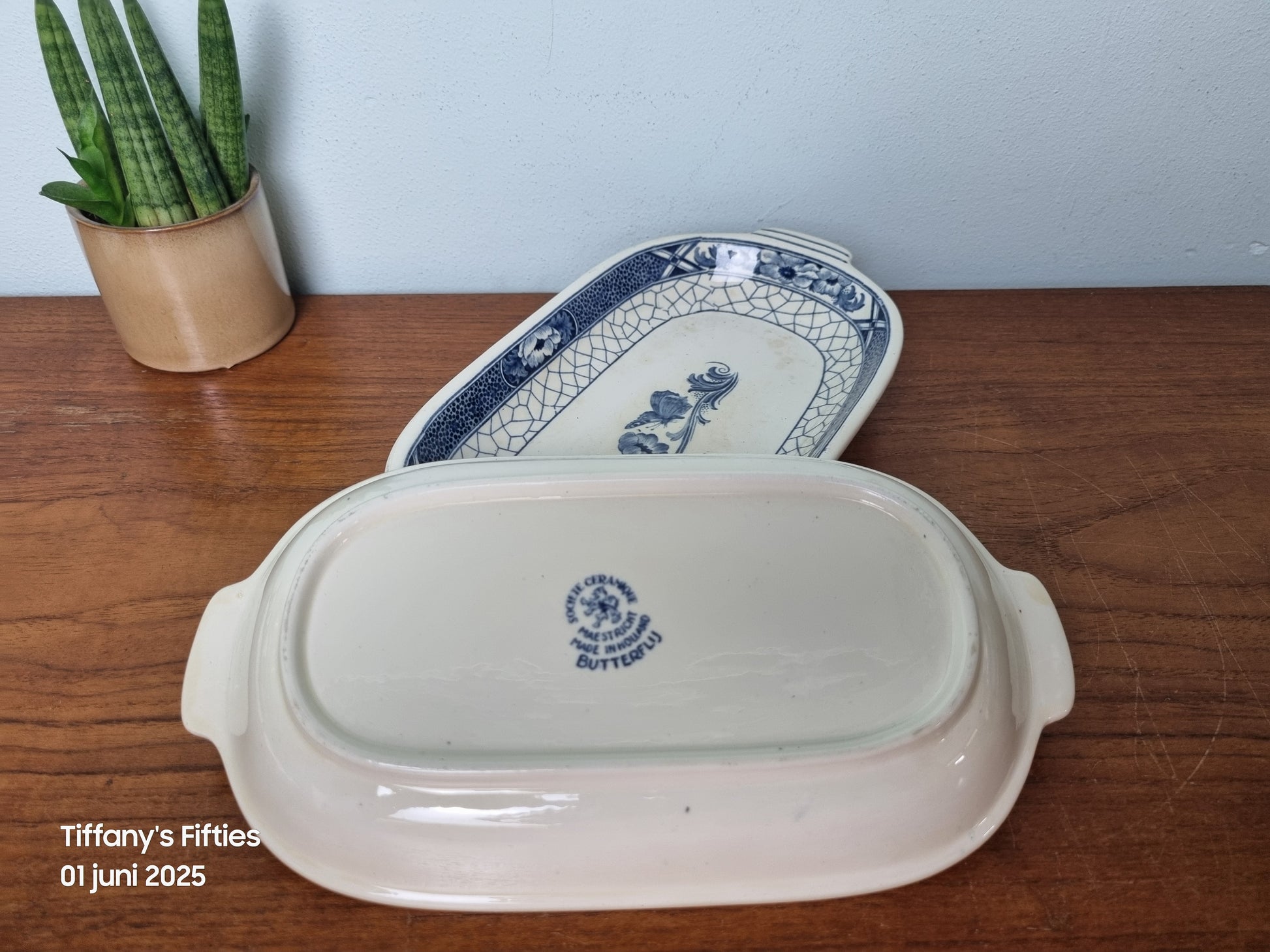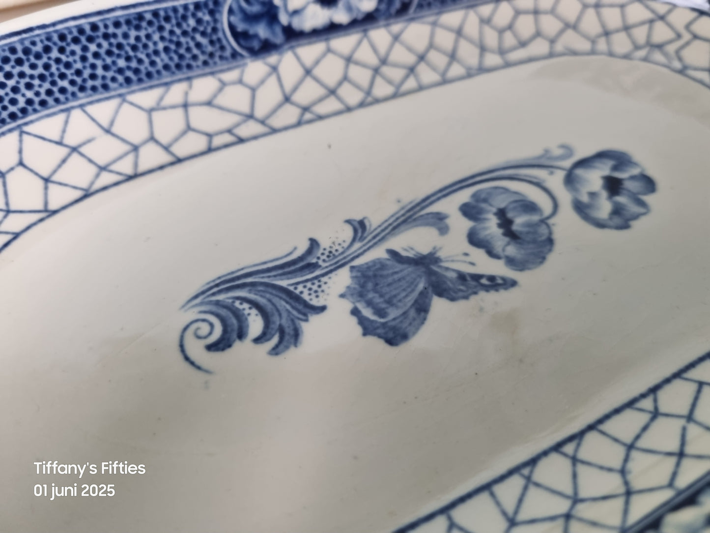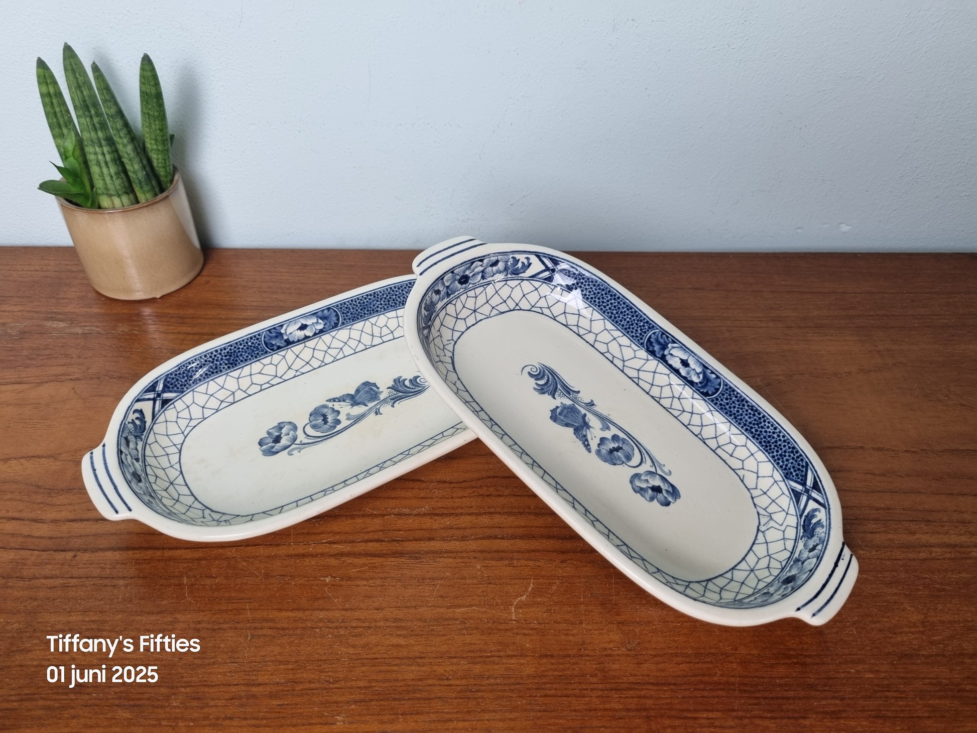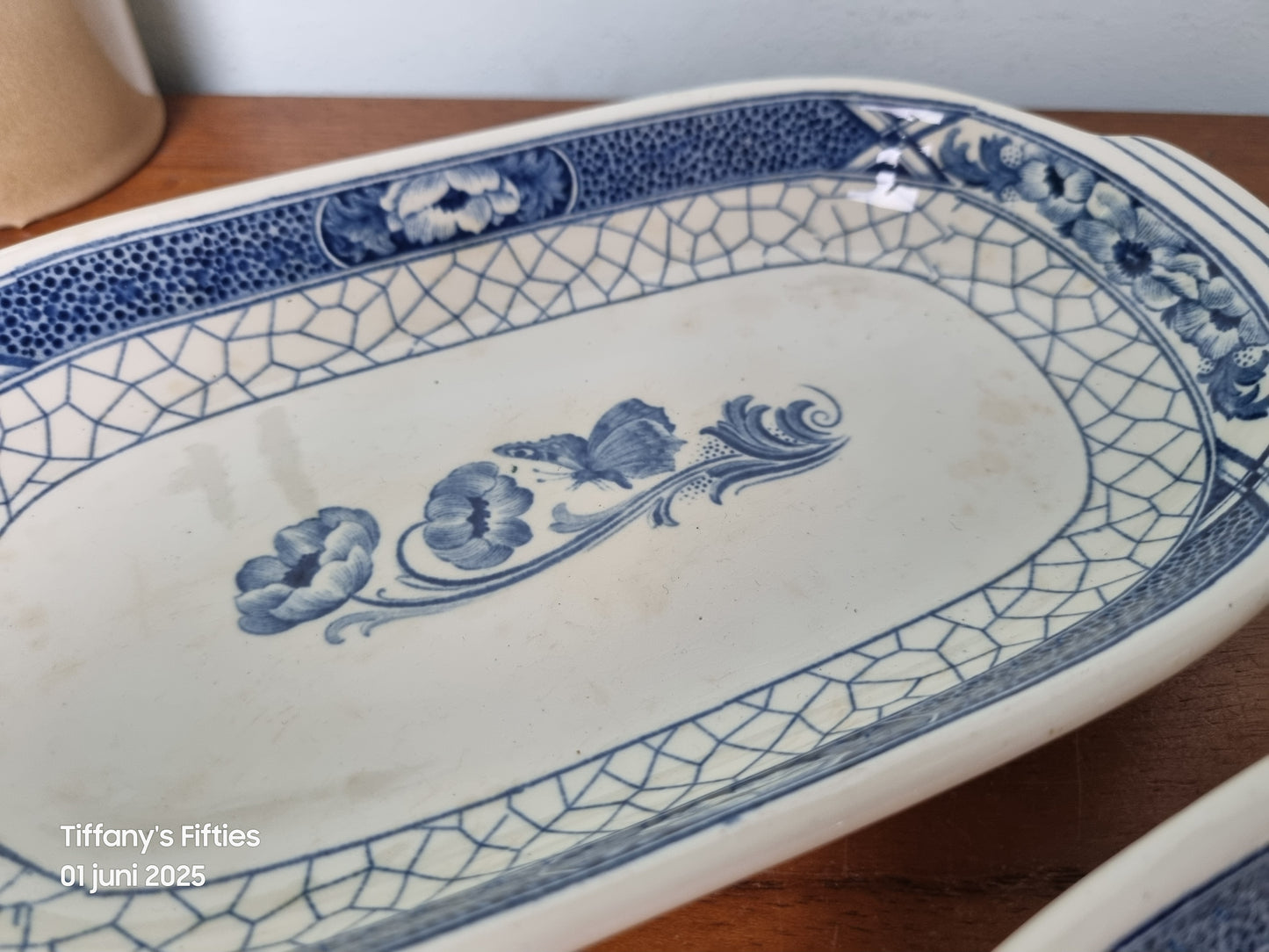 Set van twee langwerpige vintage serveerschalen van keramiek, uitgevoerd in een klassiek blauw-wit decor. De binnenzijde toont een verfijnd motief van bloemen en een vlinder, omlijst met een decoratieve rand in netstructuur en florale patronen. De licht opstaande handgrepen aan weerszijden maken het serveren stijlvol én praktisch.