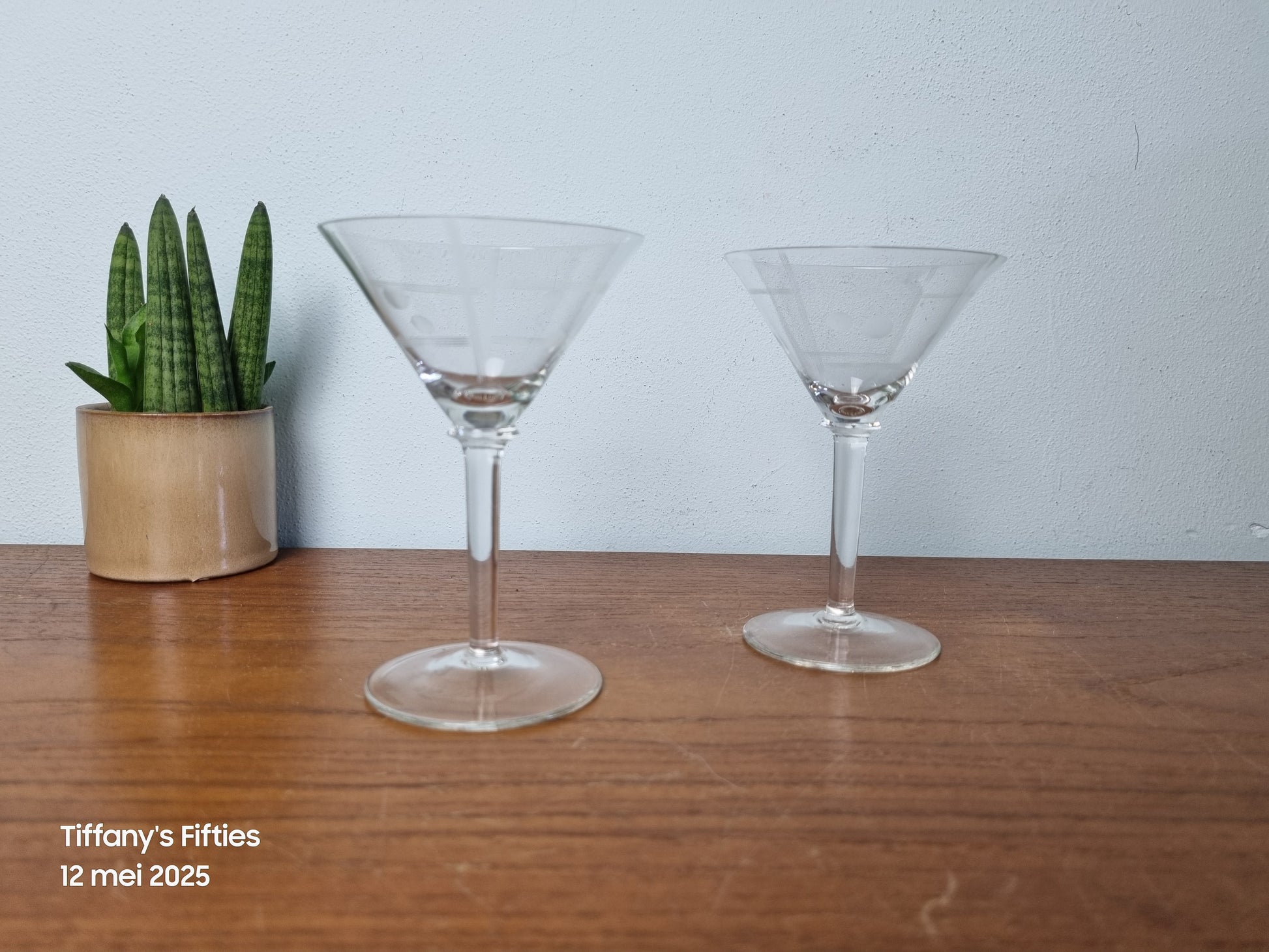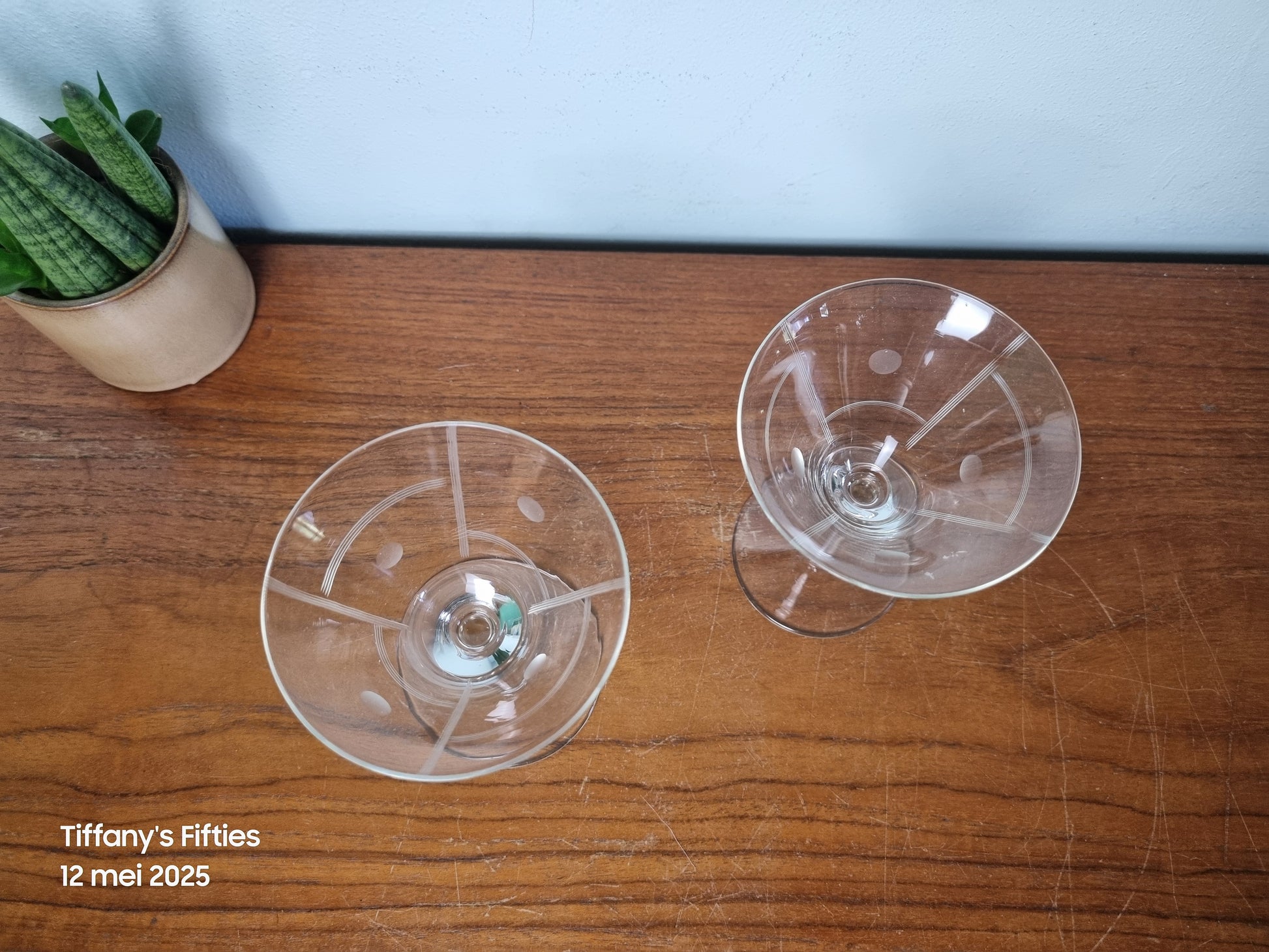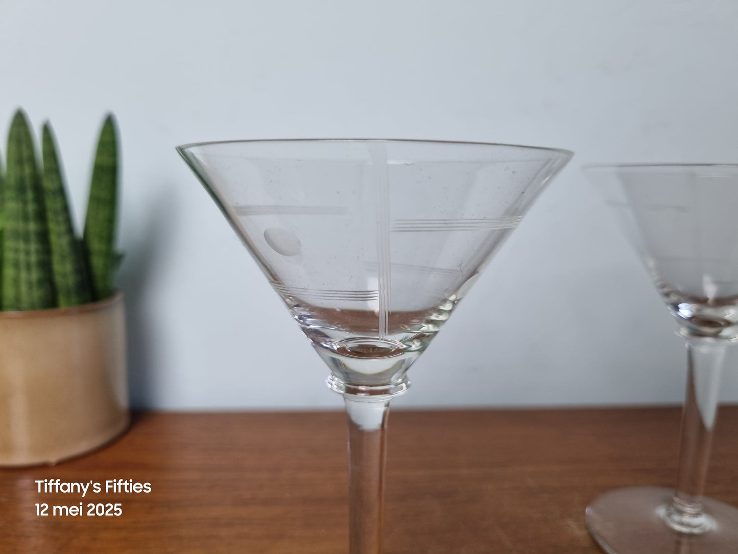 Prachtige gedetailleerde cocktailglaasjes uit geslepen glas. Elk in heel mooie staat. Diameter 8 cm, hoogte 12.5 cm.