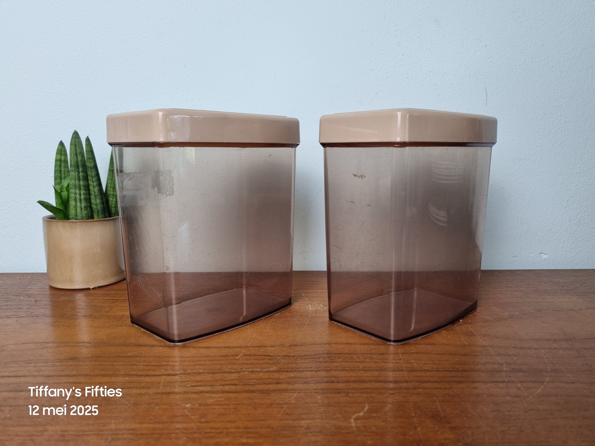 Set van twee vintage kunststof voorraadbussen in transparant bruin met bijpassende beige deksels. De vorm en het zachte kleurenschema zijn typisch voor de praktische maar stijlvolle keukenopbergers uit de jaren ’70. Ideaal voor het bewaren van droge voeding zoals suiker, pasta of koffie. Afmetingen 12 x 15 x 8,5 cm.