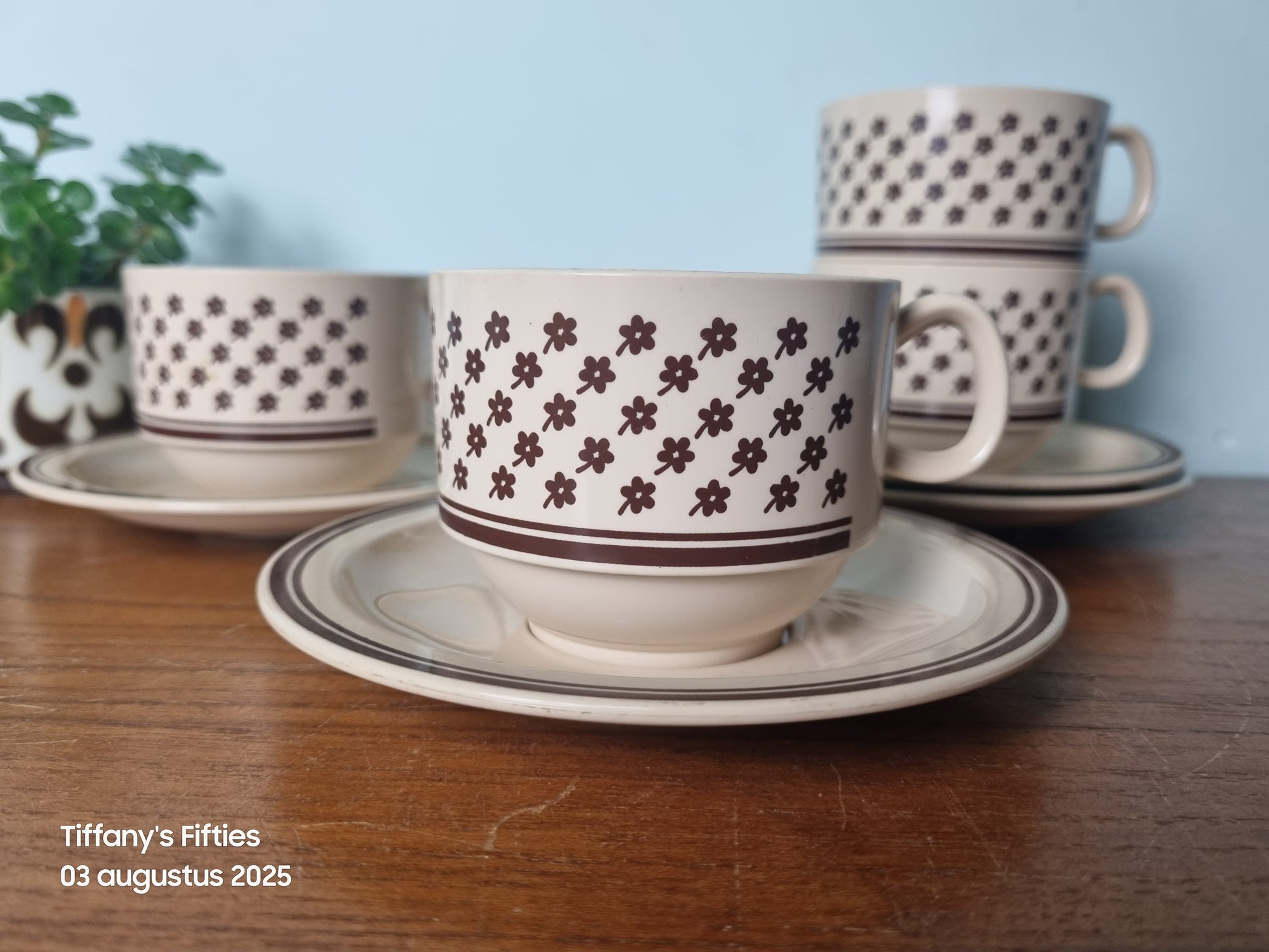 Set van vier stapelbare koffiekopjes met schoteltjes van Emsa in kunststof. Crèmekleurig met bruin bloemetjesdecor en bijpassende schotels met dubbele bruine rand. Licht, stevig en stapelbaar – ideaal voor onderweg.