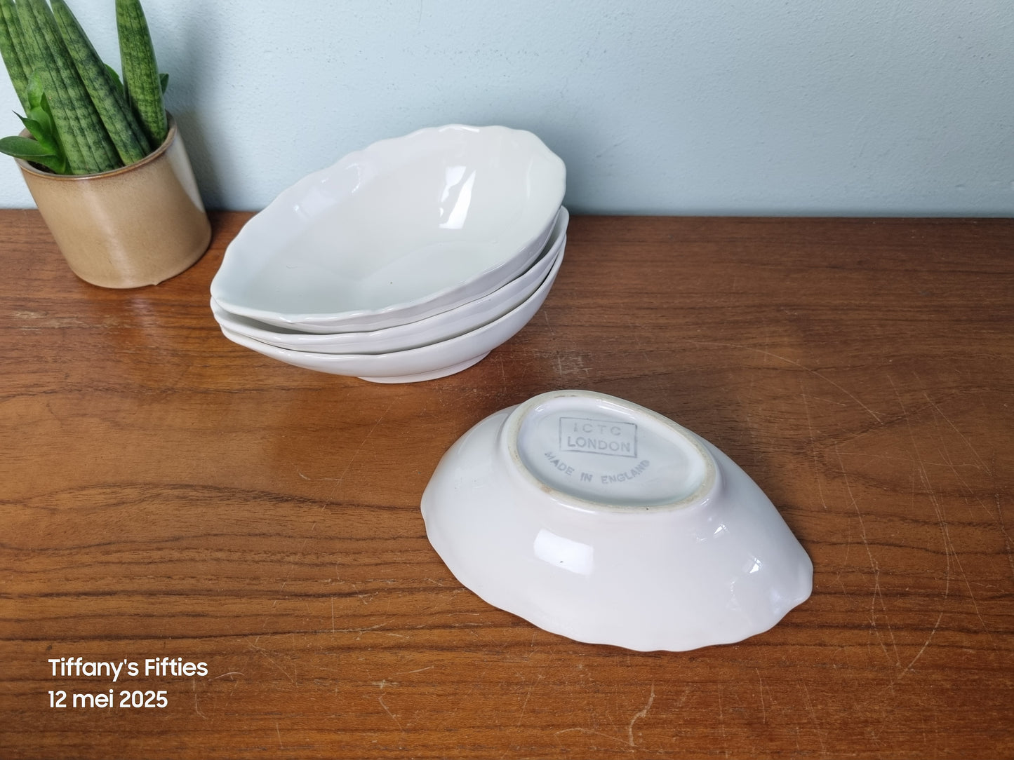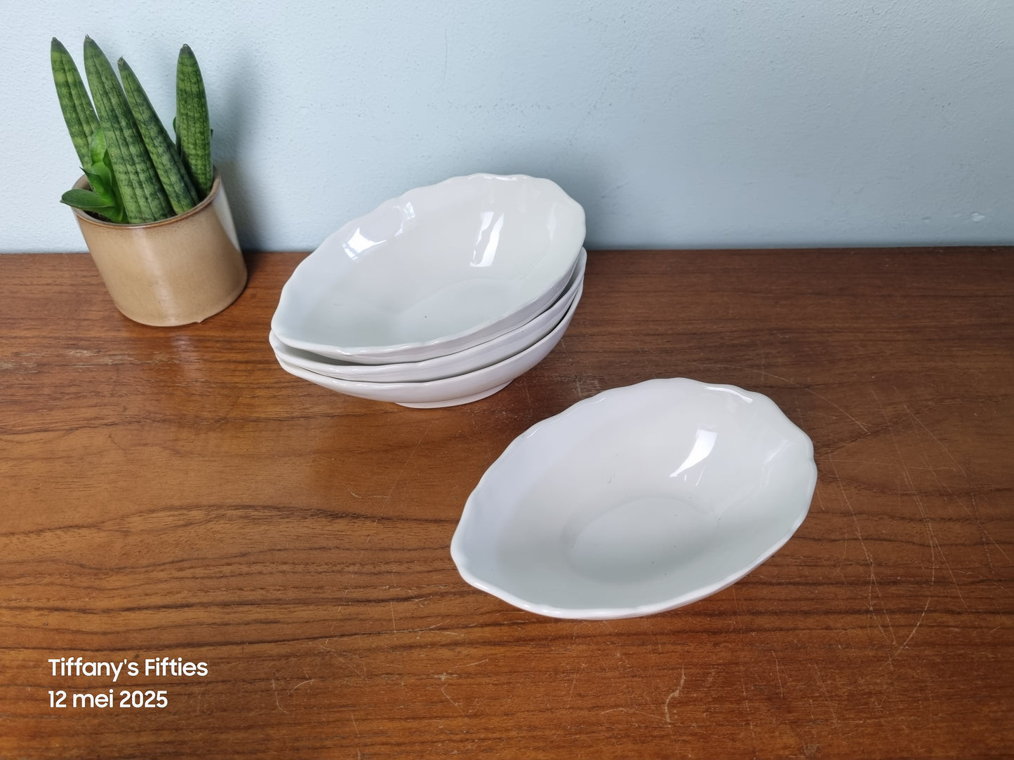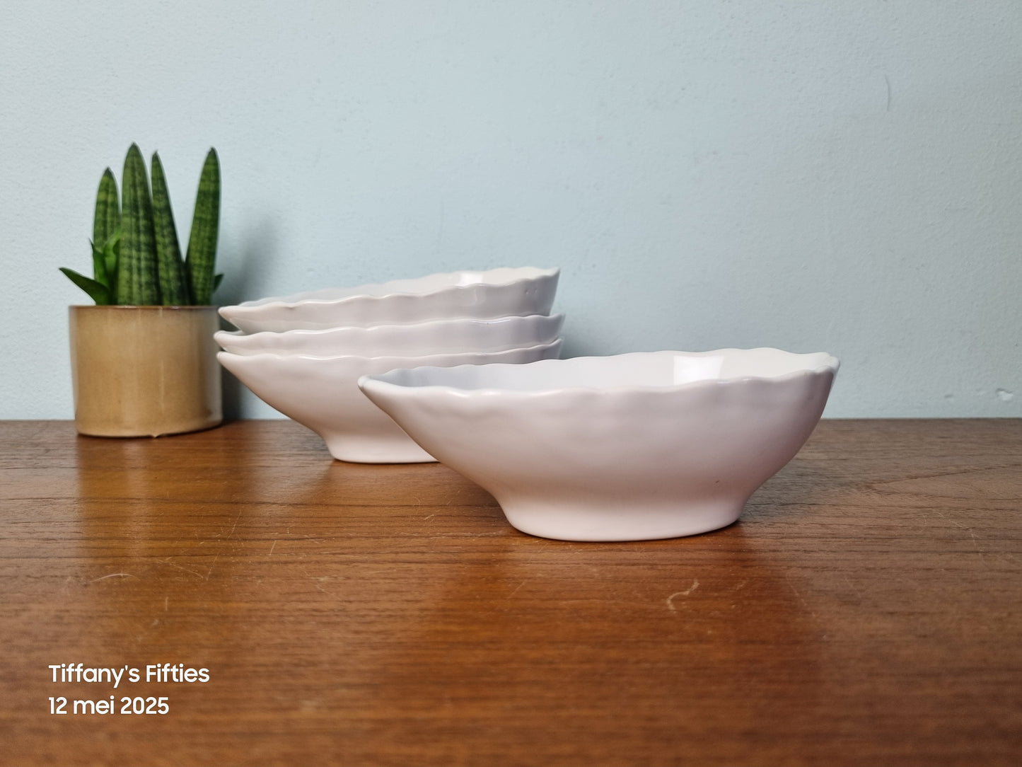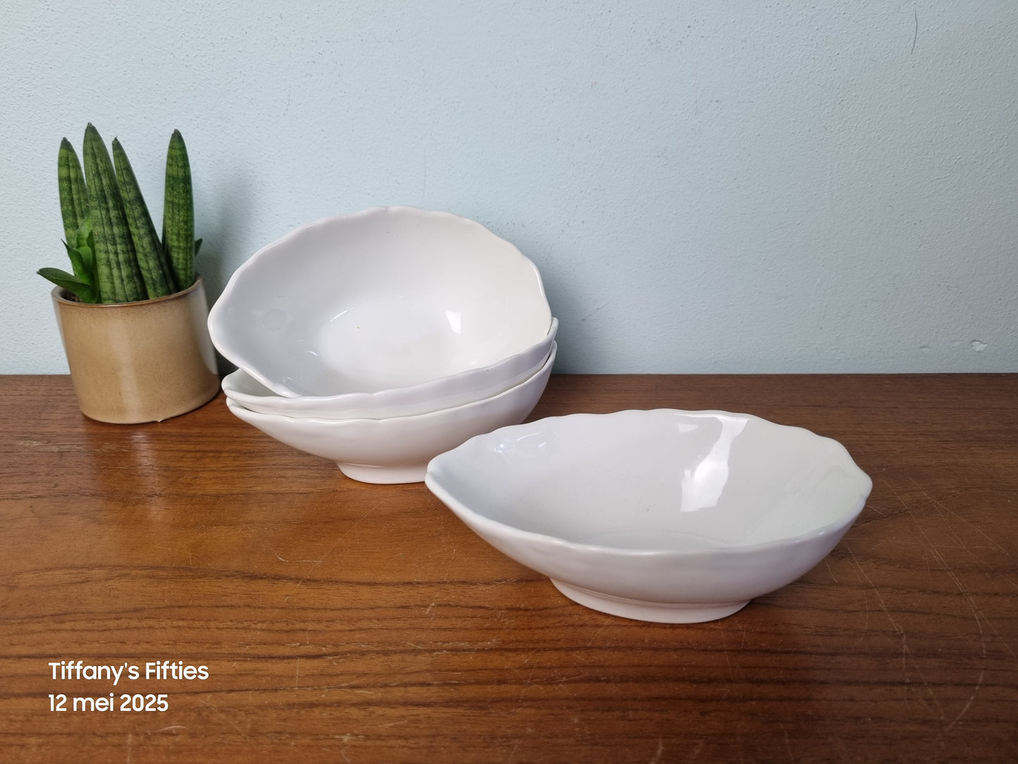 Leuke witte snackschaaltjes met gegolfd randje. Er zijn wat gebruiksporen zichtbaar. Afmetingen 15 x 9.5 x 5 cm.
