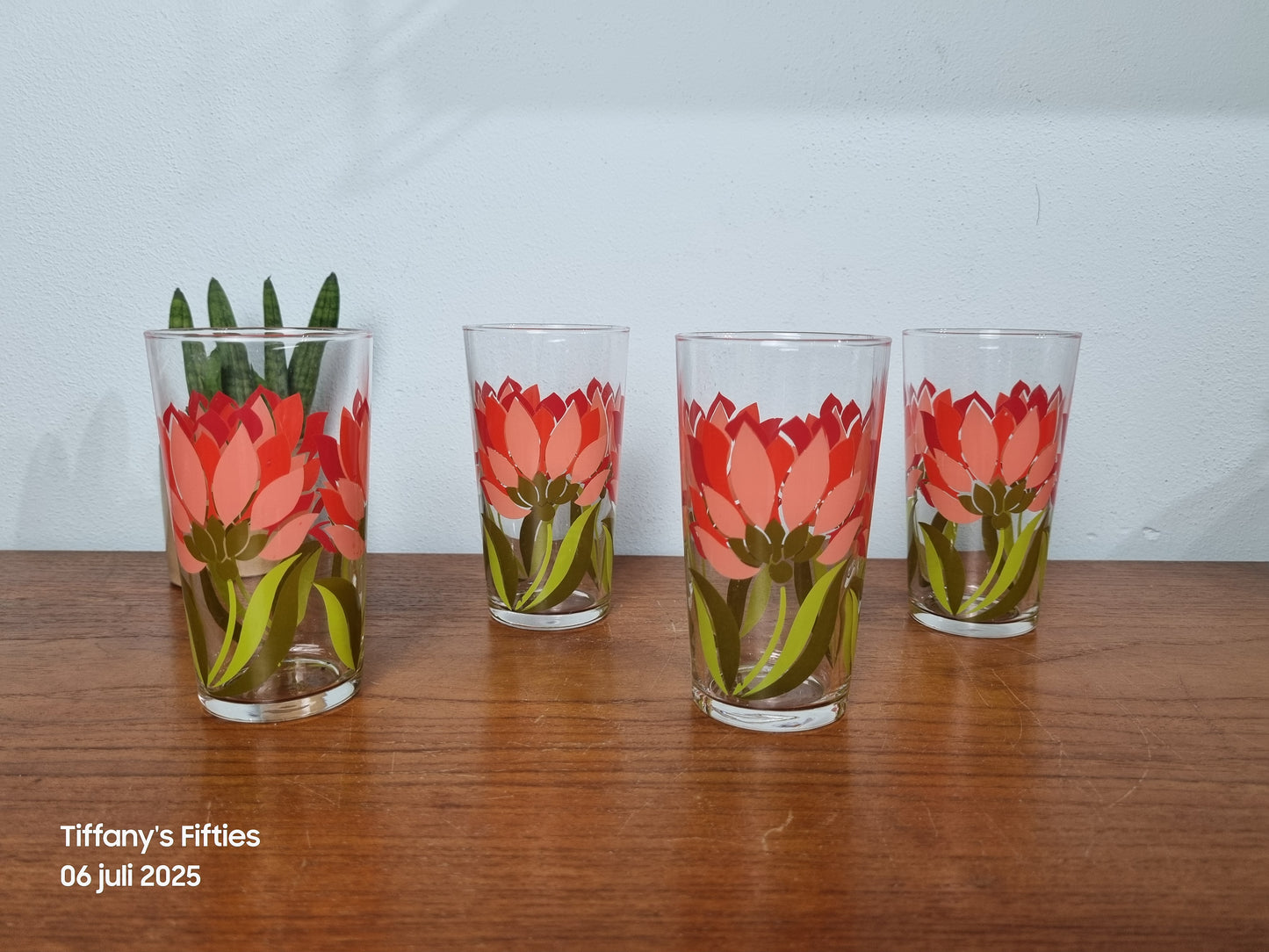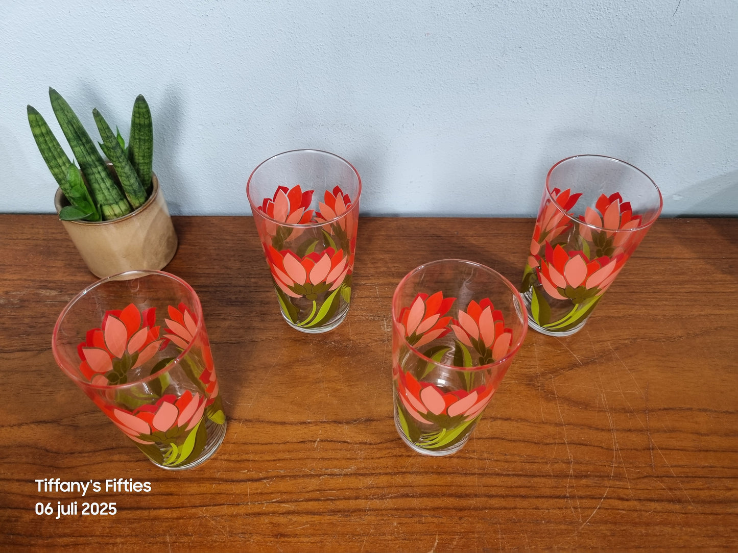 Set 4 vintage glazen - rood-oranje bloemenprint