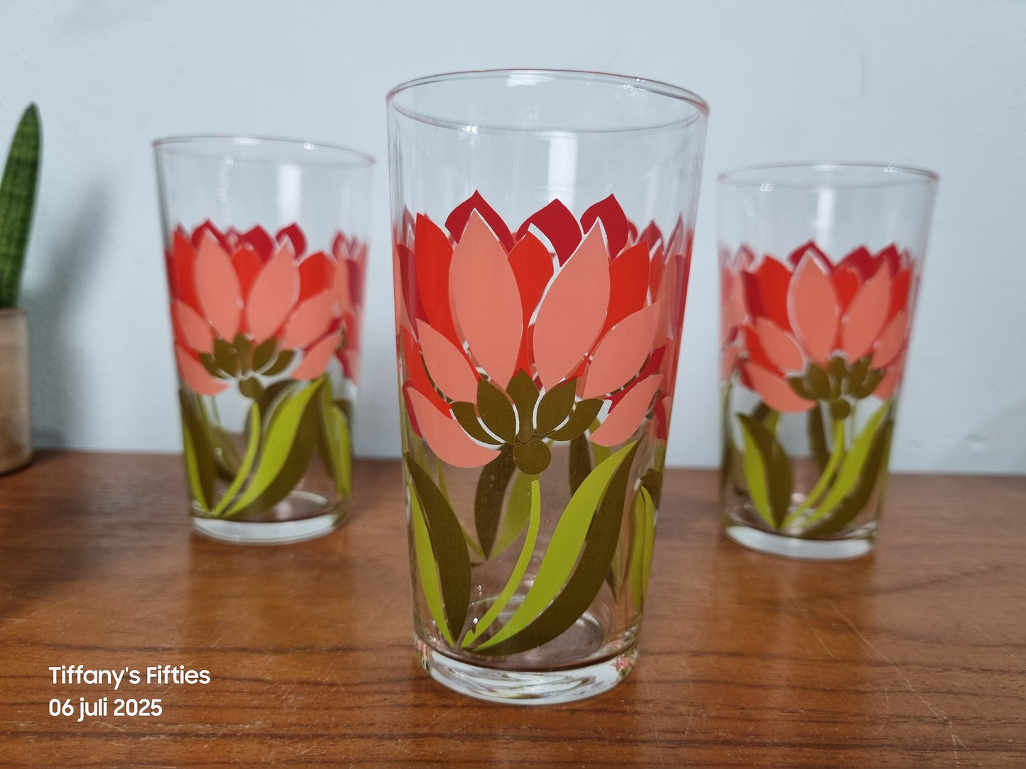 Deze vrolijke drinkglazen brengen instant kleur op tafel met hun opvallende bloemendecor in warme oranjerode tinten en frisgroene bladeren. De bloempatronen zijn rondom met zorg op het glas aangebracht, wat elk exemplaar een speelse, grafische uitstraling geeft die typisch is voor de jaren ’60-’70.