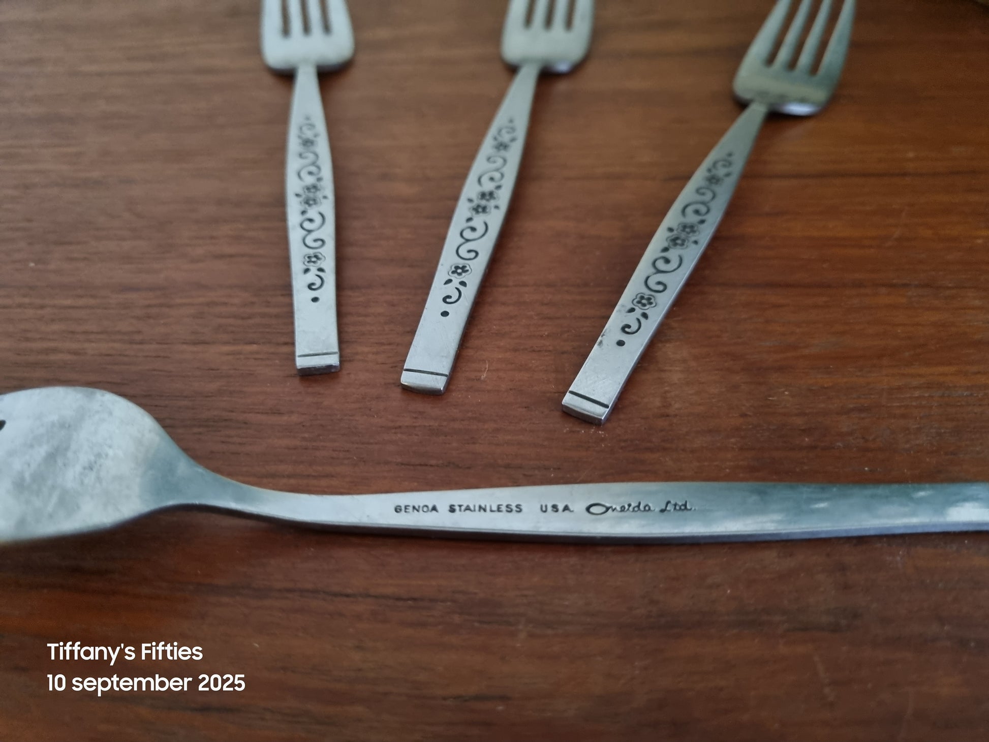 Bestek van Oneida Ltd., USA, type Genoa Stainless. Gemaakt van roestvrij staal met een sierlijk ingegraveerd bloem- en krulmotief op de heften. Dit model is typisch voor de jaren ’60-’70 en combineert duurzaamheid met een elegante retro-uitstraling.