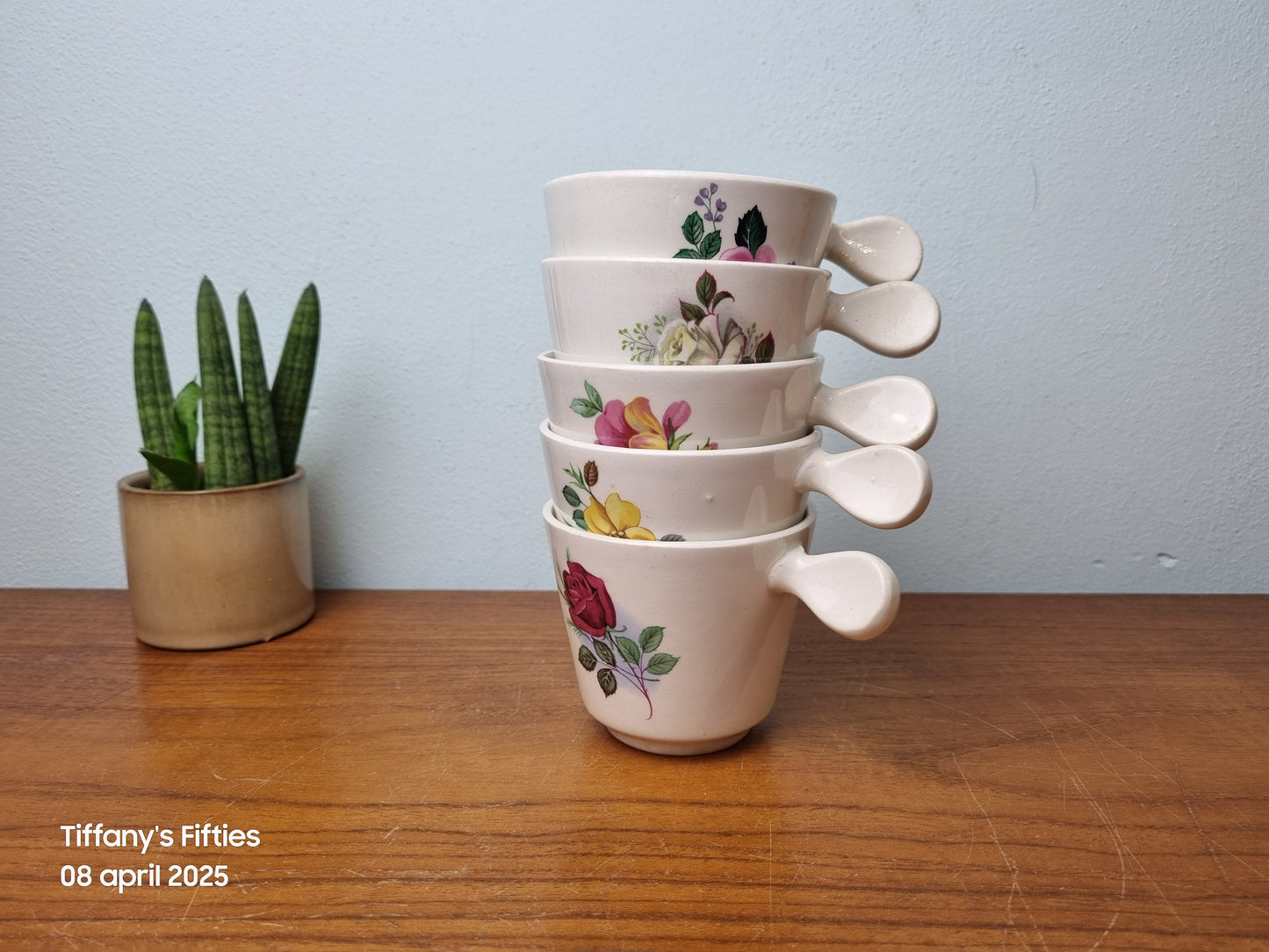 Vrolijke set van vijf vintage kopjes van Boch La Louvière, vorm Compact, elk voorzien van een ander bloemenmotief uit de reeks ‘Serie de 6 Fleurs’. De diverse florale decoraties in zachte kleuren geven de set een charmante, licht nostalgische uitstraling.
