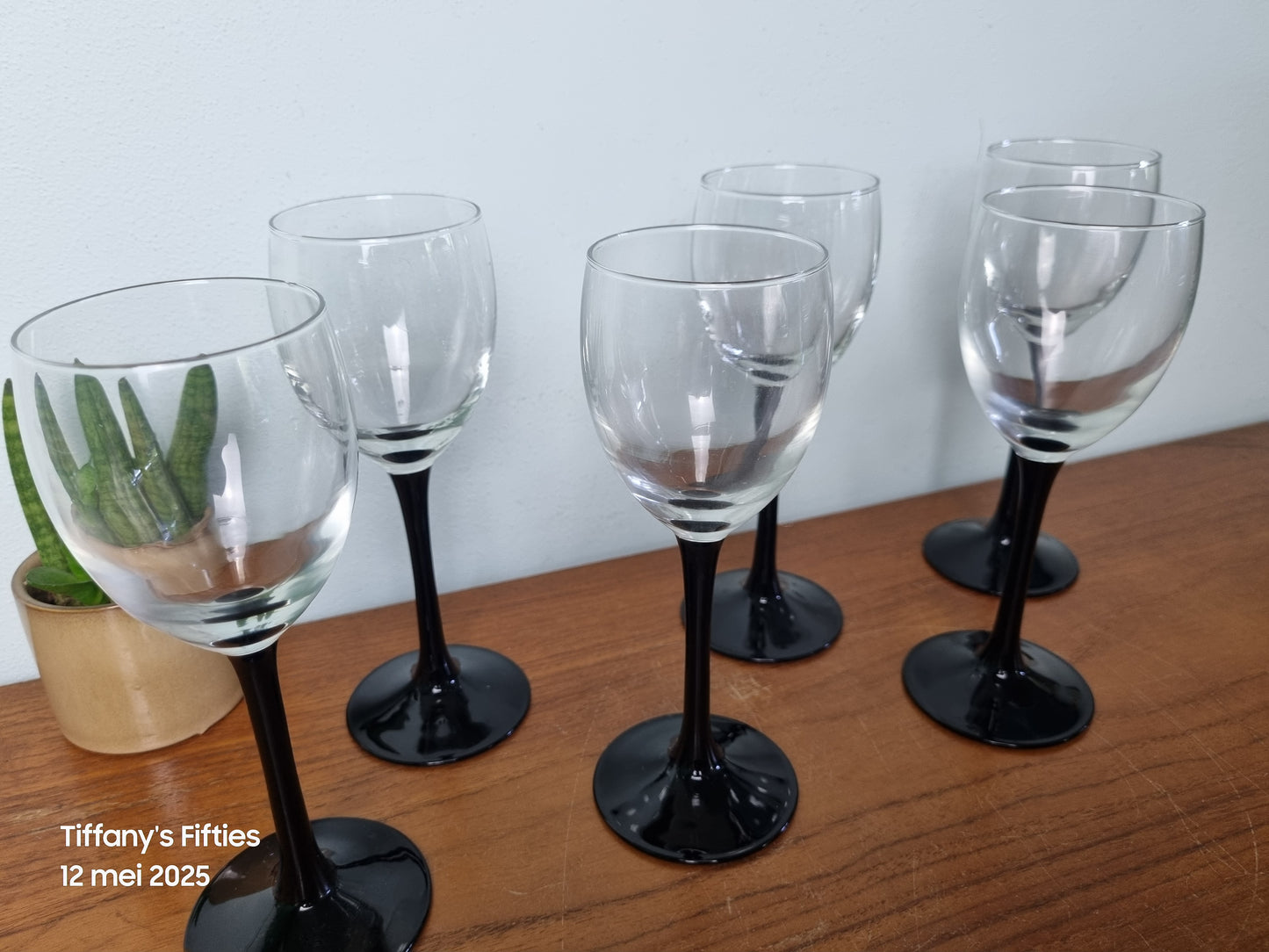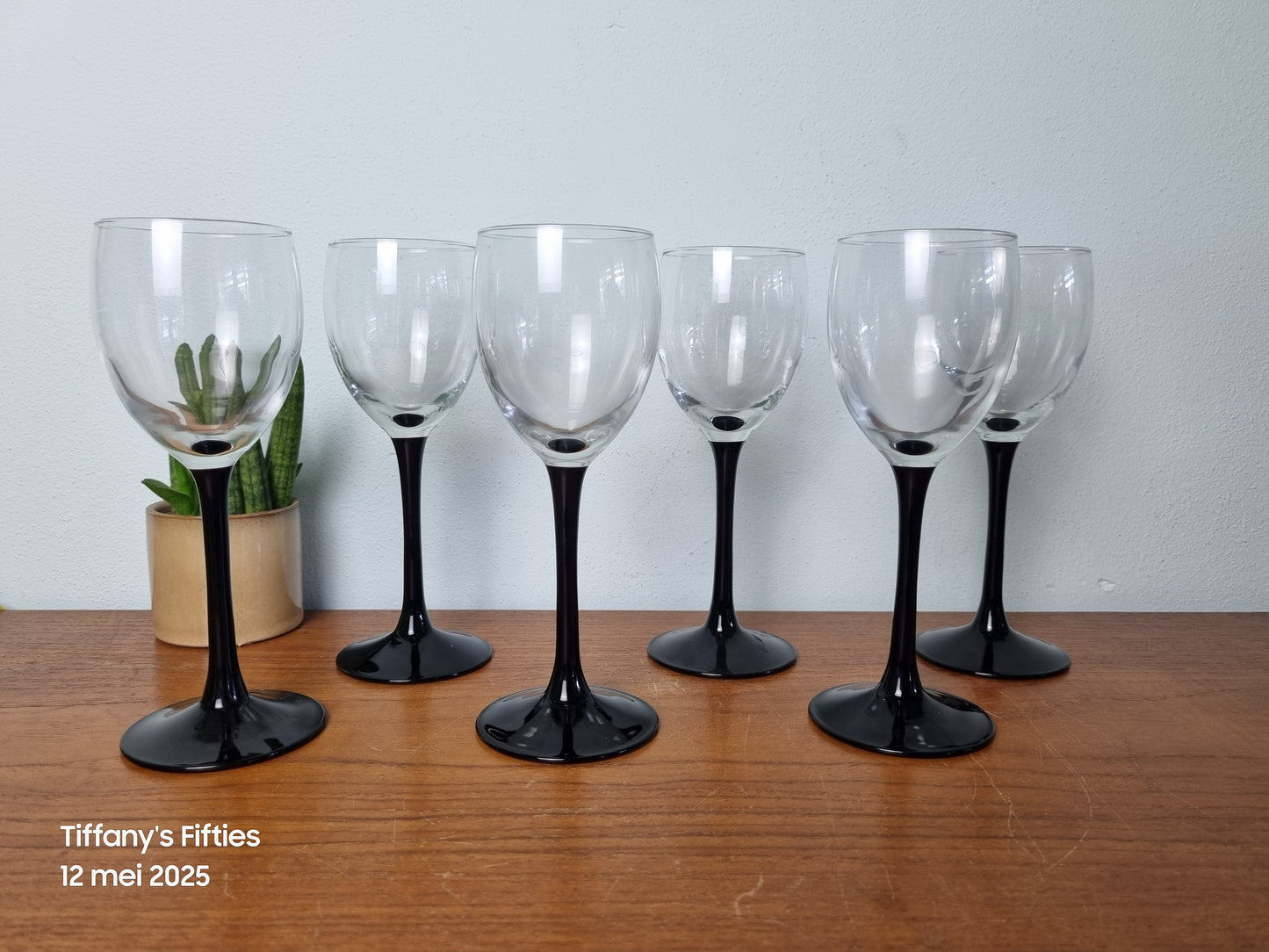 Set van 6 vintage wijn glazen van Luminarc Domino met zwarte voet. Deze zijn echt een aanwinst voor een mooie opgedekte tafel in een vintage of design interieur. Diameter 6 cm, hoogte 19 cm, glas 8 cm.