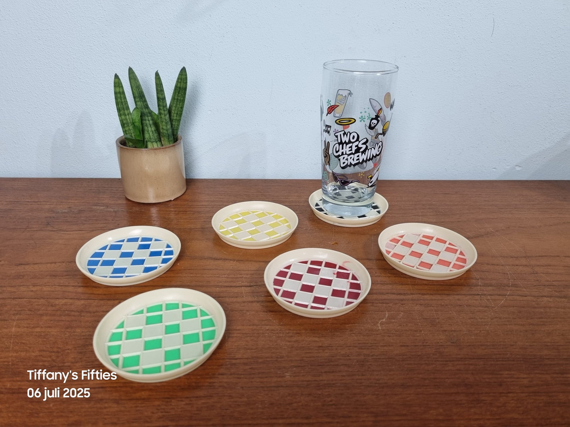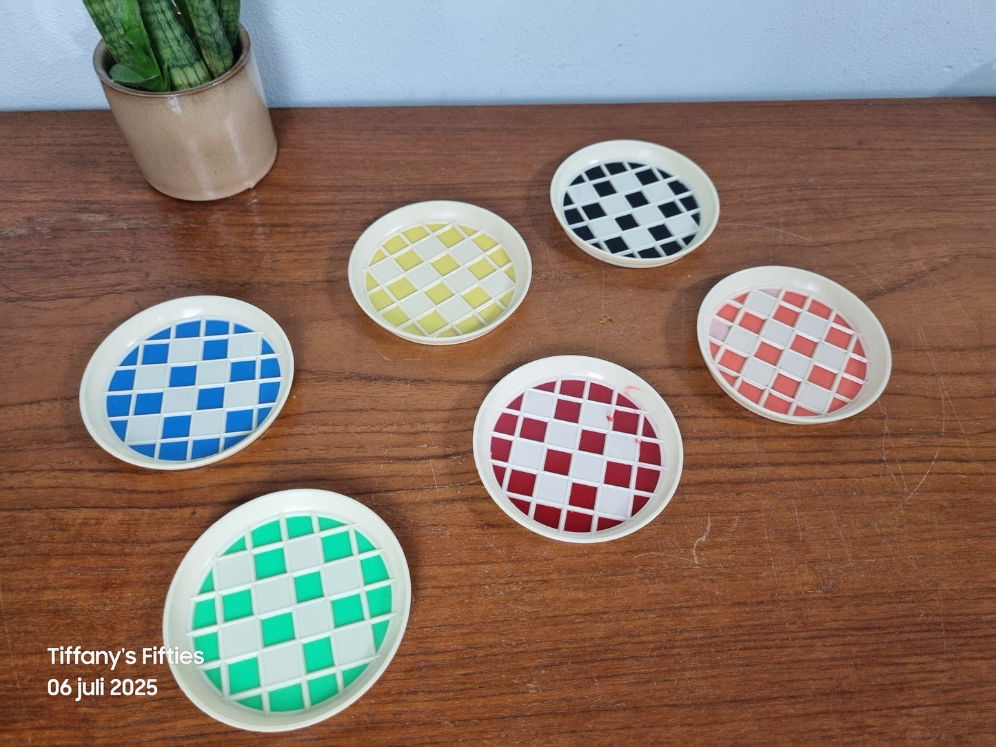 Deze vrolijke set vintage kunststof onderzetters uit de jaren ’60-’70 brengt direct kleur en speelsheid op tafel. De ronde vorm en het geometrische ruitmotief in contrasterende kleuren geven elke onderzetter een uitgesproken retrolook. De set bestaat uit zes stuks in frisse tinten: rood, blauw, geel, groen, zwart en oranje — allemaal met een crèmekleurige rand.