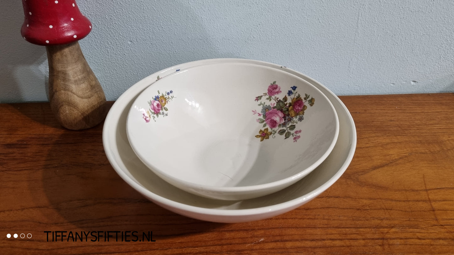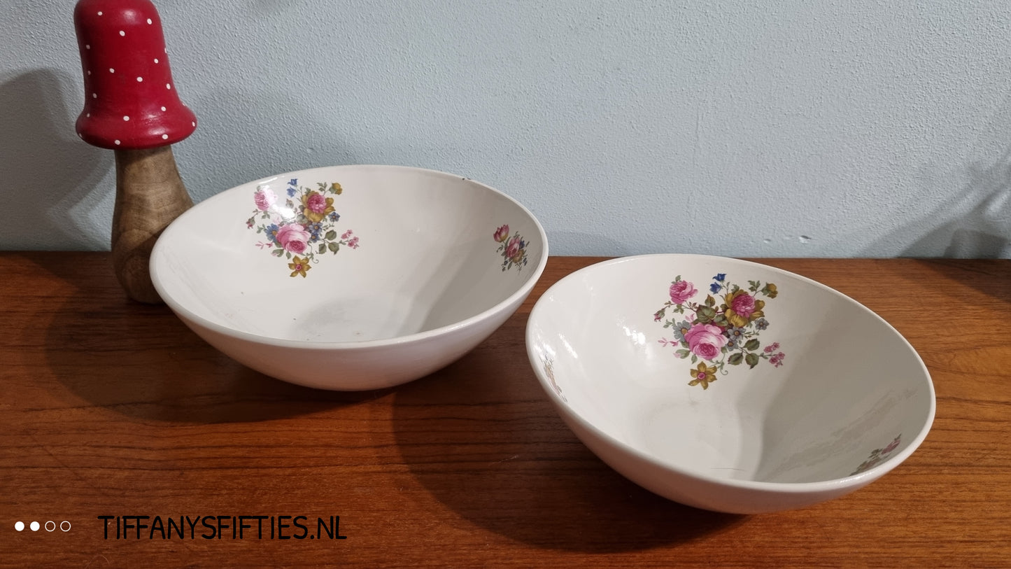 2 slaschalen van Boch vorm Saturn uit 1958 met transfer bloemendecor genaamd Tatiana. Beide schalen zijn in prima staat. Tekening kan vervaging door langdurig gebruik, niet aan te raden in de vaatwasser te zetten.