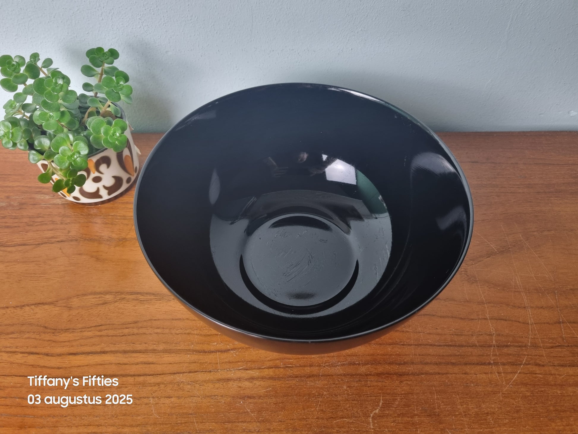 Grote kom, vermoedelijk van Arcoroc France maar ongemerkt, uitgevoerd in zwart glas. Strakke, ronde vormgeving met een minimalistische uitstraling, typisch voor de jaren ’80 stijl van Arcoroc.