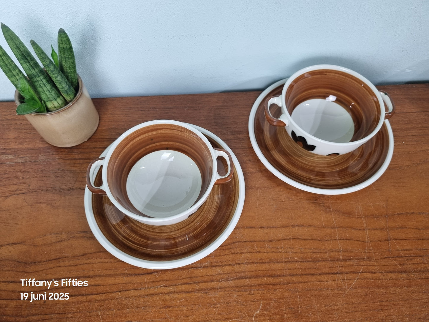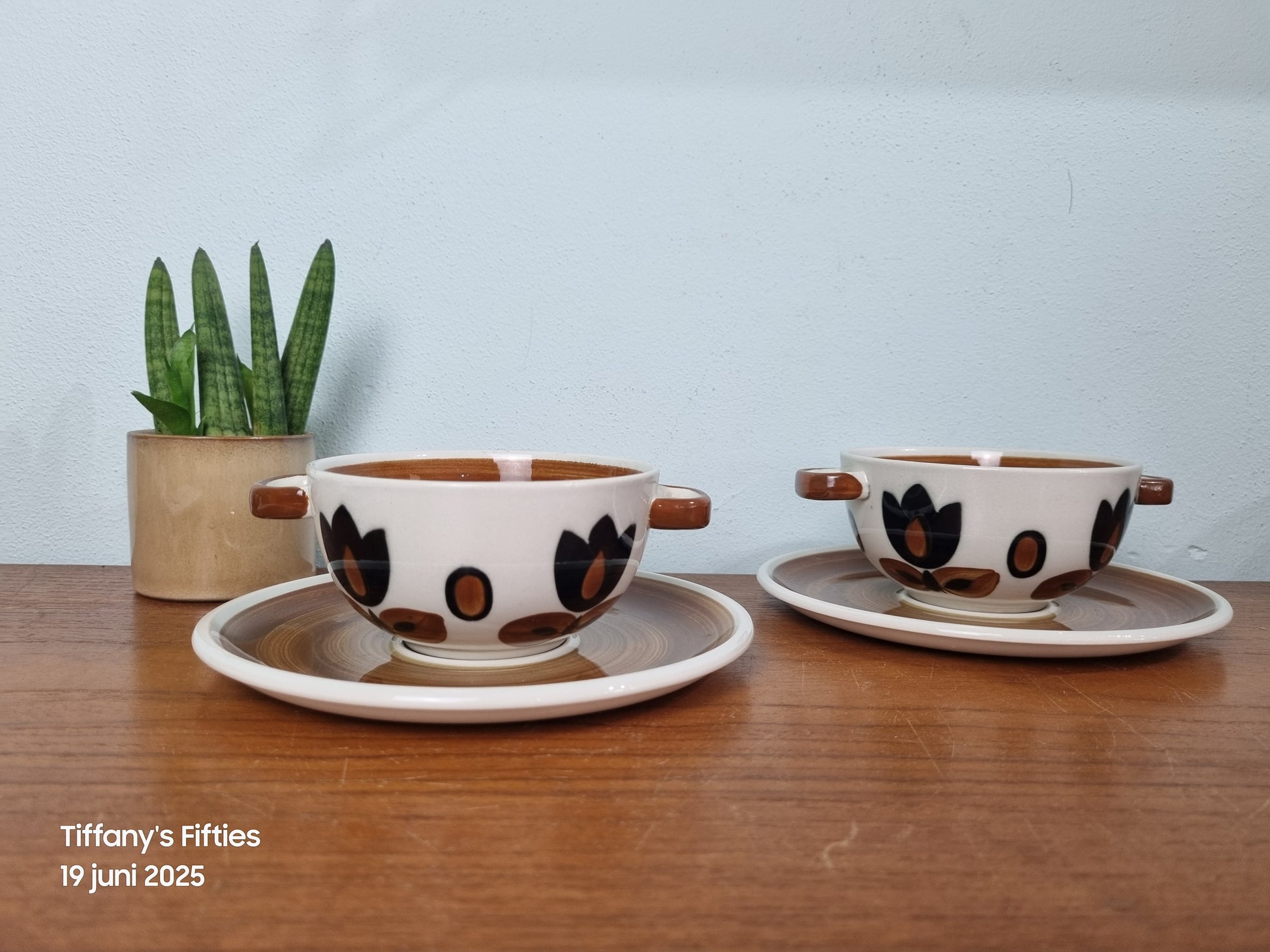 De warme aardetinten van bruin, zwart en oranjebruin vormen een expressief bloemendessin op een crèmekleurige basis, kenmerkend voor het Kimono-servies uit de jaren ’70. De binnenzijde van de kommen en de schotels zijn afgewerkt met een spiraalvormig penseelpatroon, wat elke set een uniek karakter geeft. De dubbele oorhandvatten versterken de charmante retro-uitstraling en zorgen voor een praktisch gebruik.