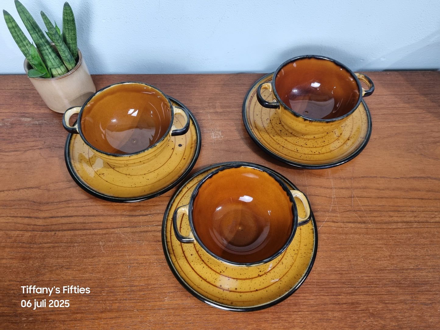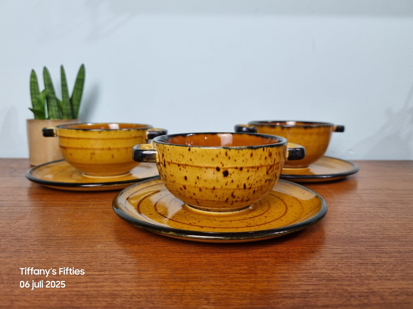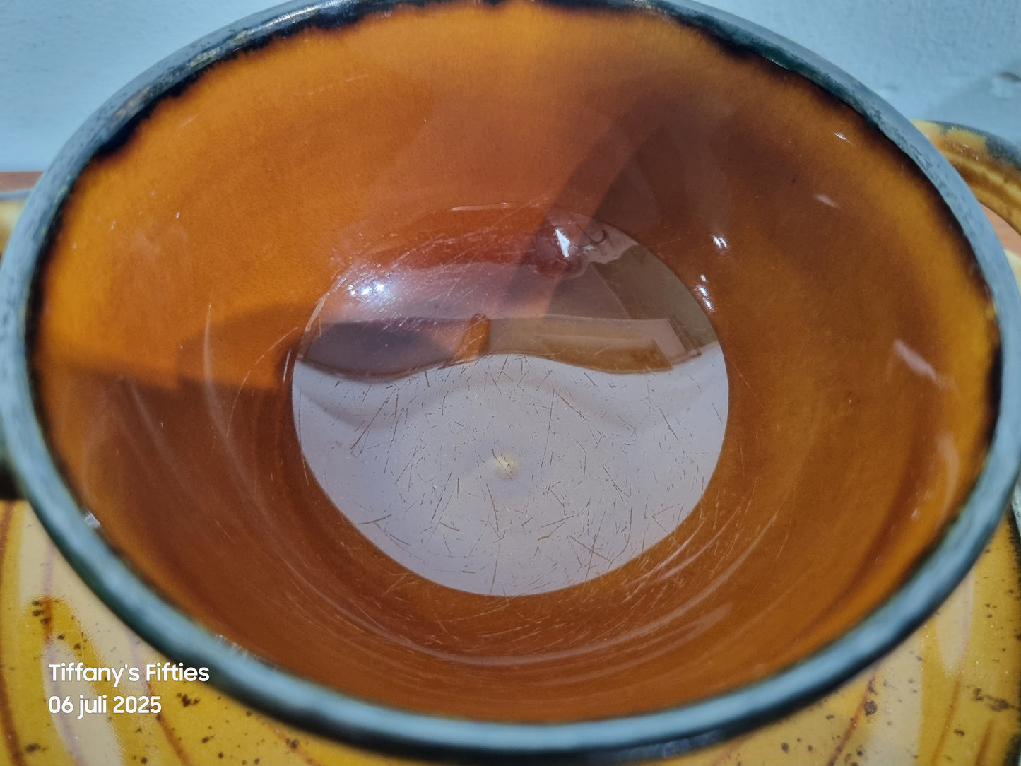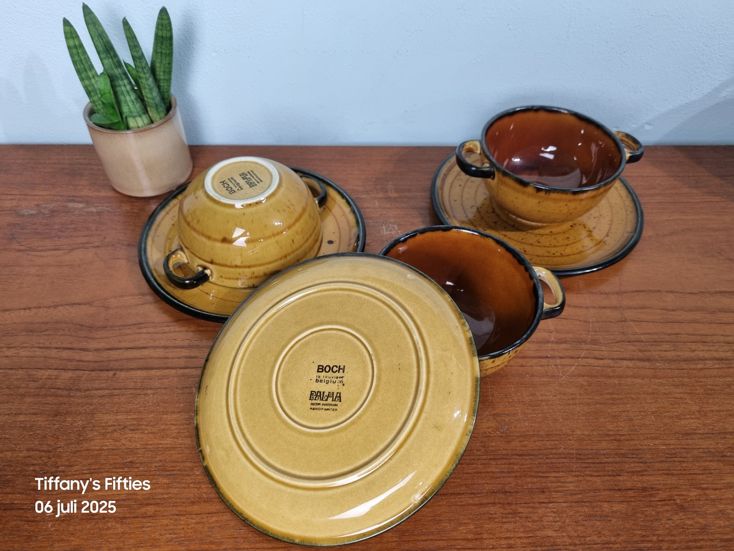 Deze rustieke soepkommen met bijpassende schotels van Boch La Louvière zijn uitgevoerd in het Palma-decor: een warme geelbruine glazuur met spikkels en donkere randen, afgewerkt met een diep glanzende binnenzijde in kastanjebruin. De dubbele oortjes en het speelse lijnenspel in het glazuur geven dit servies een uitgesproken retro-uitstraling uit de jaren ’70.