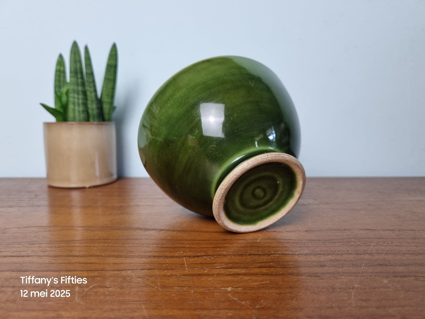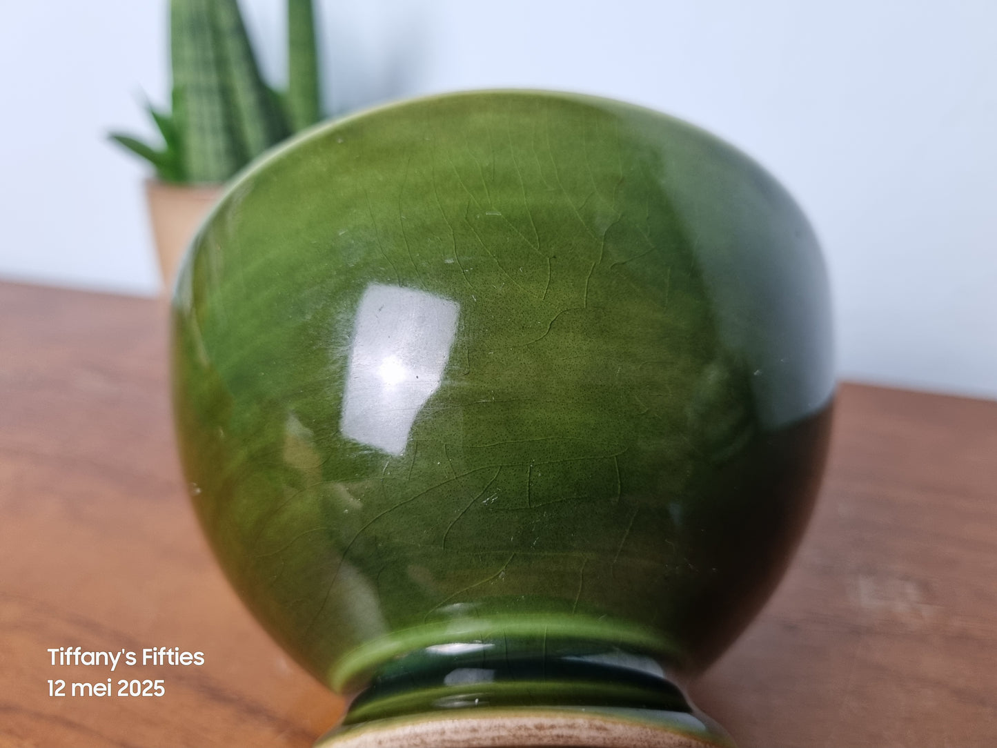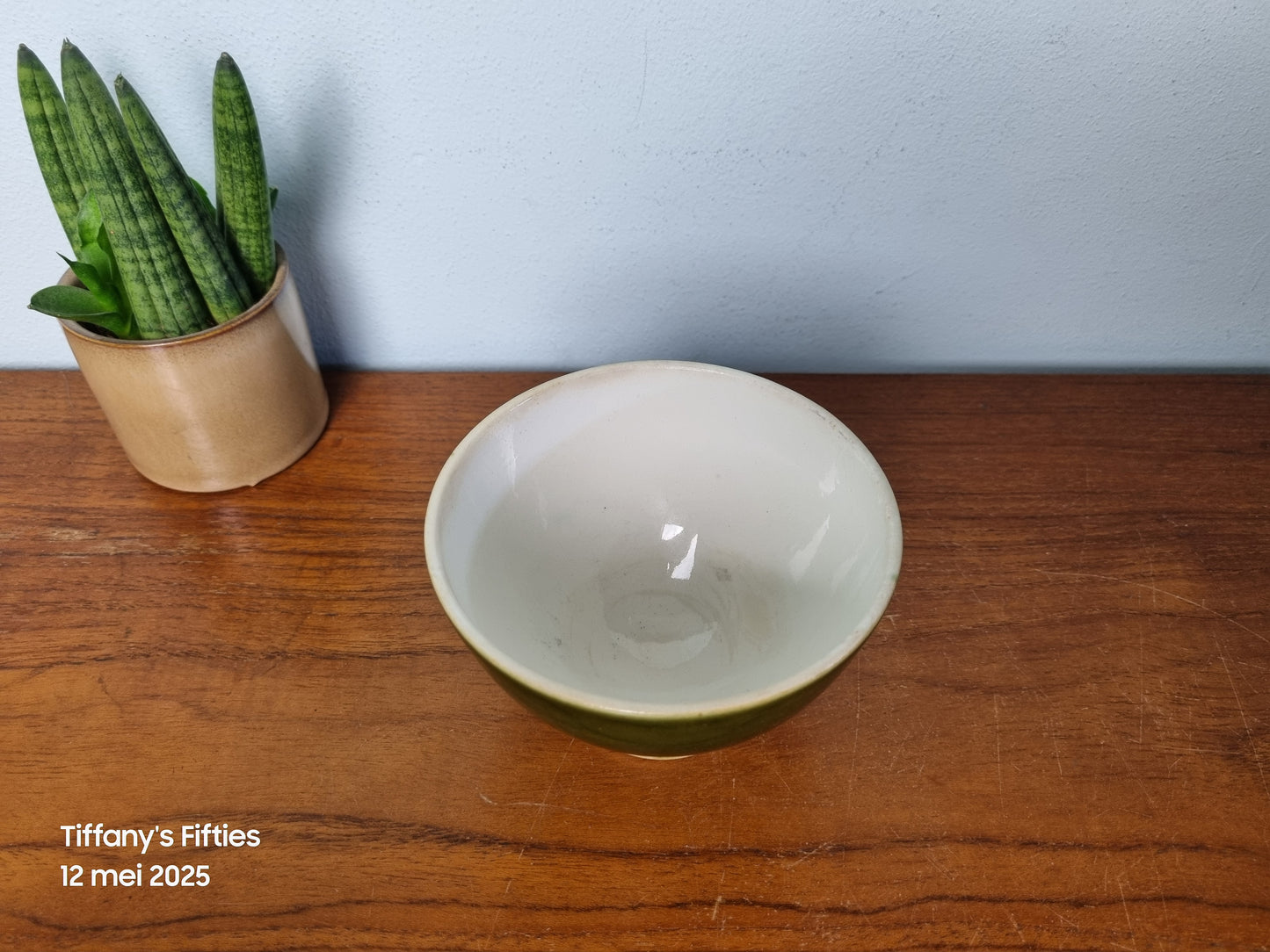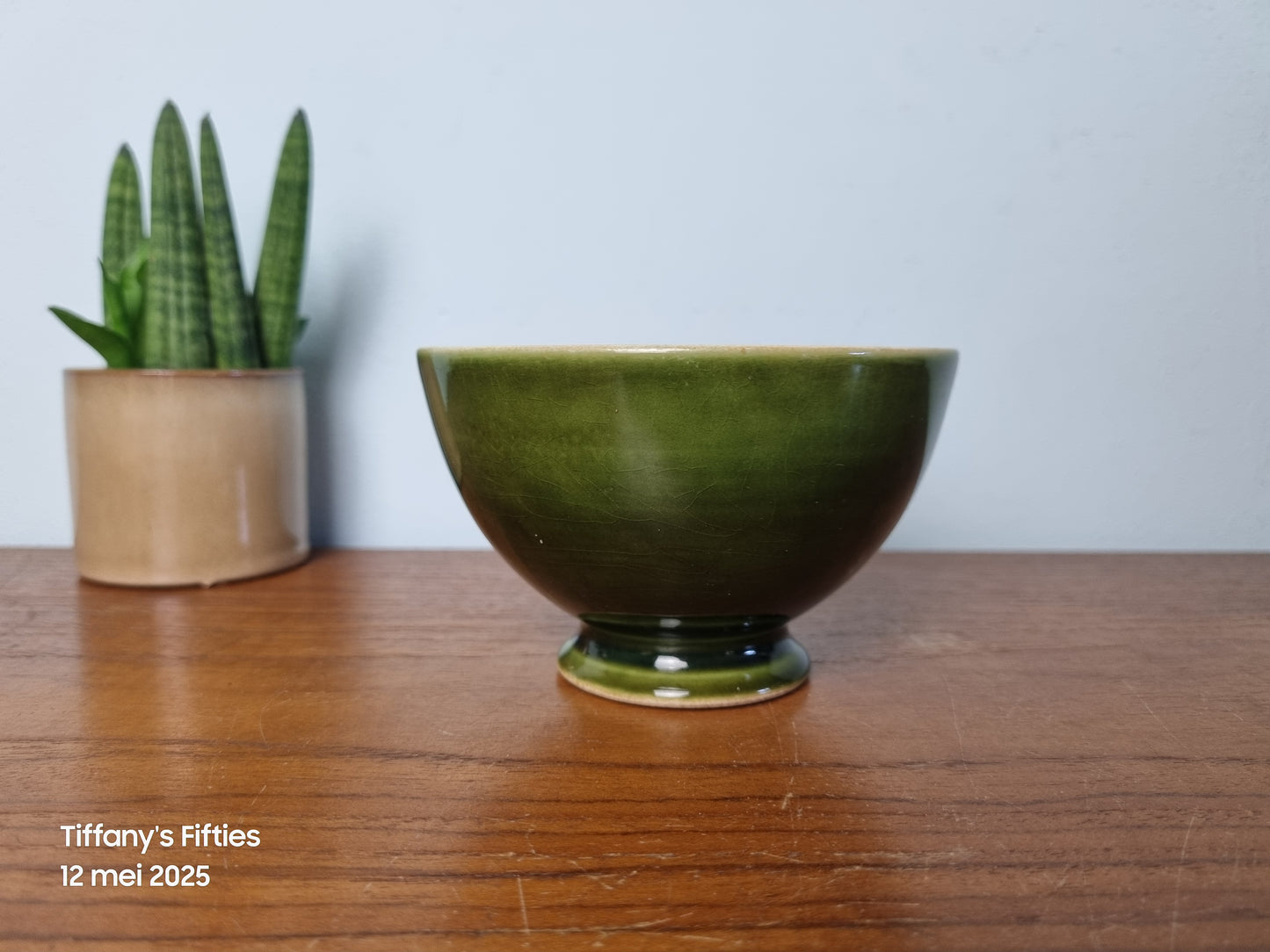 Mooie spoelkom van Boch La Louviere in donkergroen, decor genaamd Vert Imperial. Er zijn wat gebruiksporen en enkele lijntjes craquelee zichtbaar. Het kommetje is ongemerkt. Diameter 11 cm, hoogte 7 cm.