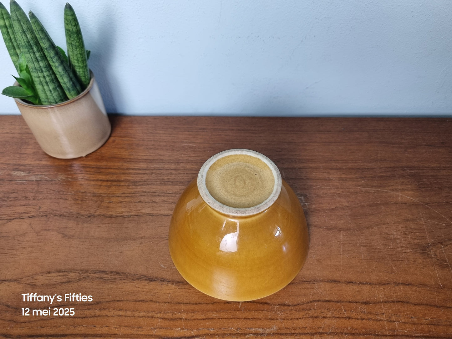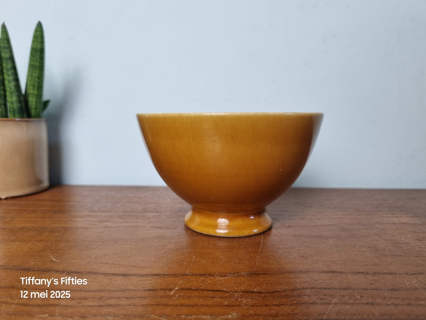 Mooie spoelkom van Boch La Louviere in oker of karamel kleur, decor genaamd Soleil. Er zijn wat minimale vlekjes op de rand zichtbaar. Het kommetje is ongemerkt. Diameter 11 cm, hoogte 7 cm.