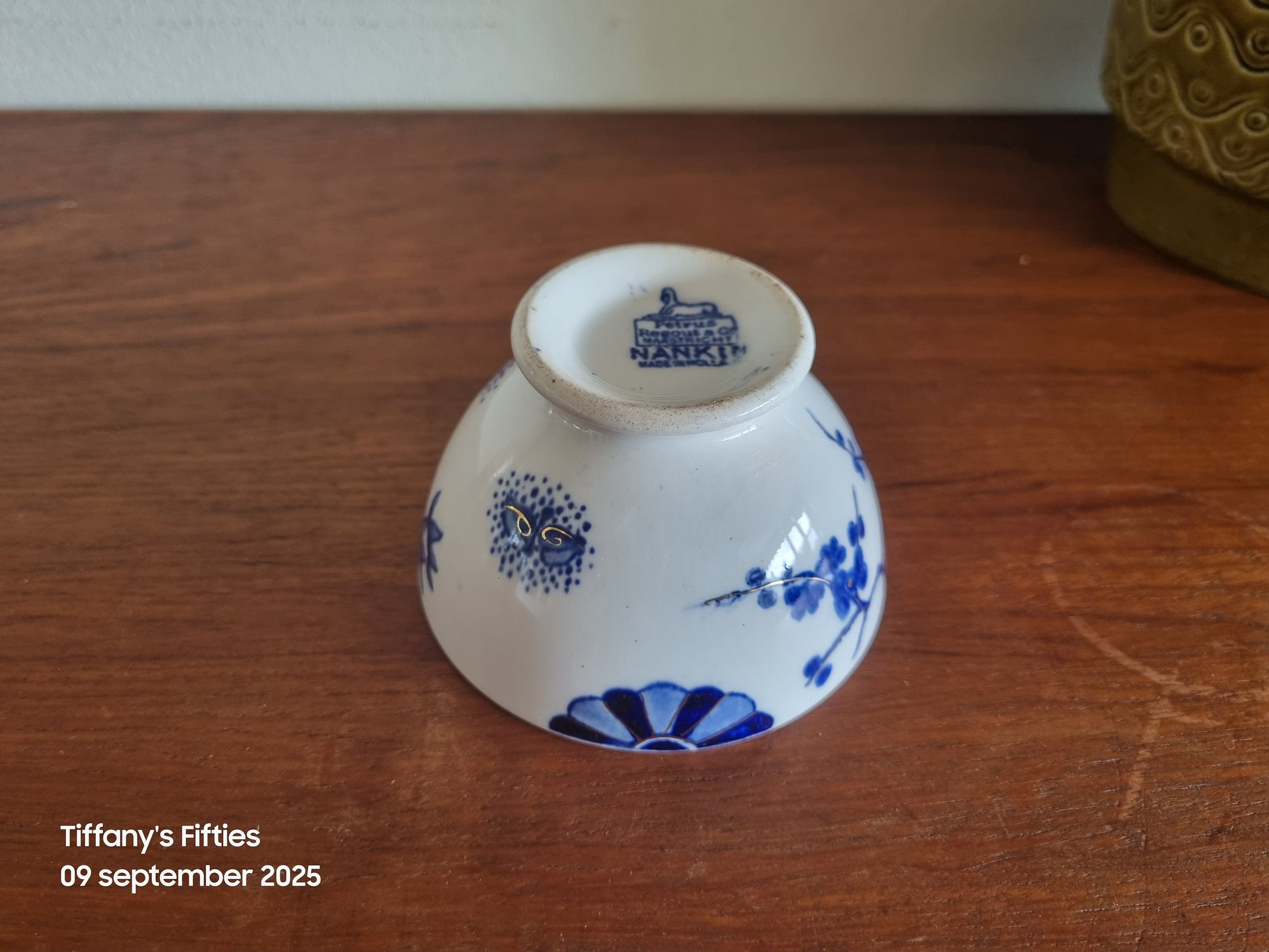 Kommetje van Petrus Regout Maastricht, decor Nankin, in wit aardewerk met een klassiek blauw decor van bloesemtakken en bloemen. Zowel de buitenzijde als de binnenrand zijn gedecoreerd in fijne blauwe transferprint, typisch voor het 19e-eeuwse Chinese geïnspireerde servies van Petrus Regout.